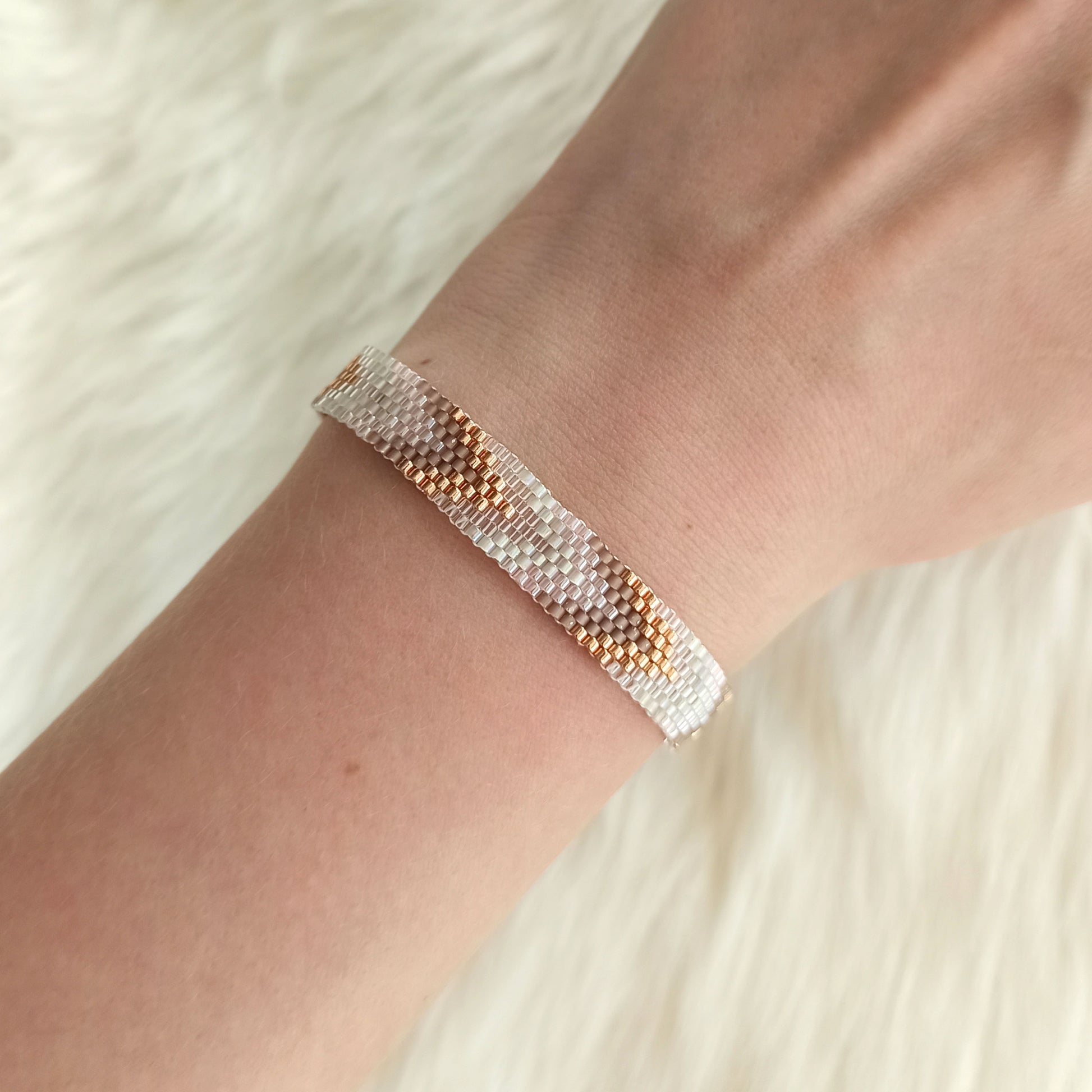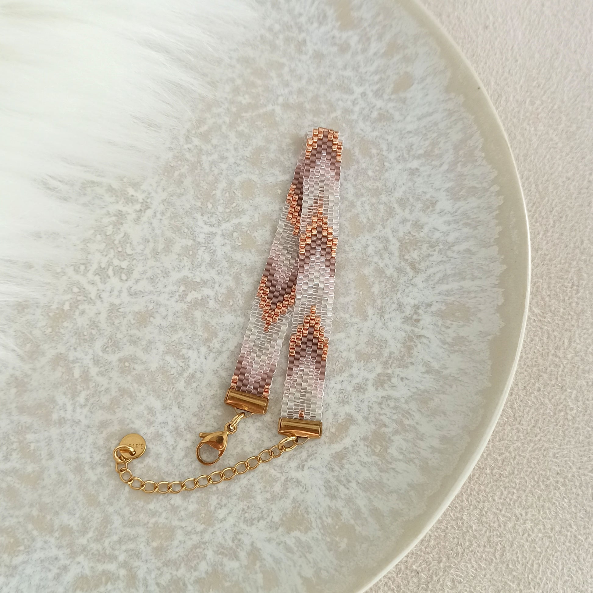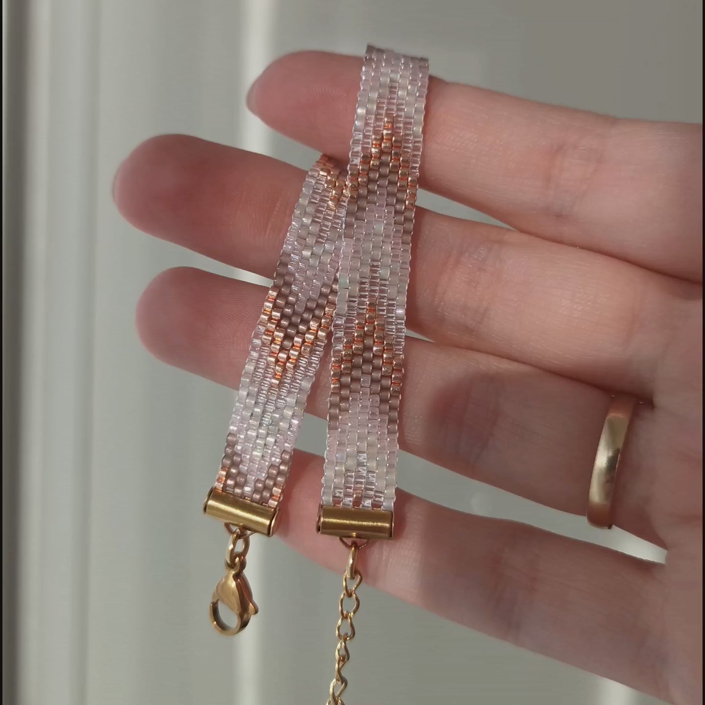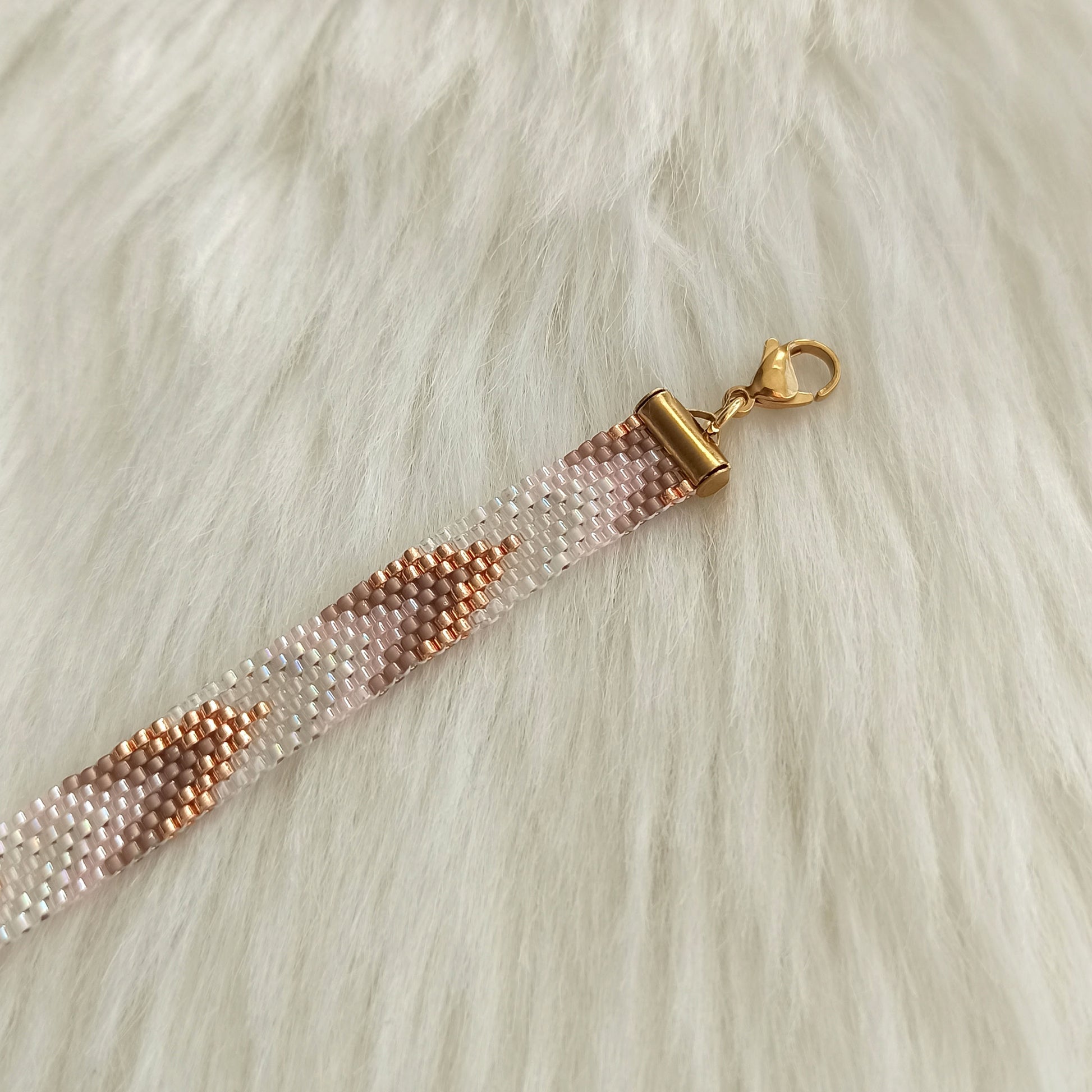 Elegantní náramek s jemným barevným přechodem v odstínech růžového zlata, vyrobený z kvalitních japonských korálků se stálým povrchem.