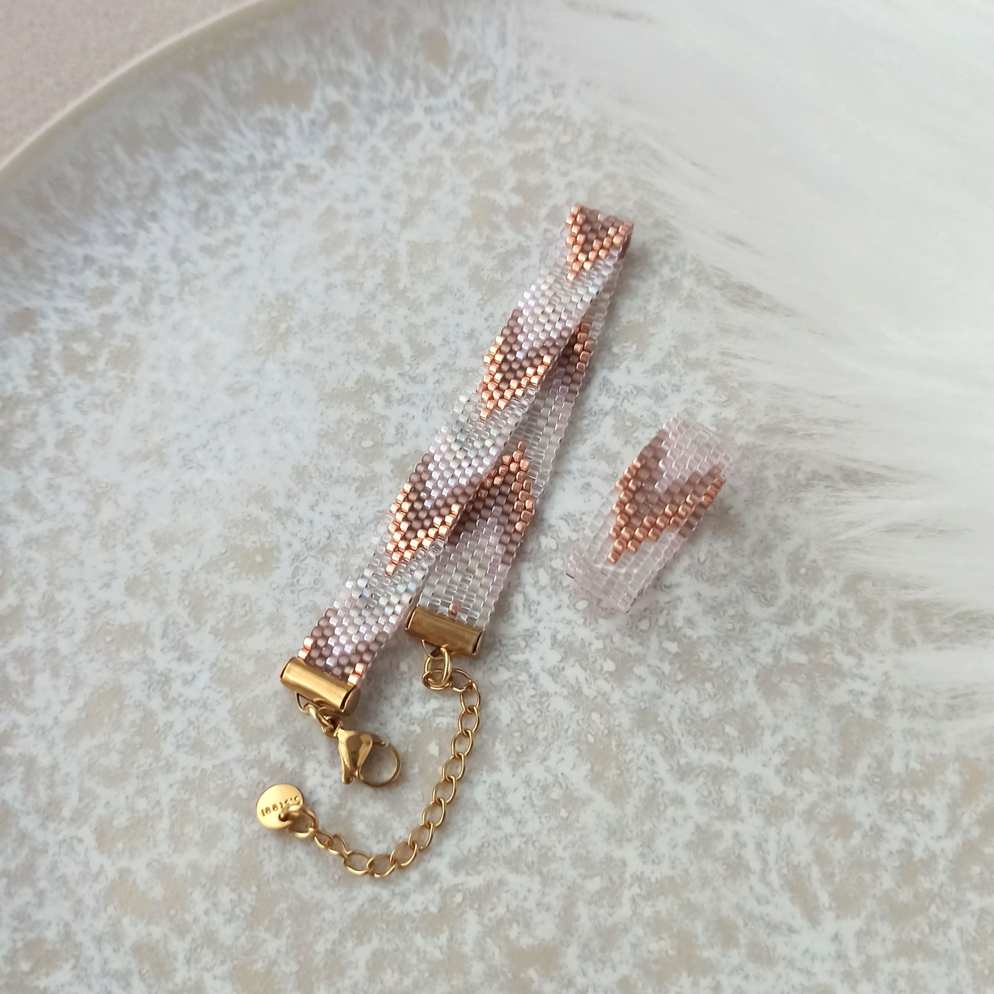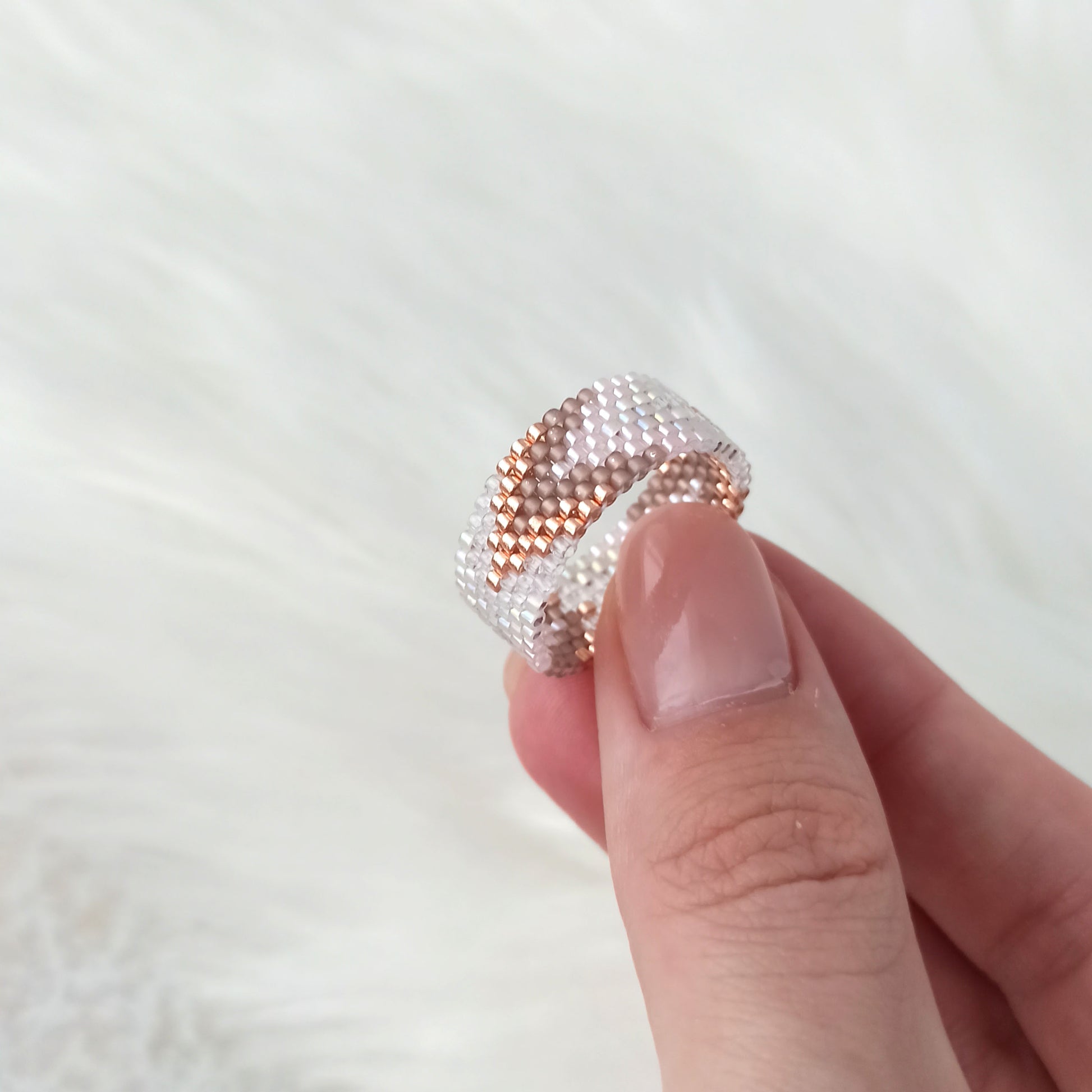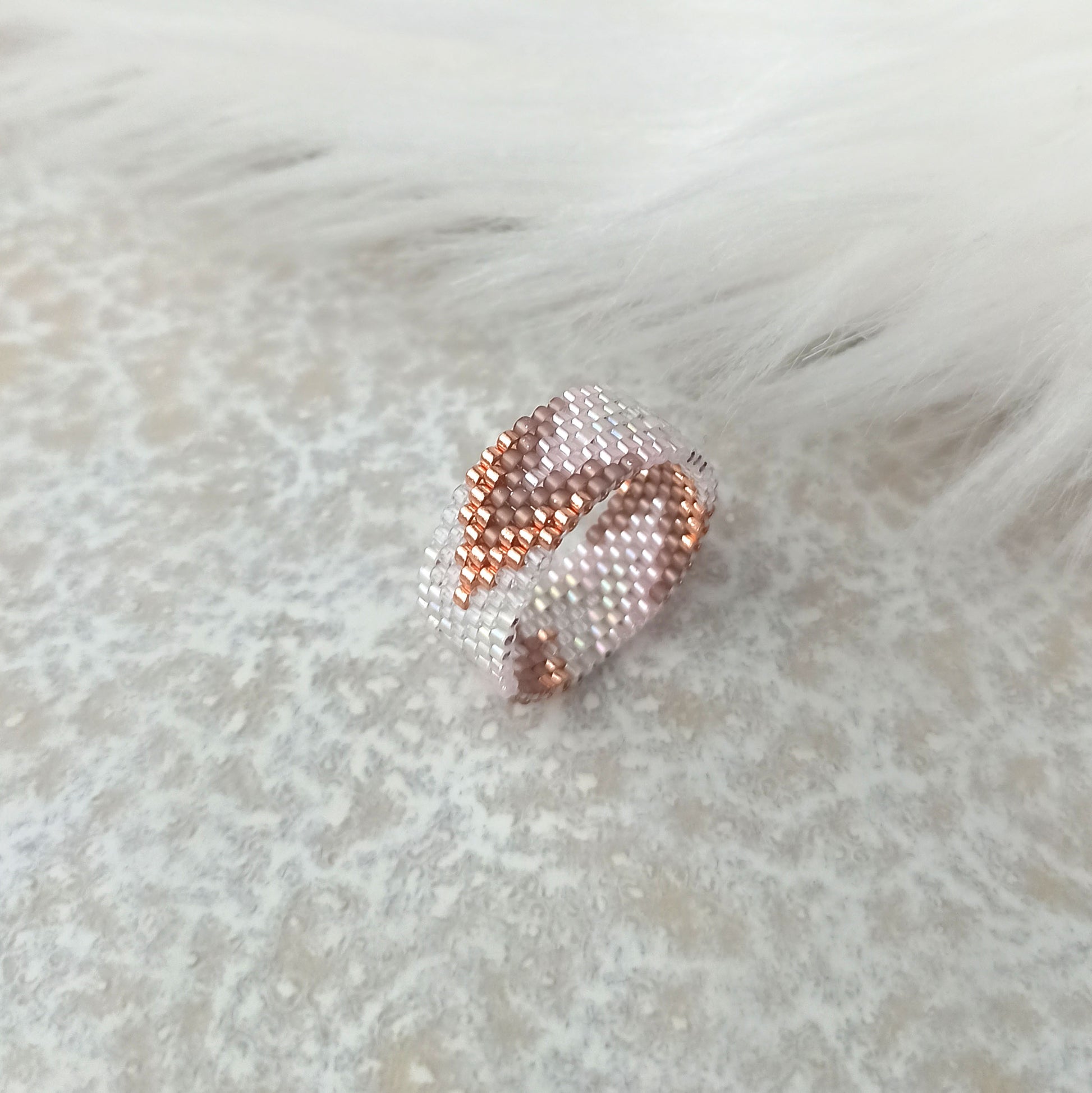 Jemný prstýnek s elegantním barevným přechodem v odstínech růžového zlata, vyrobený z kvalitních japonských korálků se stálým povrchem.