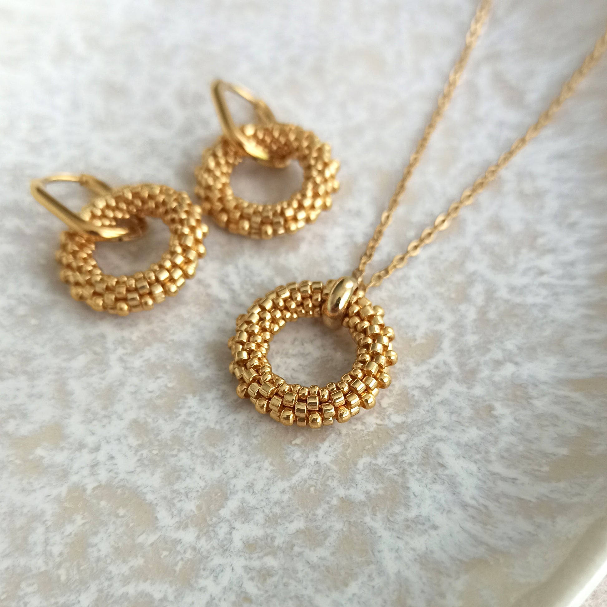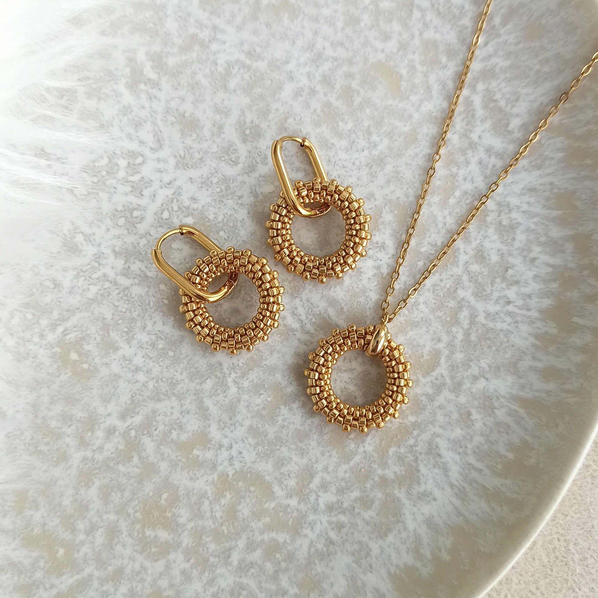 Minimalistický set šperků ve zlatém provedení se skládá z náušnic a přívěsku v „ažurovém“ stylu o průměru 19 mm.