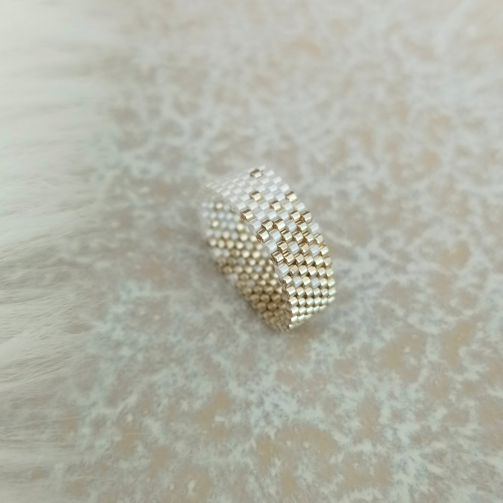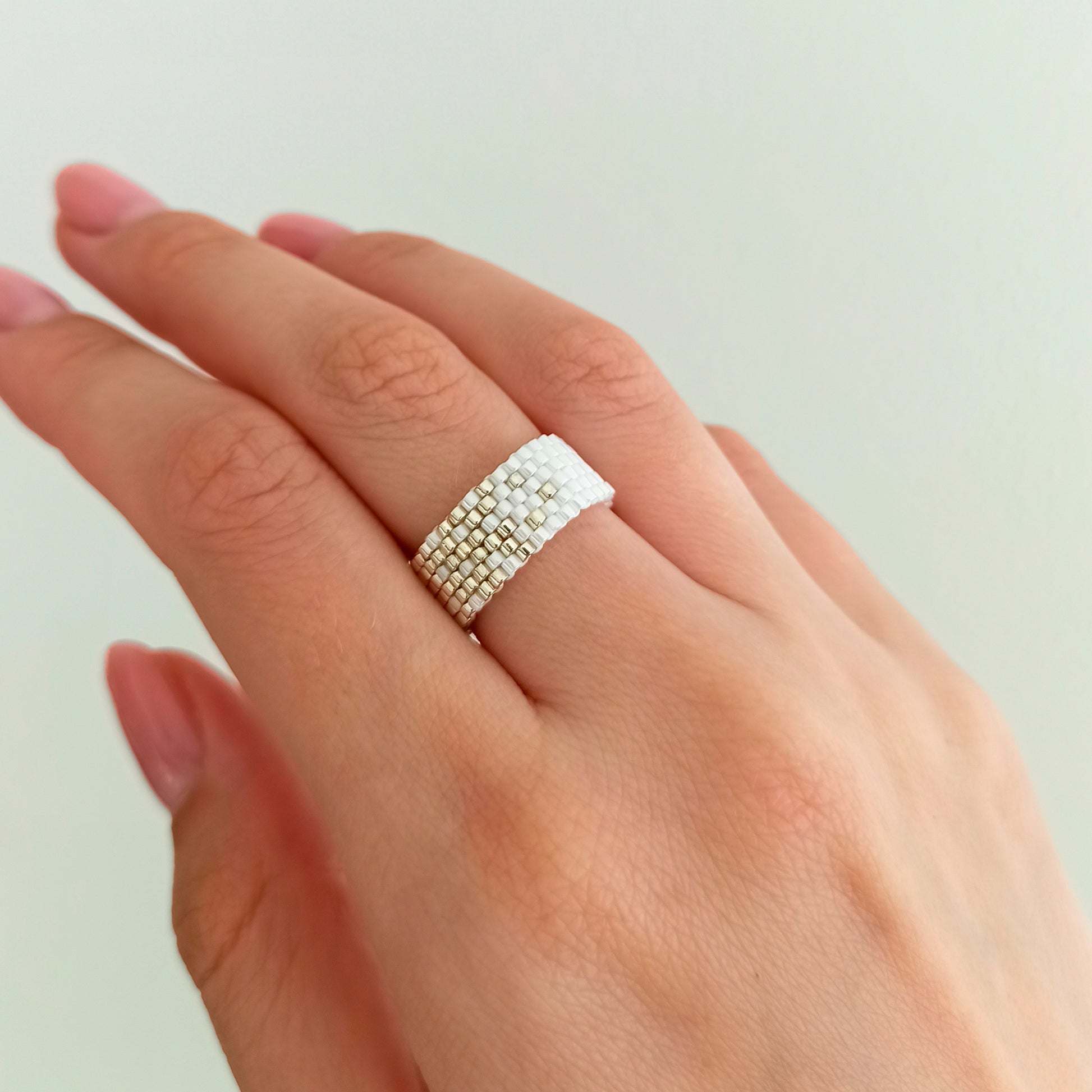 Ručně vyrobený prstýnek s jemným přechodem mezi bílou a stříbrnou barvou z vysoce kvalitního japonského rokajlu s odolným povrchem.