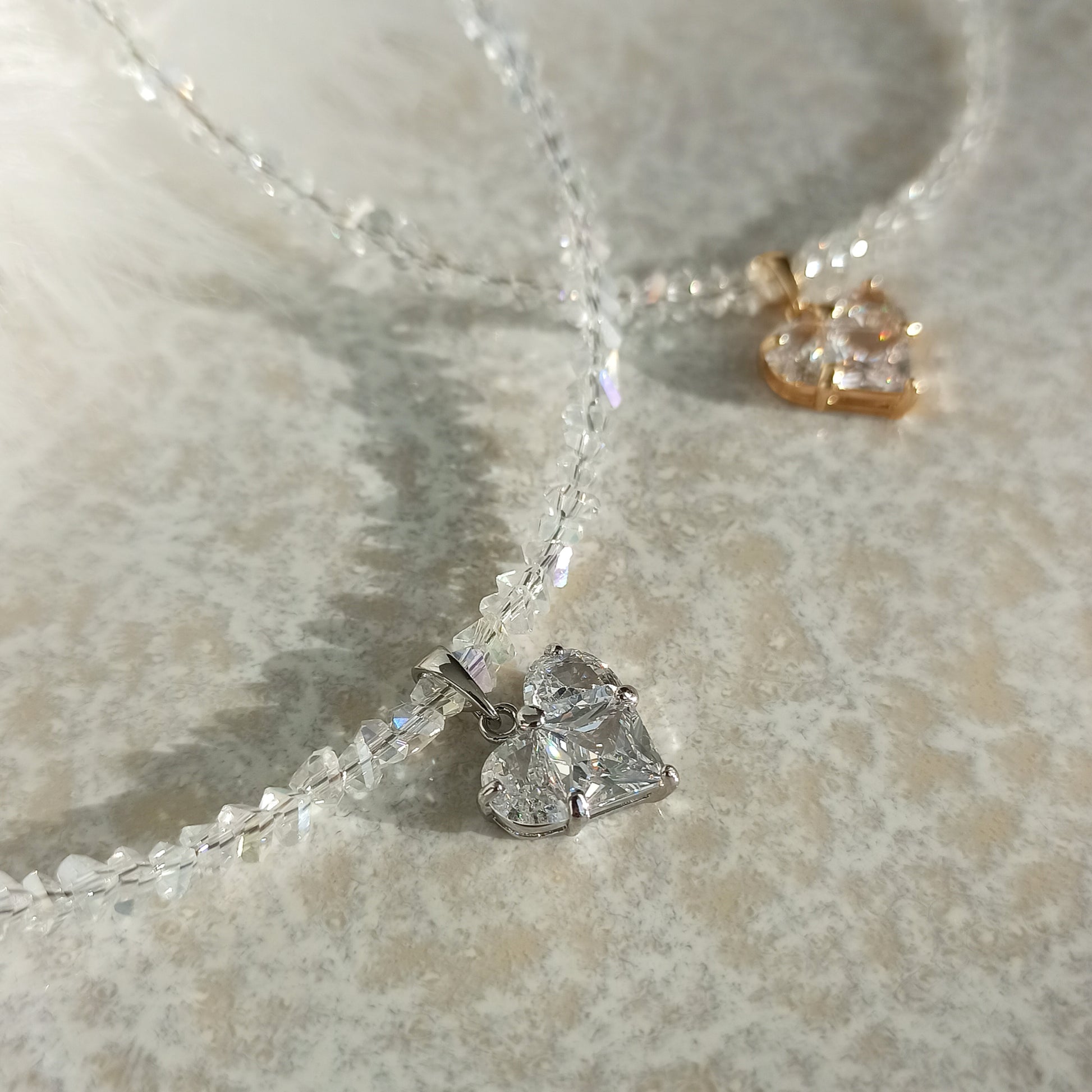 Jedná se o galvanizované skleněné korálky s AB (duhovým) povrchem. Přívěsek je z mosazi s kubickým zirkonem, neobsahuje nikl a má povrchovou úpravu ze skutečného 18karátového zlata.