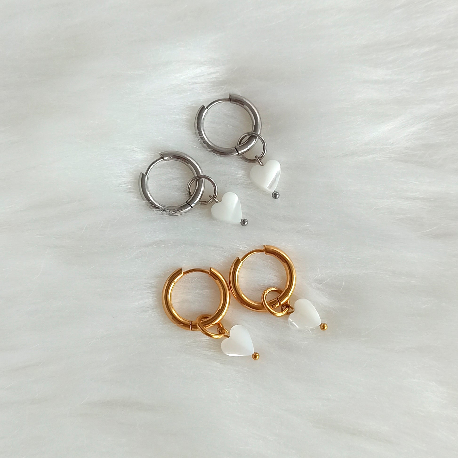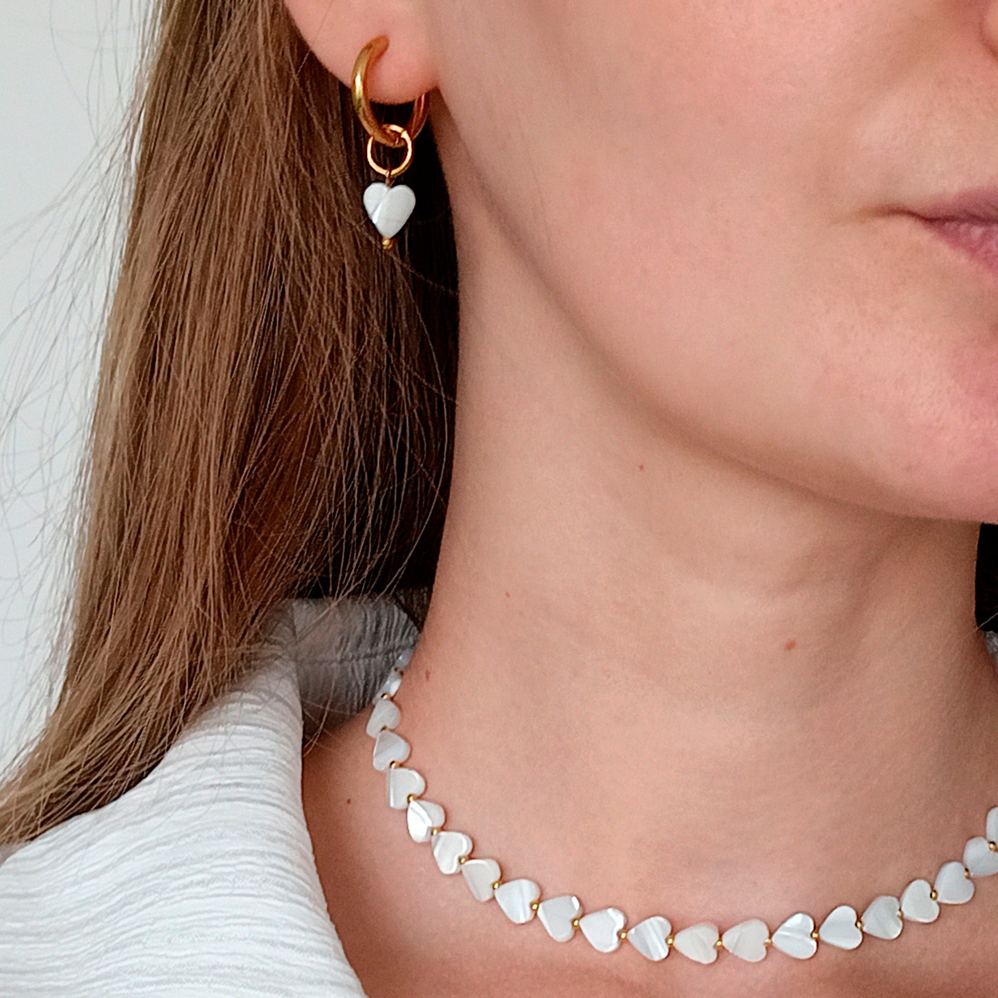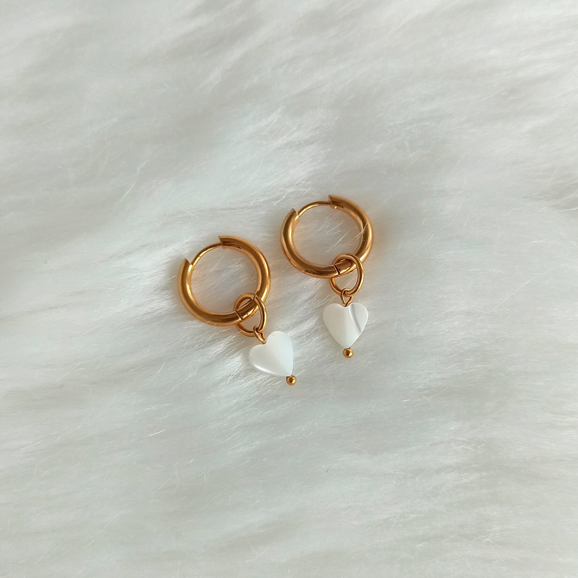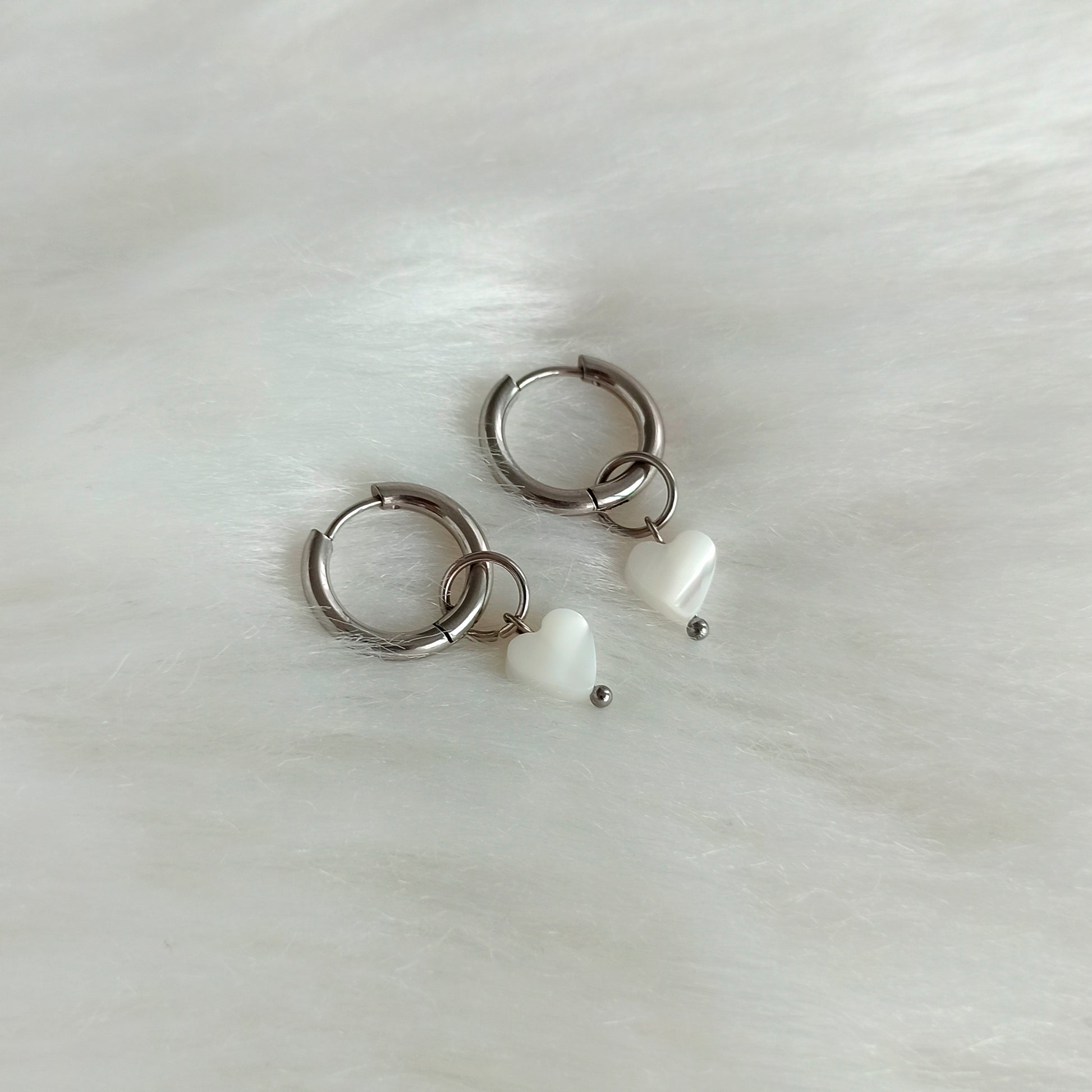 Kruhové náušnice s přívěskem ve tvaru srdce z přírodní perleti.