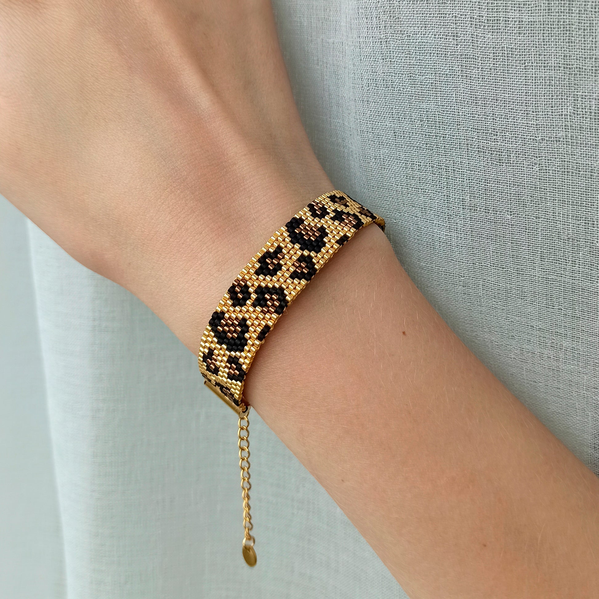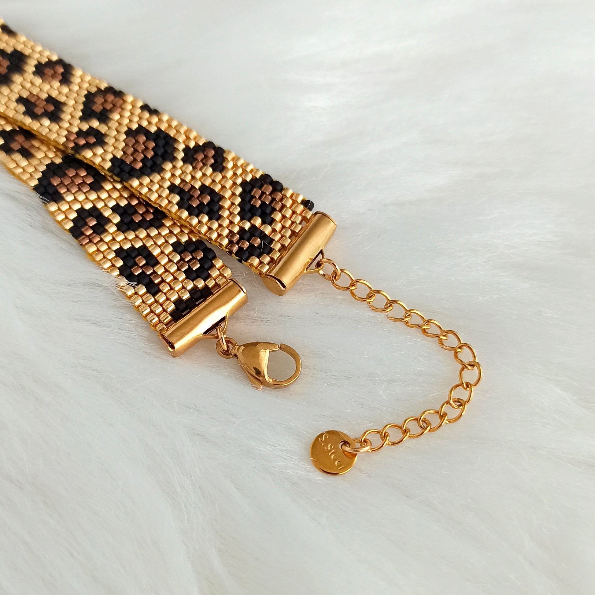 Elegantní náramek s leopardím vzorem ve zlaté barvě. Luxusní ručně vyrobený šperk z kvalitních materiálů s odolnou povrchovou úpravou, která zajišťuje dlouhou životnost. Stylový doplněk, který se nádherně třpytí na slunci a hodí se pro každodenní nošení i speciální příležitosti.