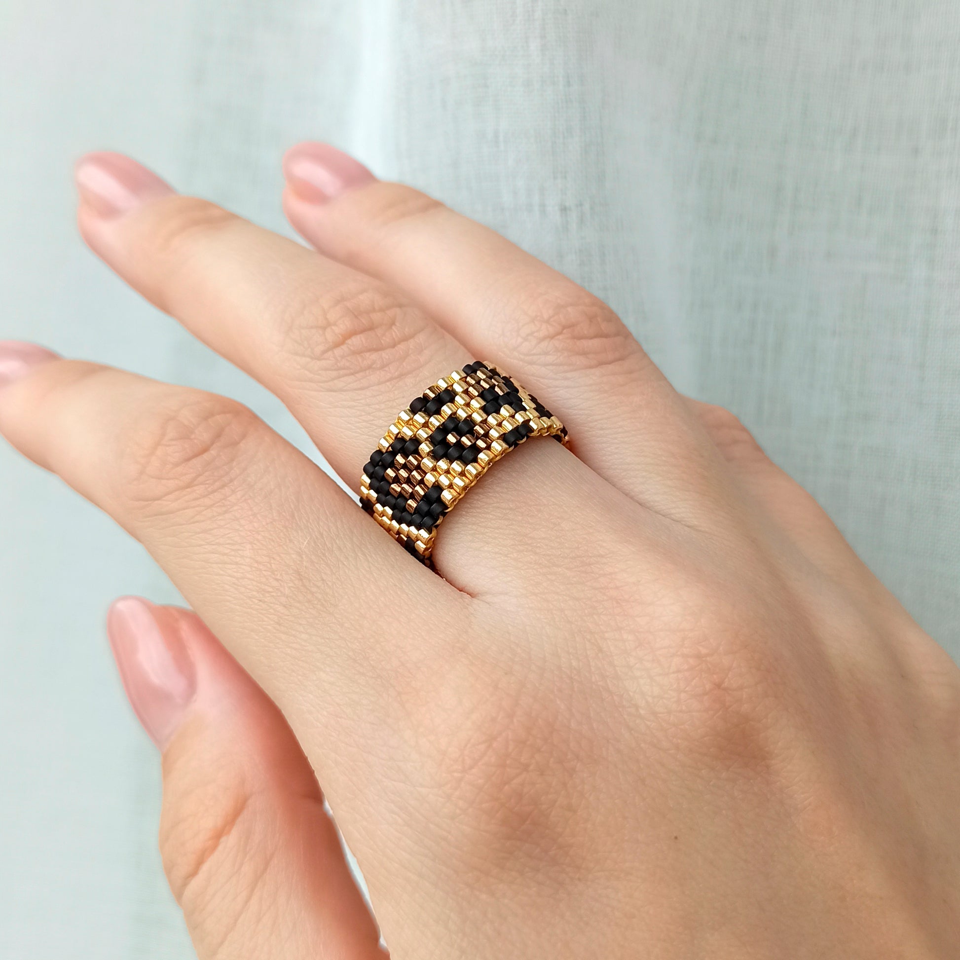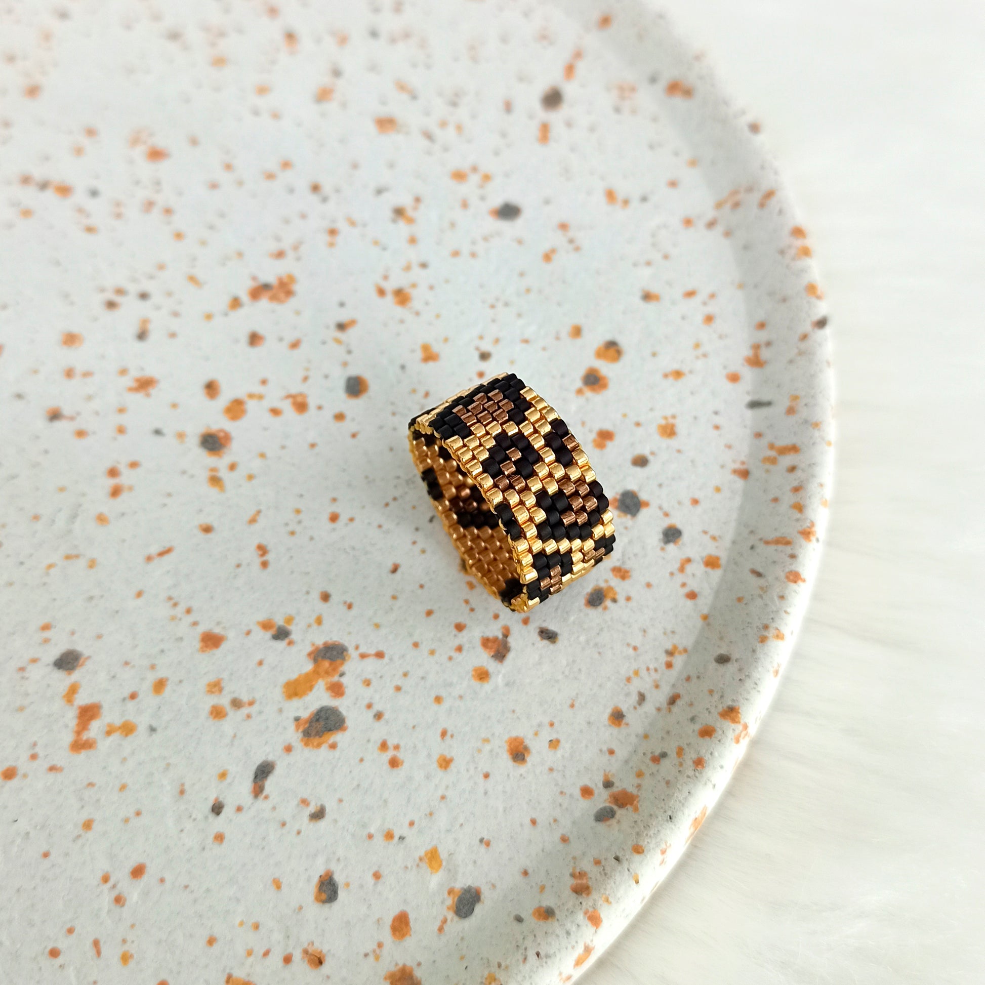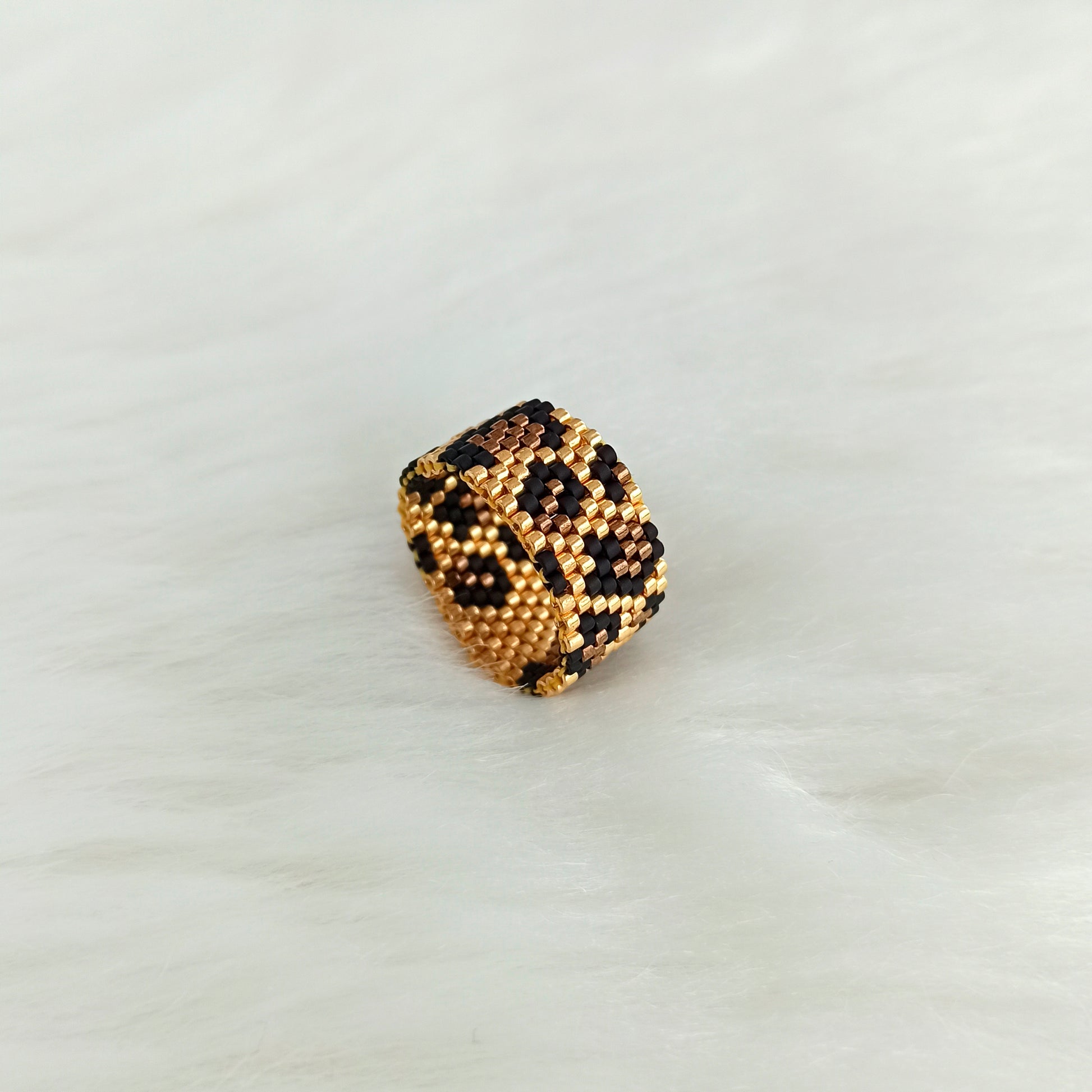 Elegantní prsten s leopardím vzorem ve zlaté barvě a odolným povrchem. Výrazný a moderní šperk, který se nádherně třpytí na slunci a dodá vašemu outfitu originální vzhled.