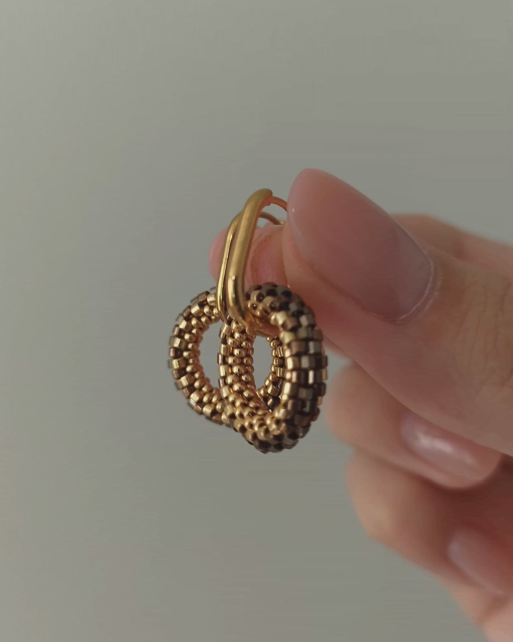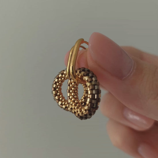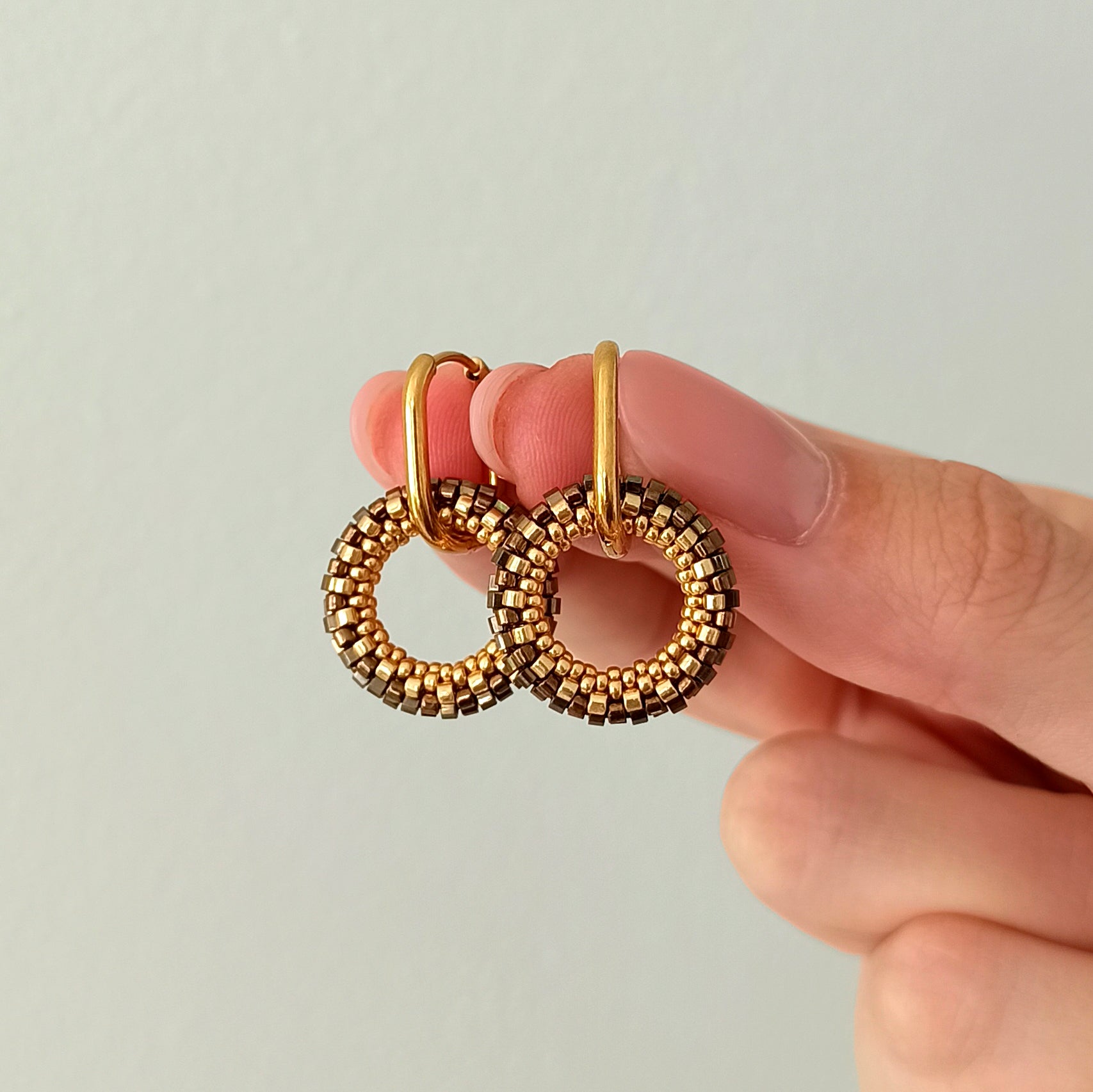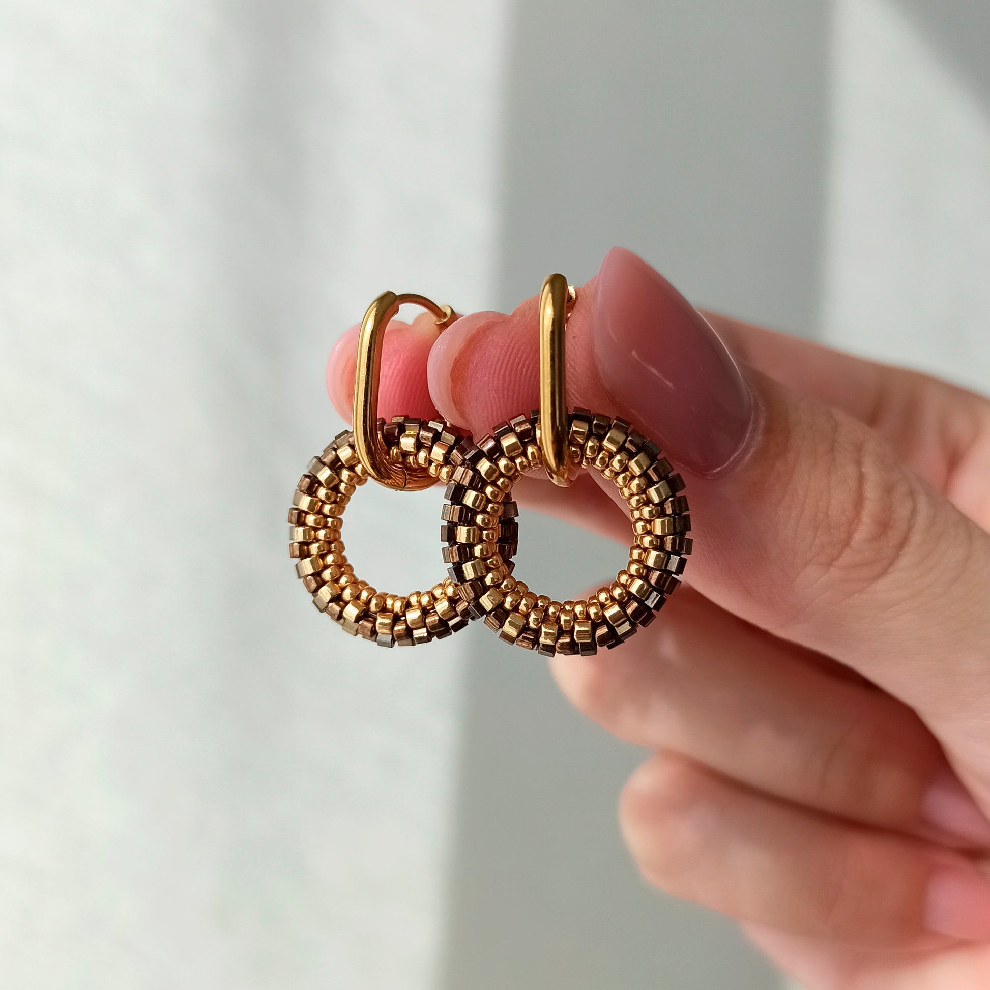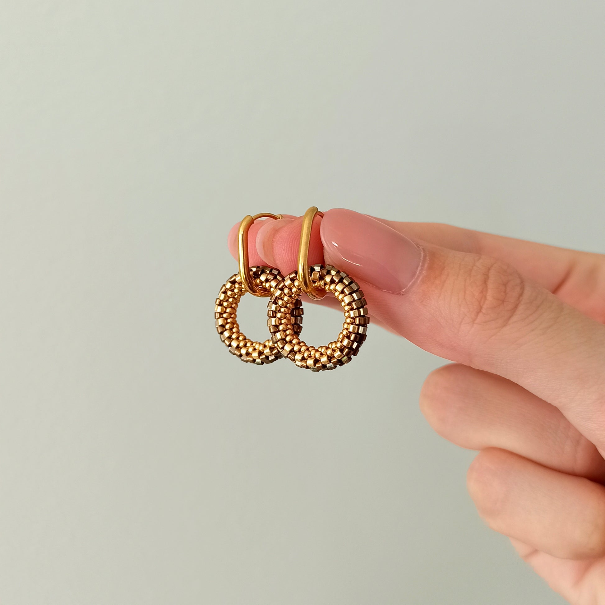 Malé třpytivé náušnice v teplých hnědých odstínech z vysoce kvalitního japonského rokajlu s odolnou povrchovou úpravou.