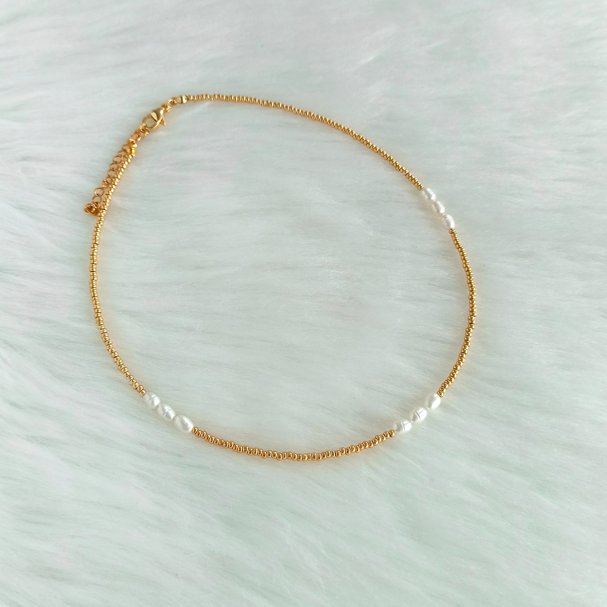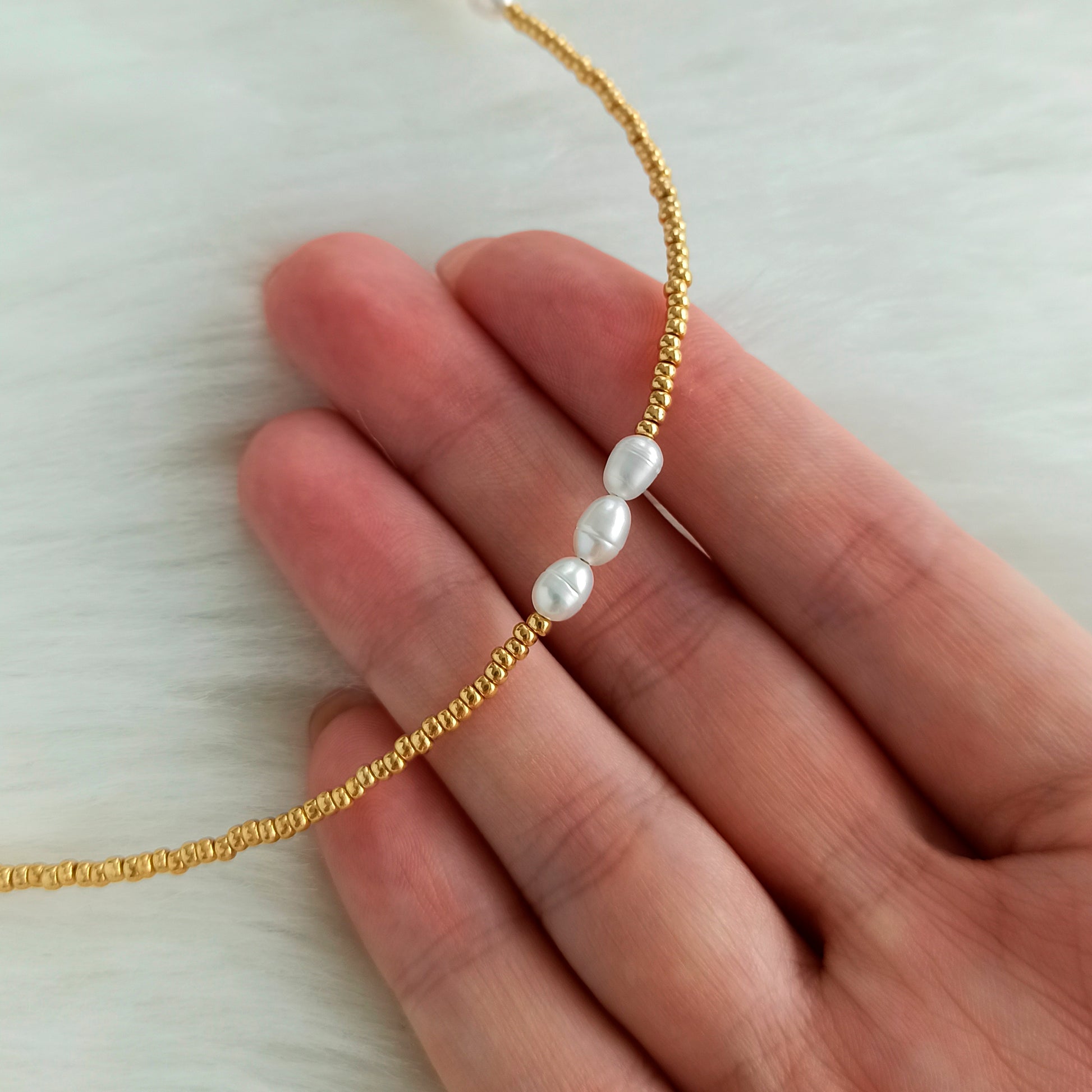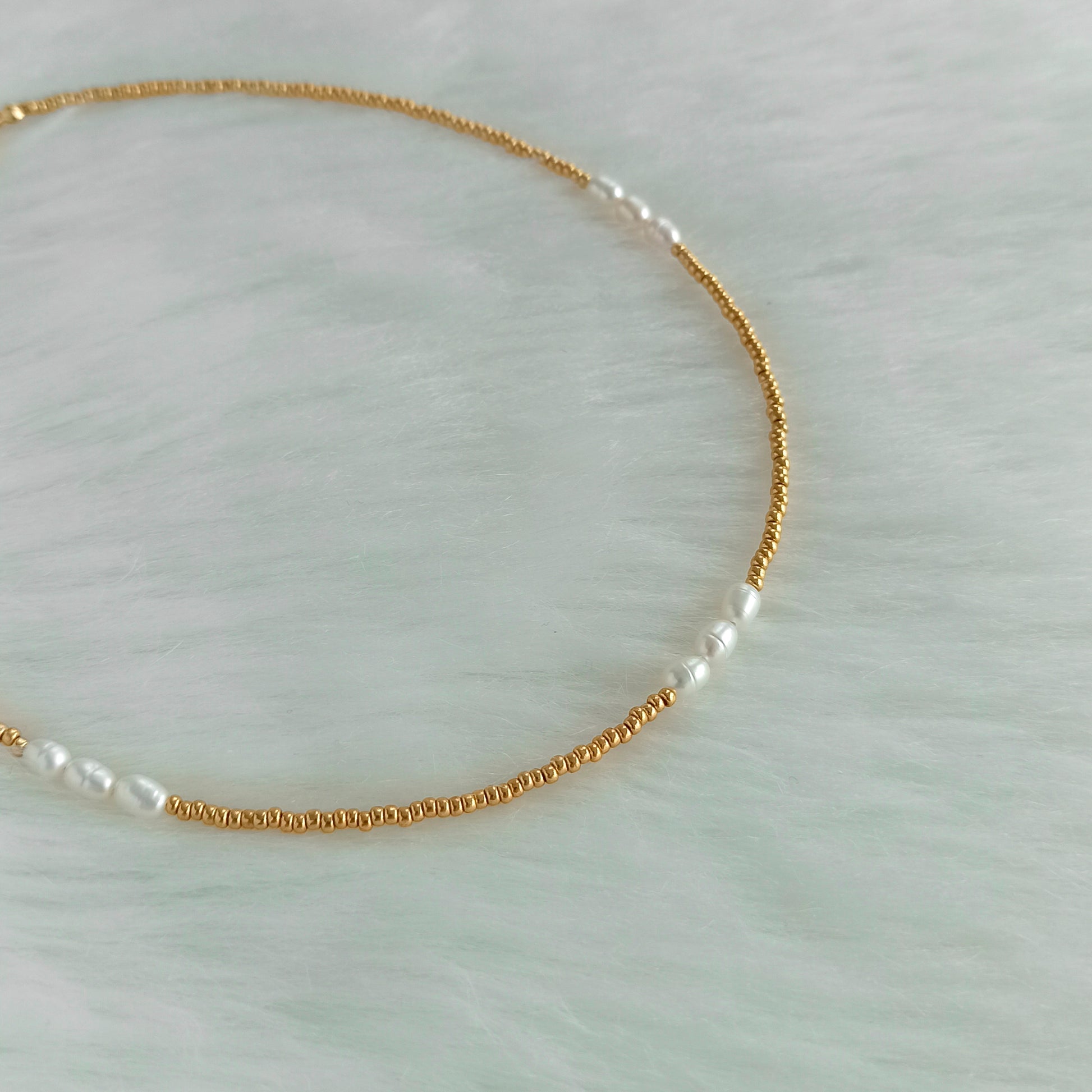 Náhrdelník z vysoce kvalitního japonského rokajlu s odolnou povrchovou úpravou a přírodní říční perlou.