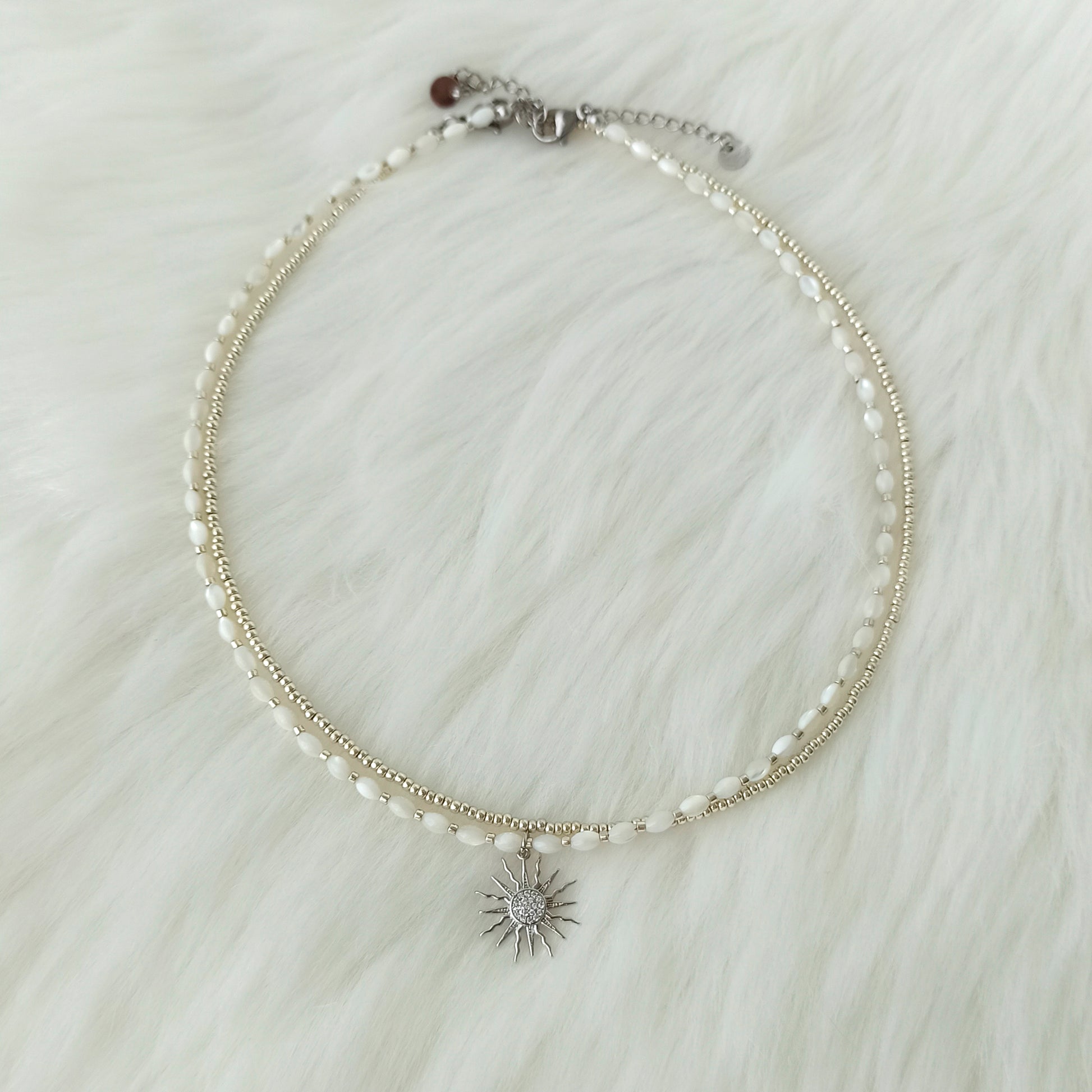 Jemný náhrdelník z přírodní perleti s přívěskem ve tvaru sluníčka.