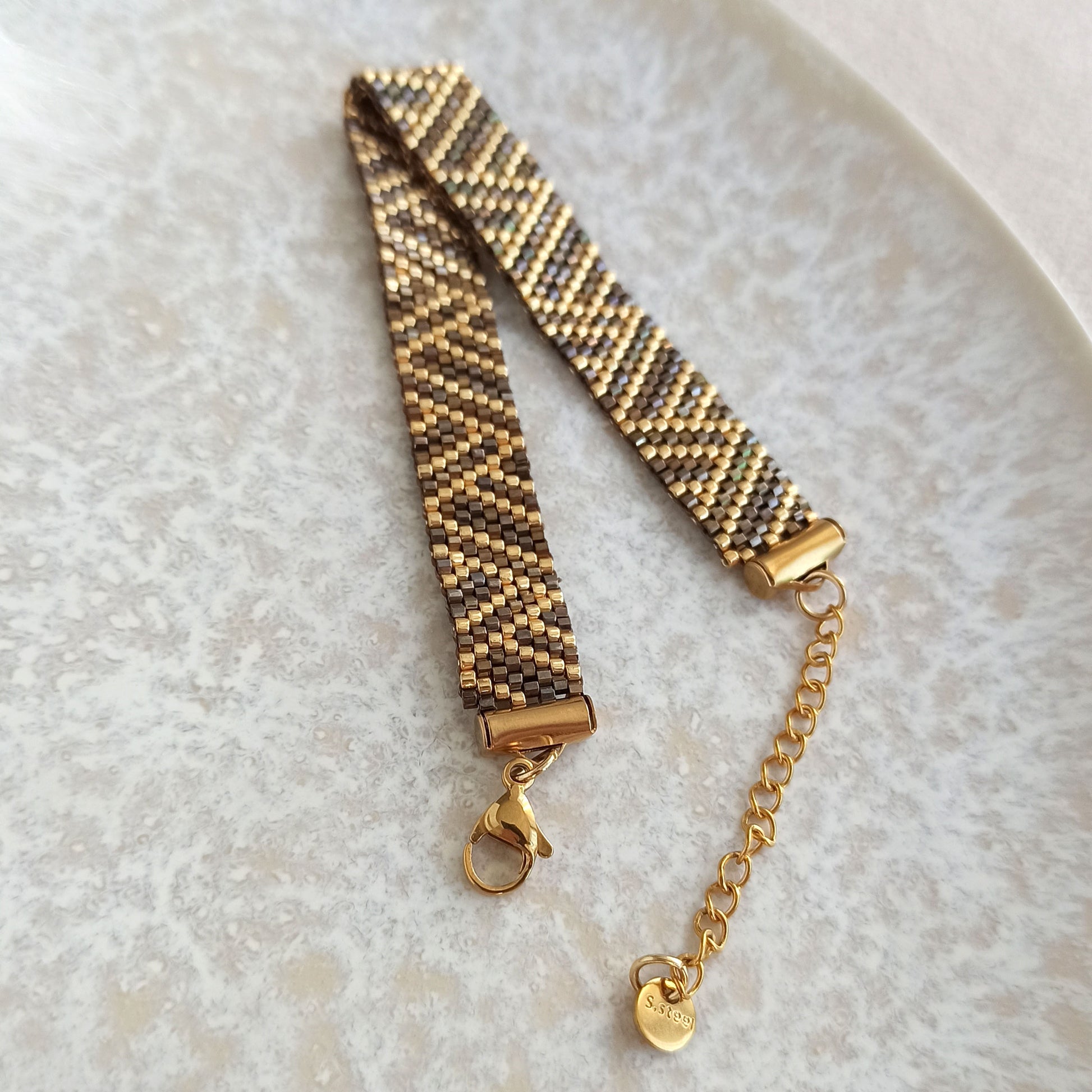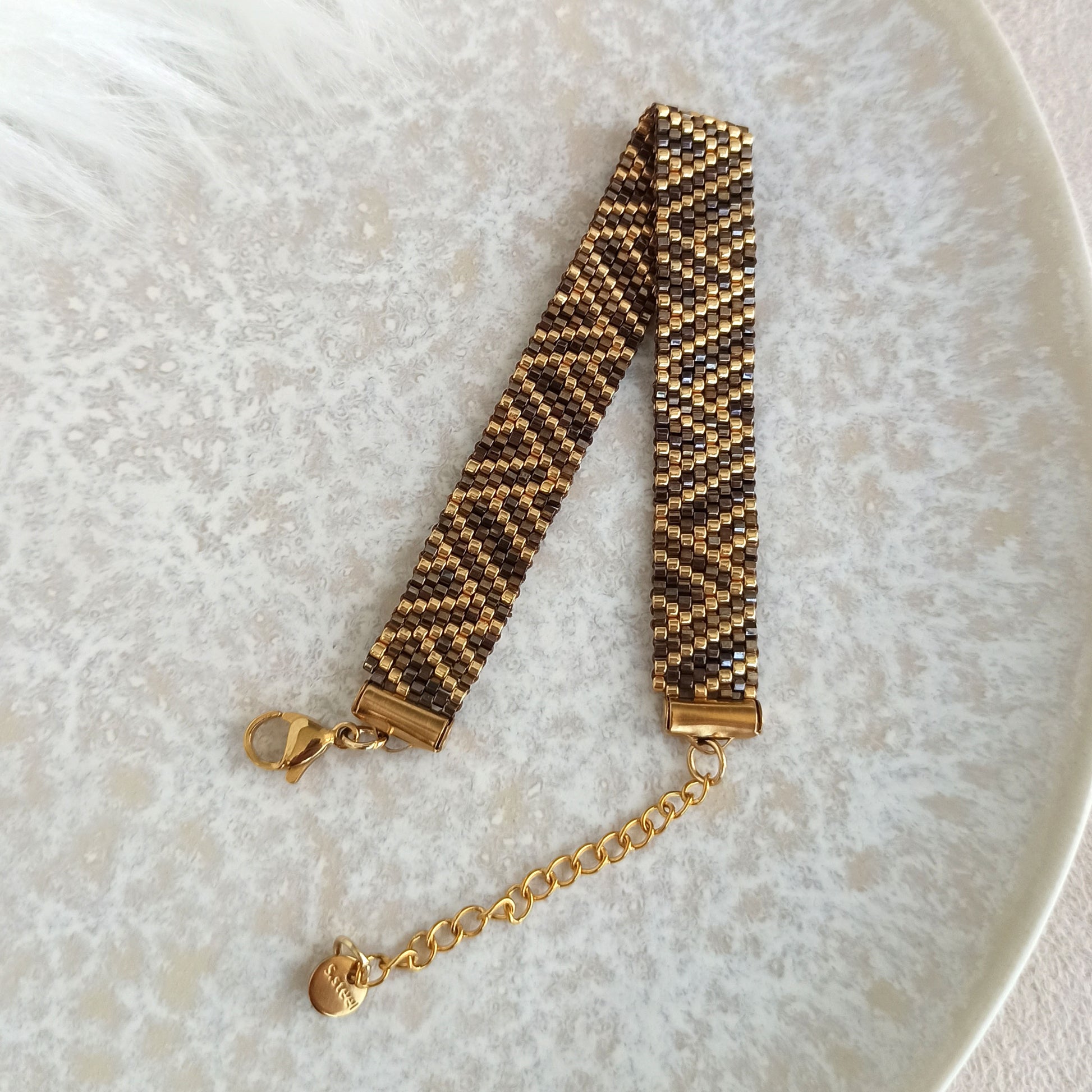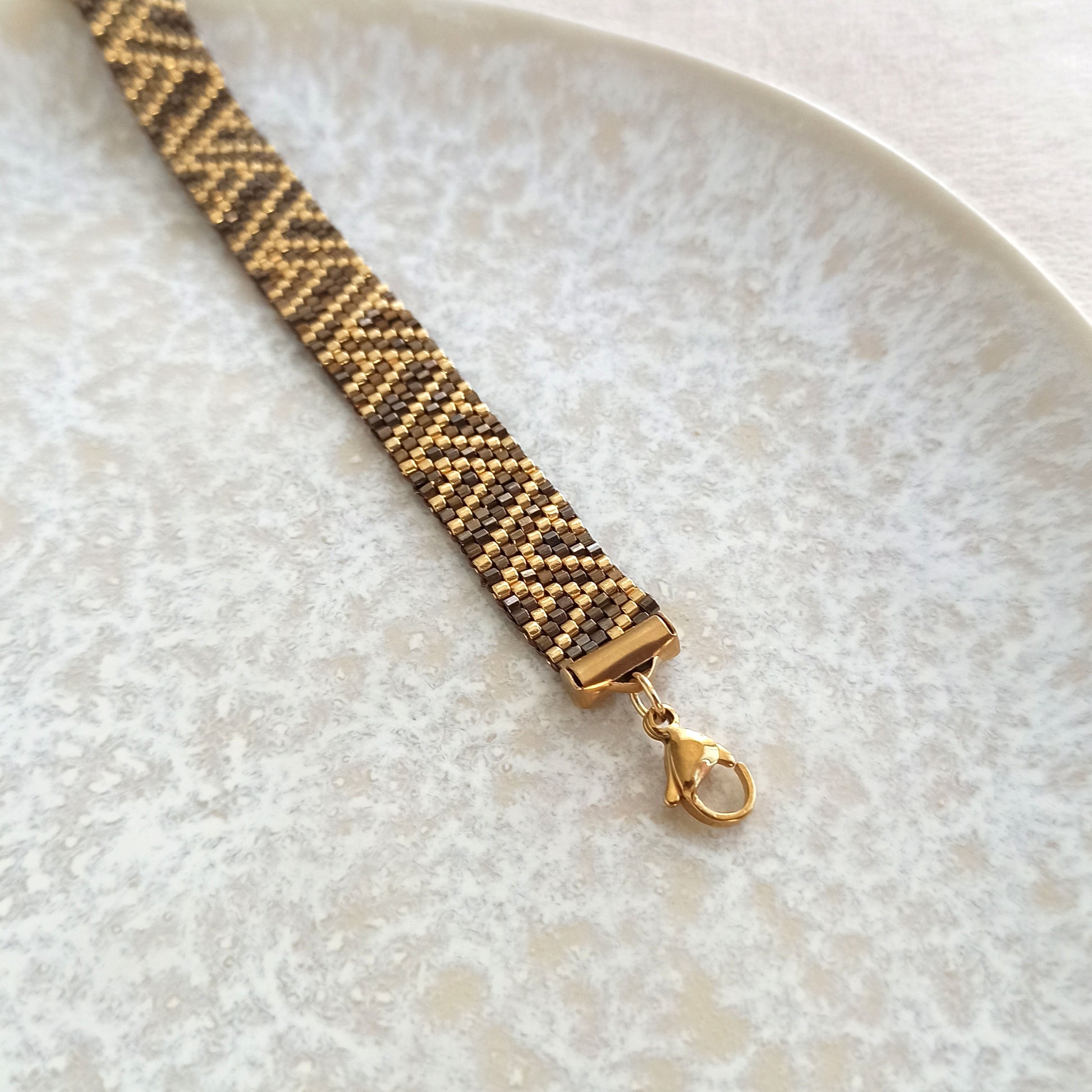 Elegantní náramek s geometrickým vzorem v hnědo-zlaté barevné kombinaci.