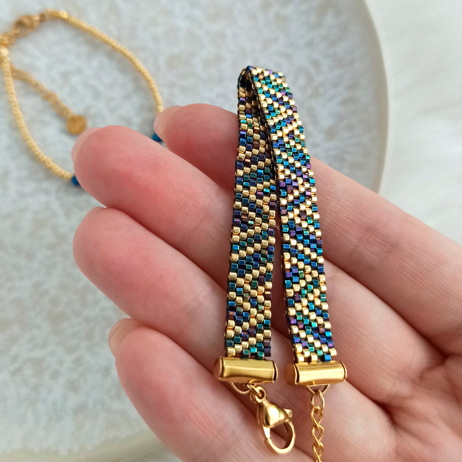 Náramek s geometrickým vzorem v tmavě modré a zlaté barvě.