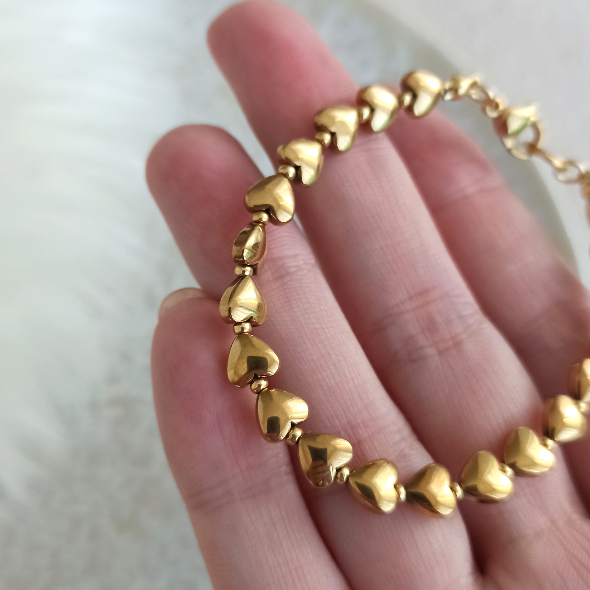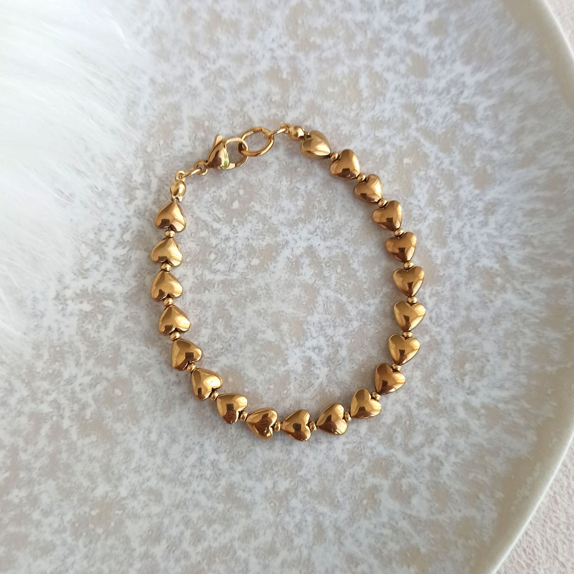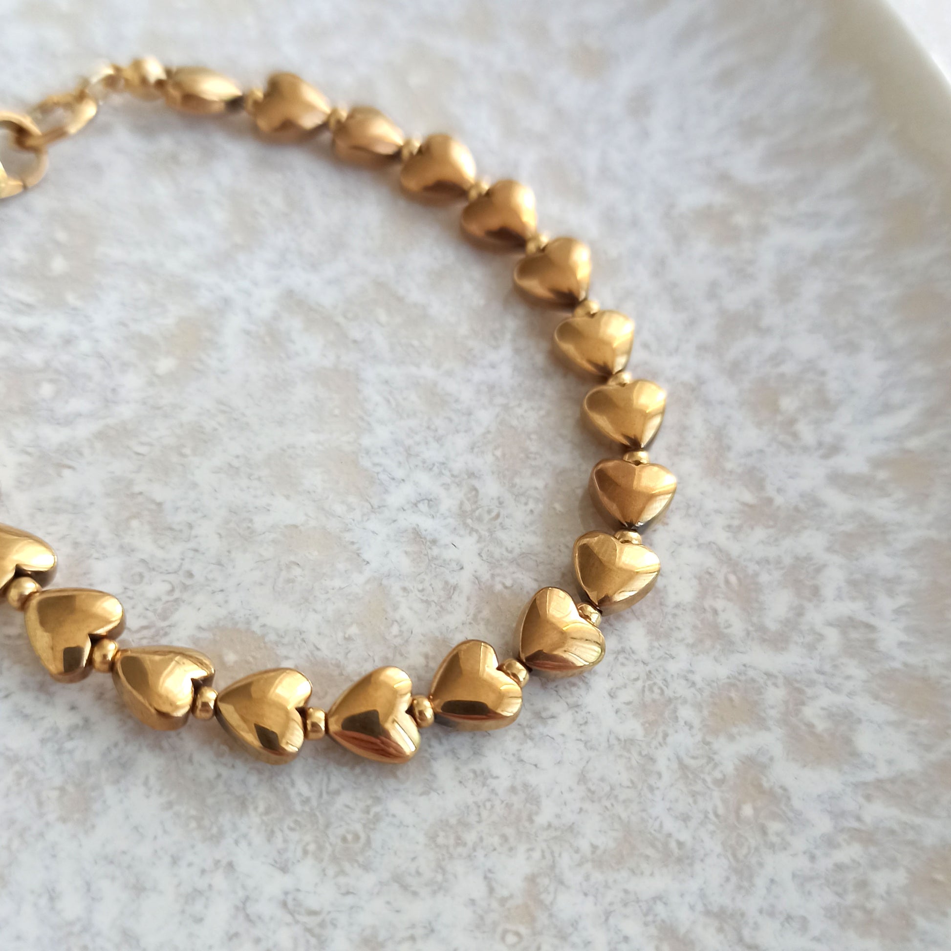 Náramek s pozlacenými srdíčky z přírodního hematitu se zapínáním z nerezové oceli.