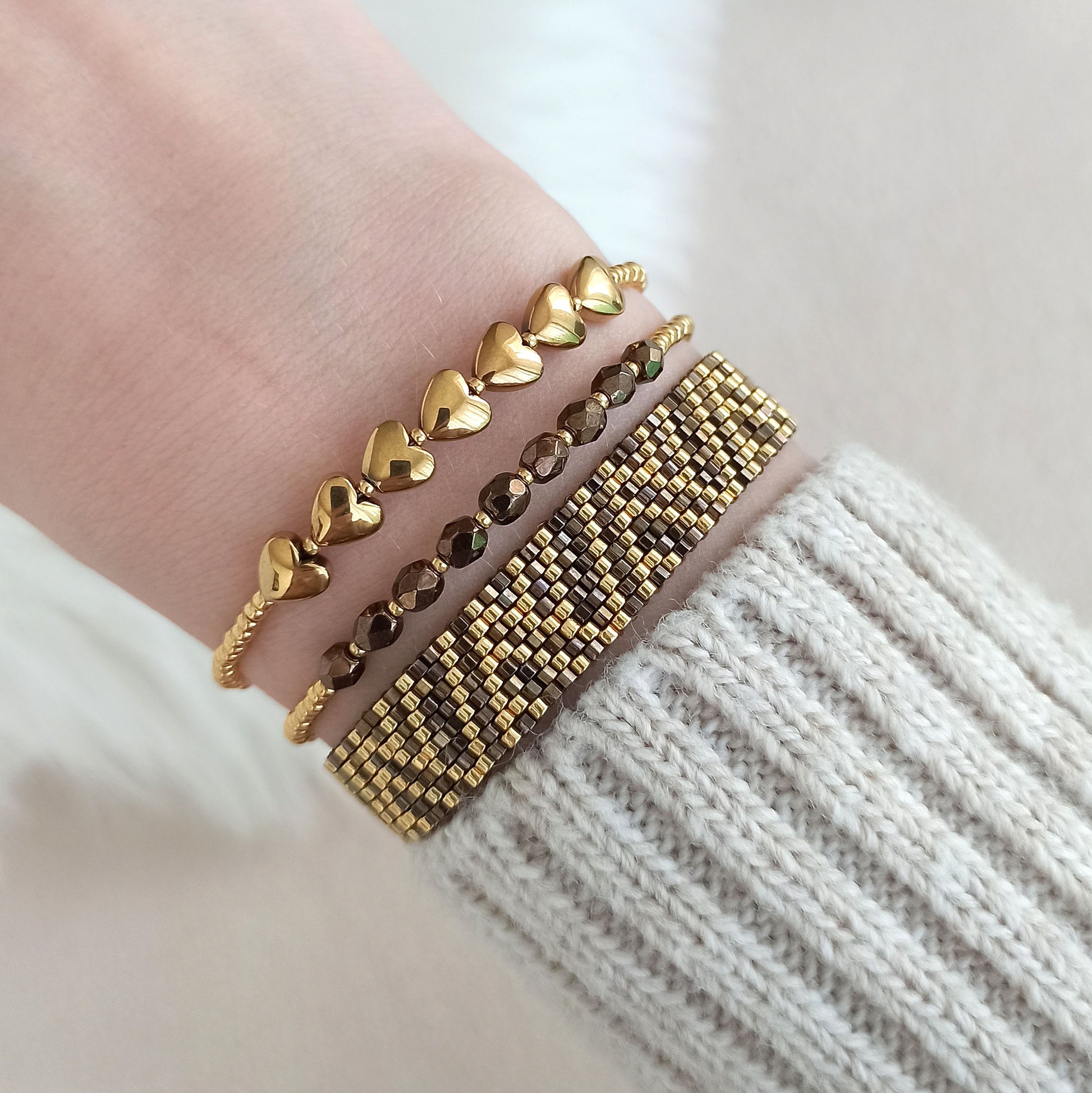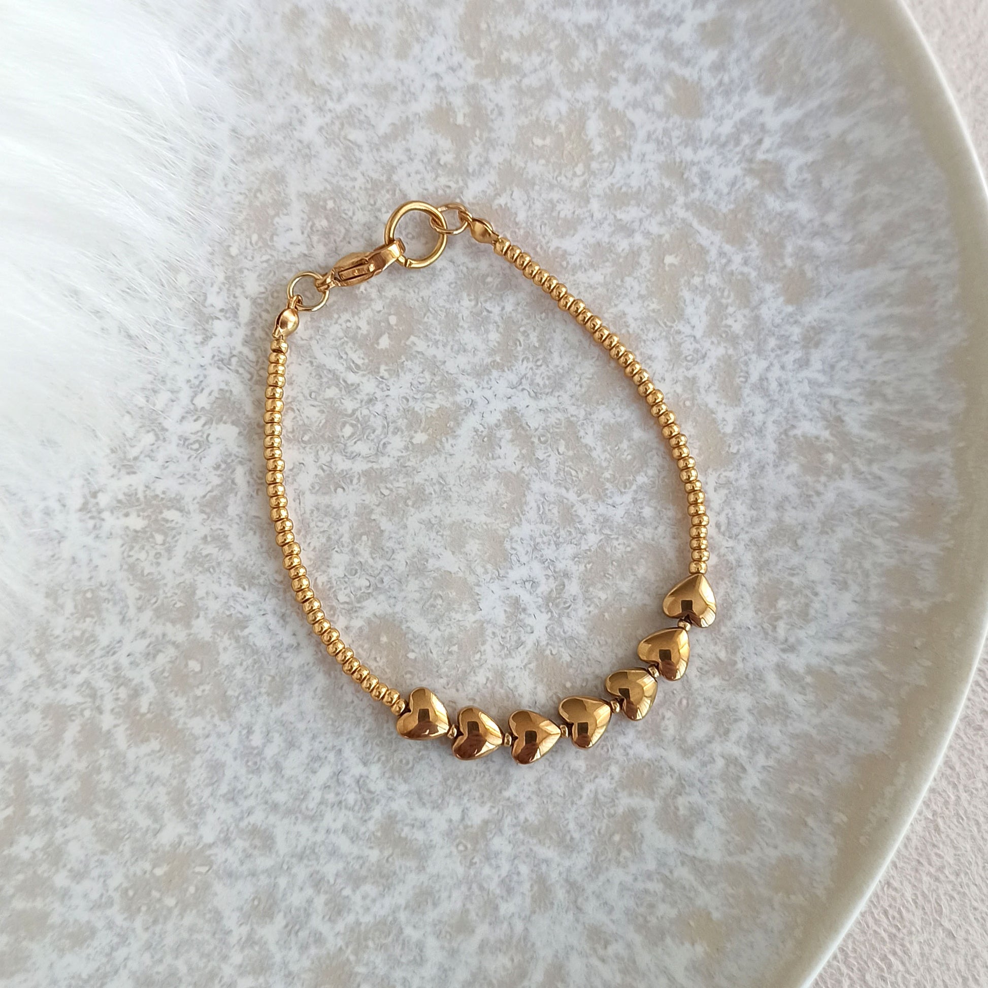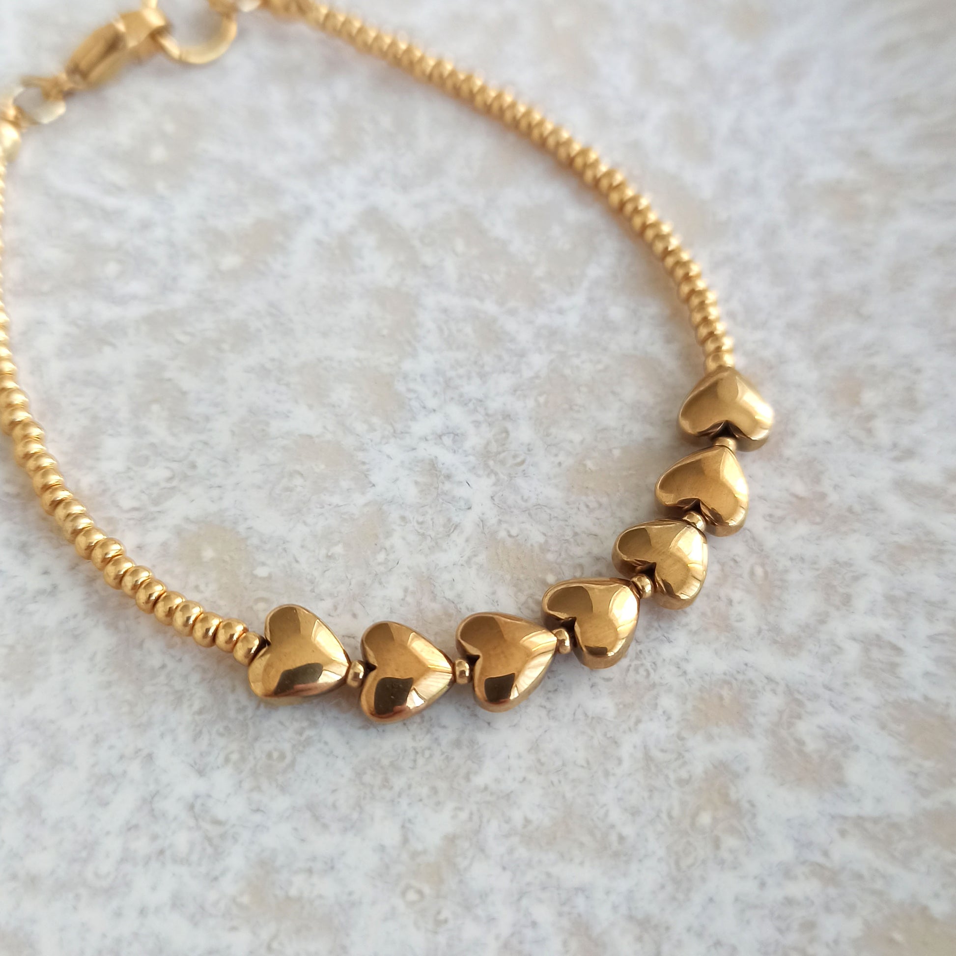 Náramek s pozlacenými srdíčky z přírodního hematitu, doplněný rokajlem a zapínáním z nerezové oceli.