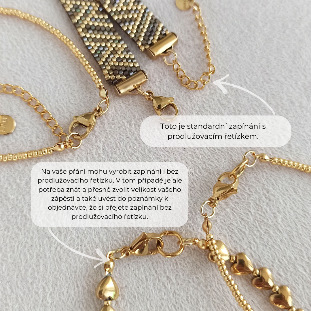 Standardně je k náramku přidán prodlužovací řetízek o délce 5 cm. Pokud si přejete náramek bez prodlužovacího řetízku, uveďte tuto informaci prosím do poznámky k objednávce.