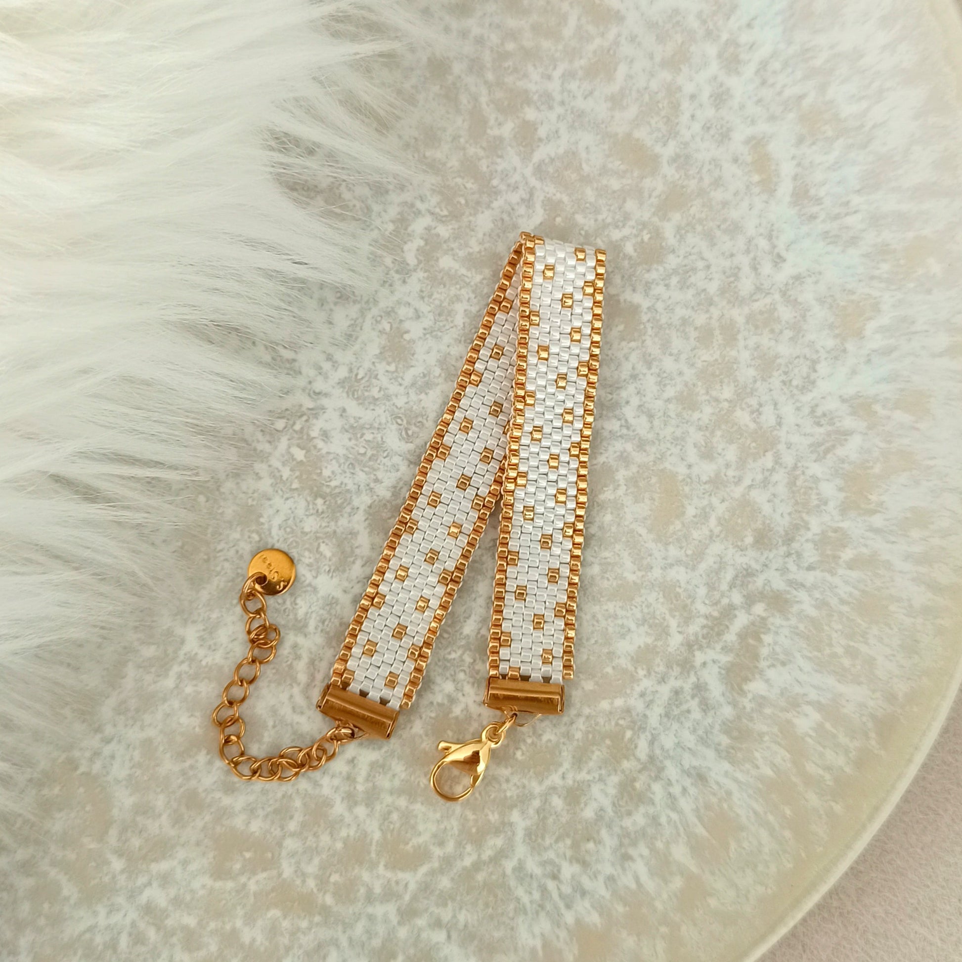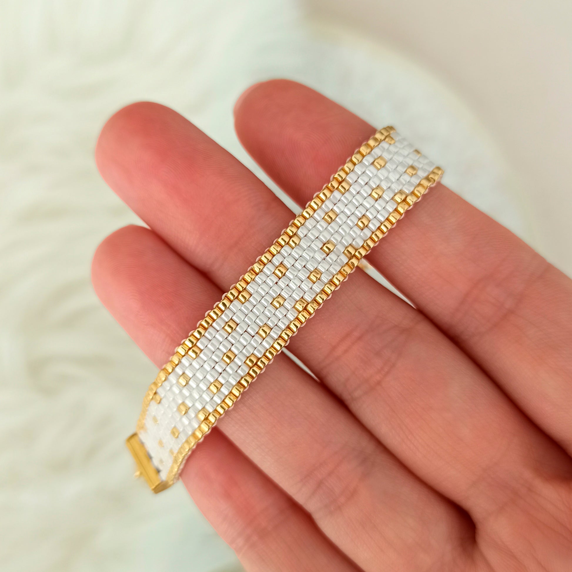 Elegantní náramek v bílo-zlatých barvách se vzorem puntíků, je vyroben z vysoce kvalitního japonského rokajlu s odolnou povrchovou úpravou. Zapínání je z nerezové oceli s pozlacením.