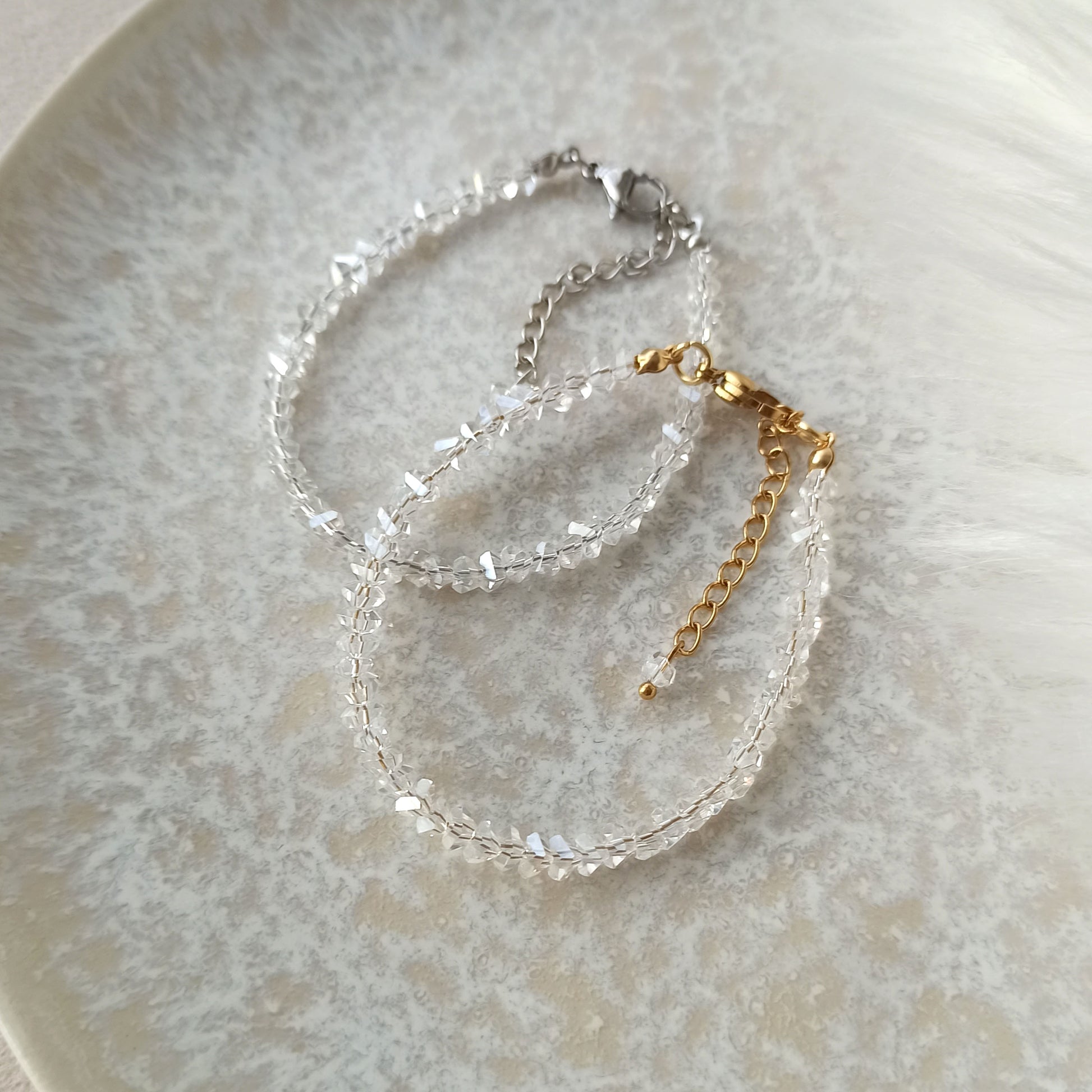 Náramek z křišťálových průhledných korálků. Zapínání z nerezové oceli se zlatou nebo stříbrnou úpravou - vyberte si variantu.