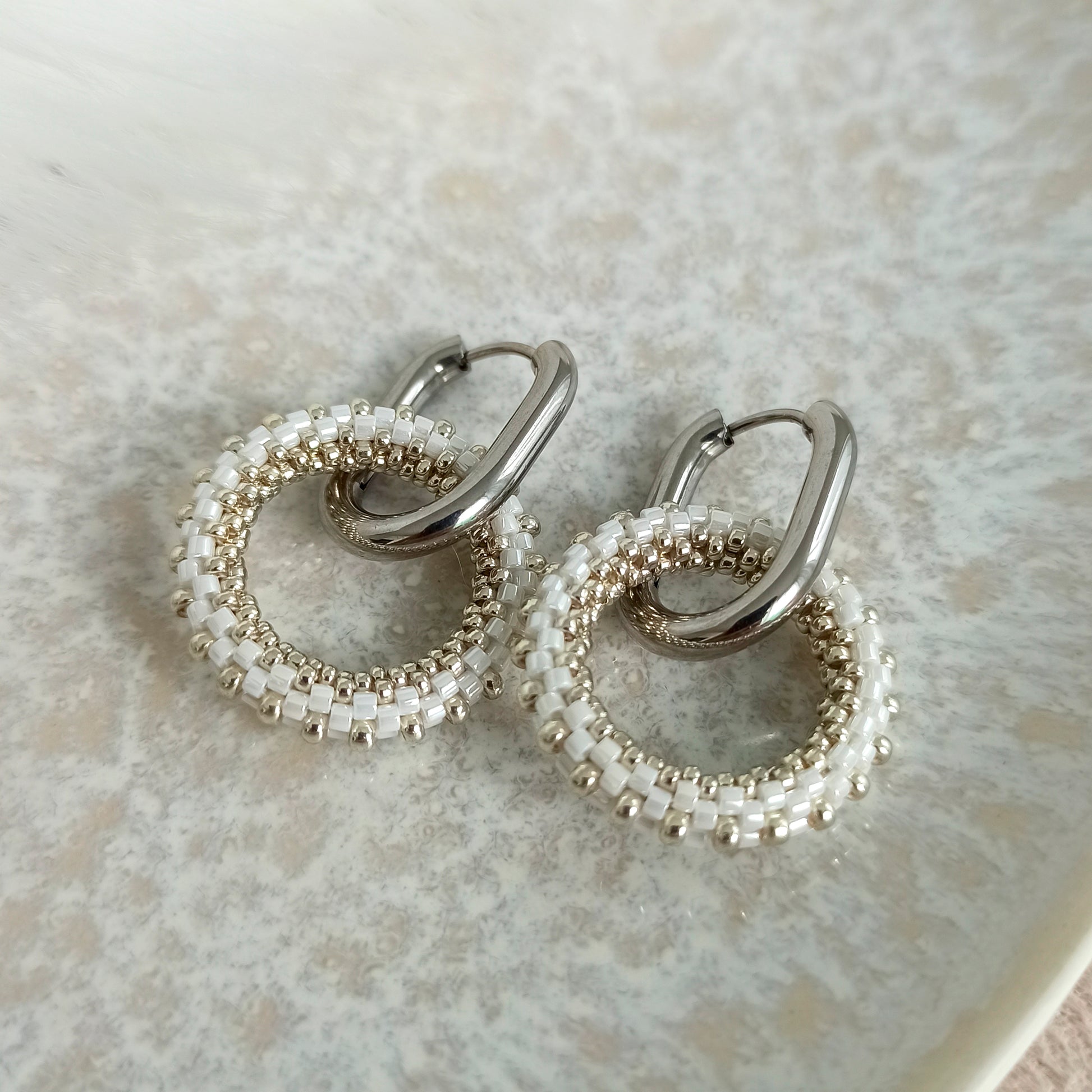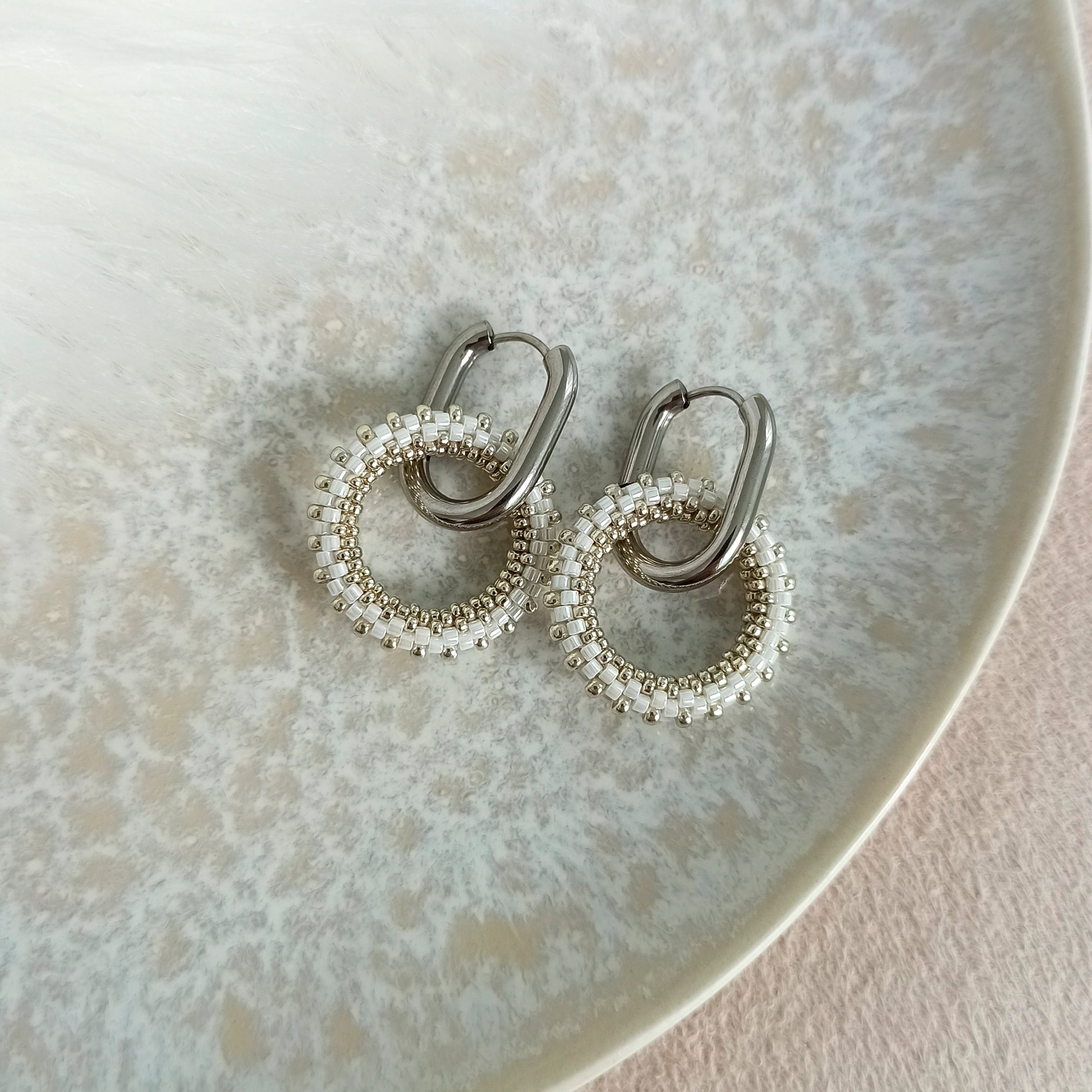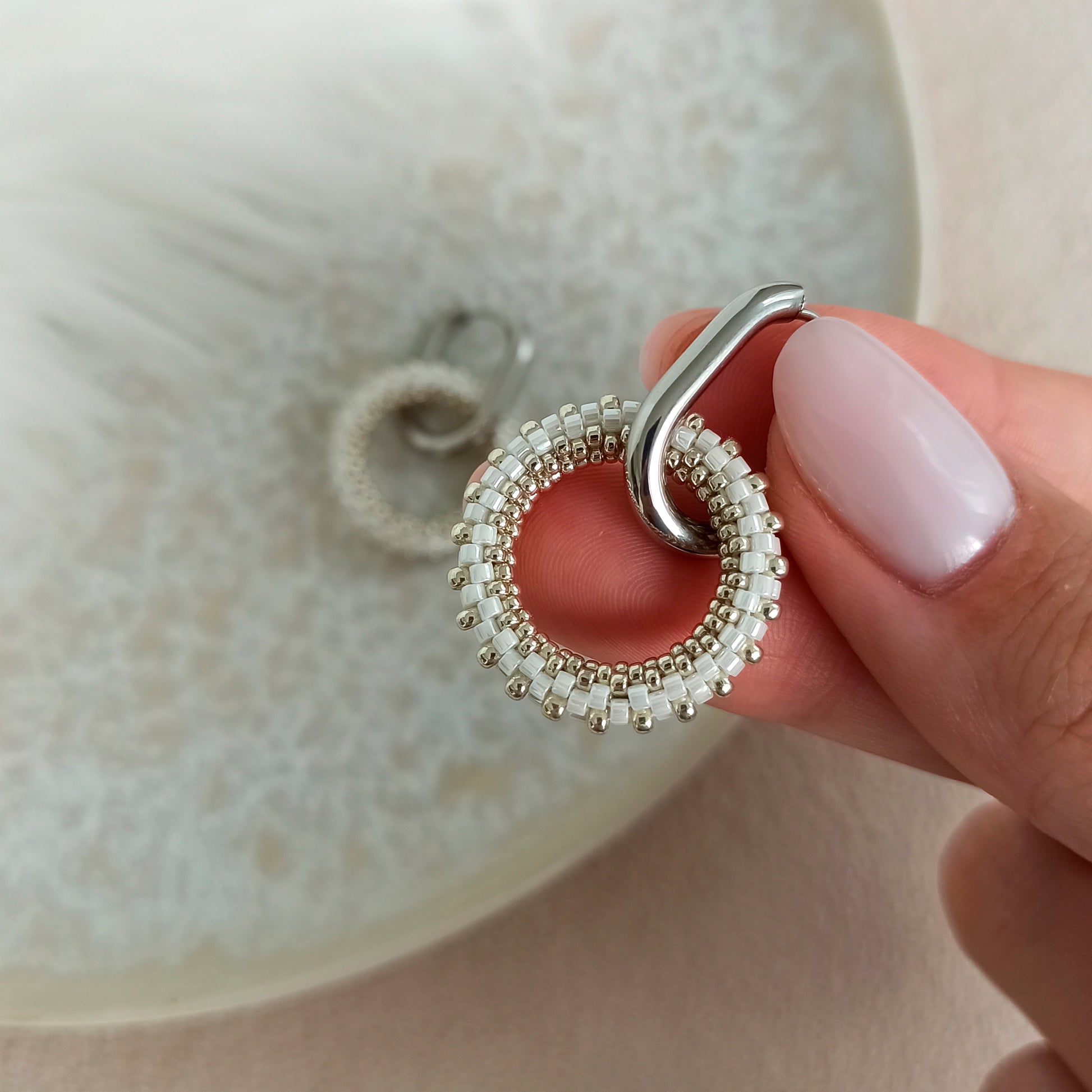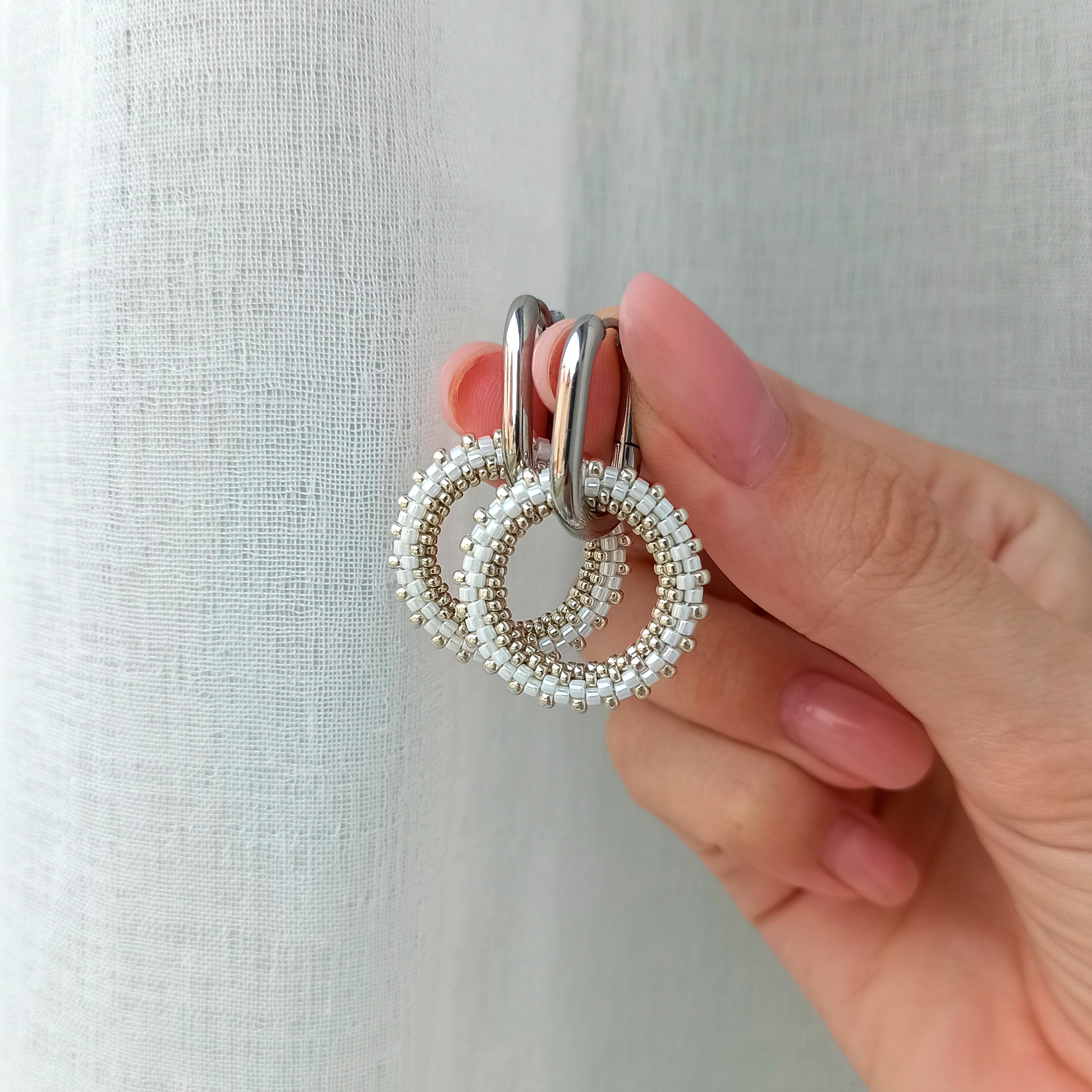 Náušnice o průměru 23 mm v v bílo-stříbrné barvě.