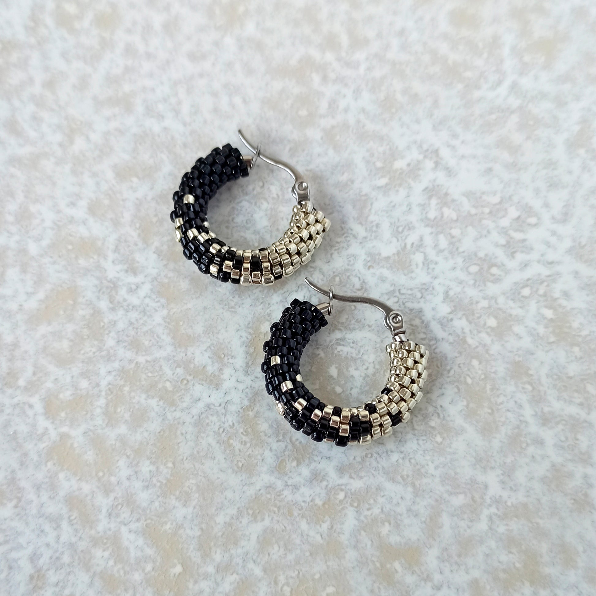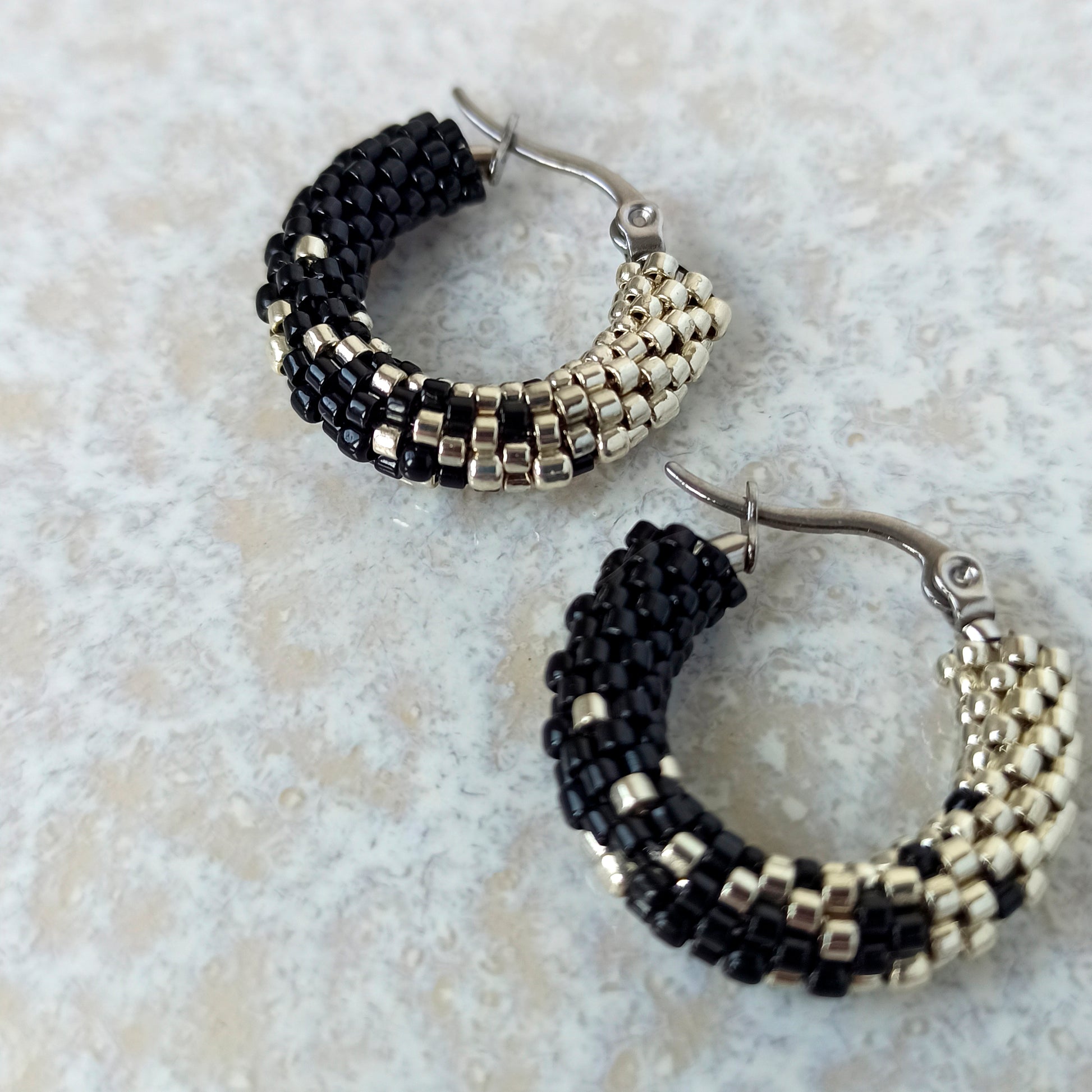 Náušnice jsou vyrobeny z kvalitních japonských korálků, zapínání je z oceli. Bez niklu. Na fotografii jsou náušnice o průměru 23 mm, ale můžete si zvolit i jinou velikost.