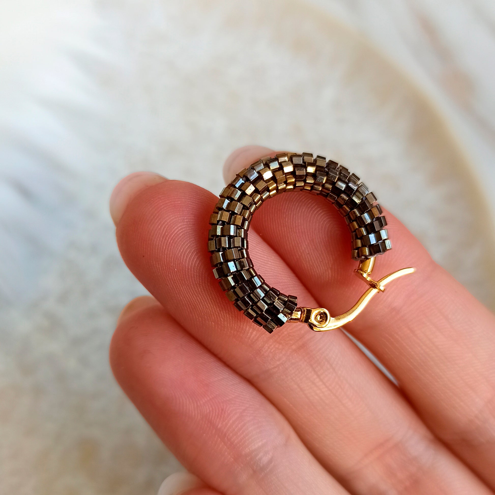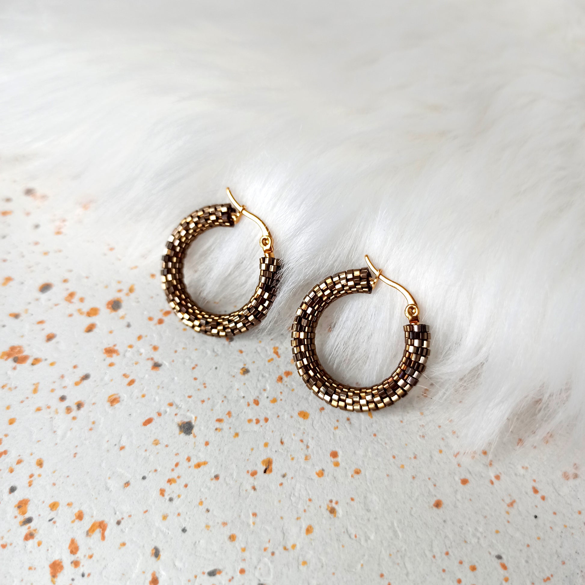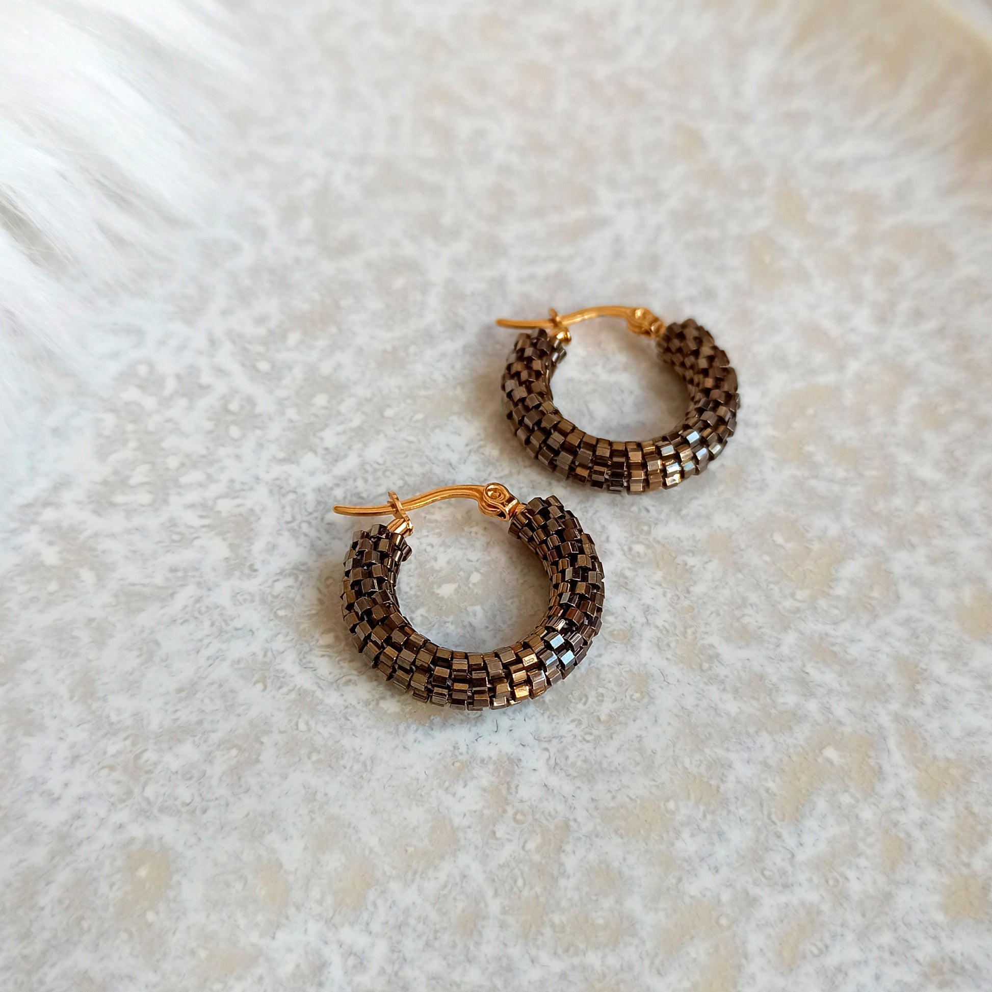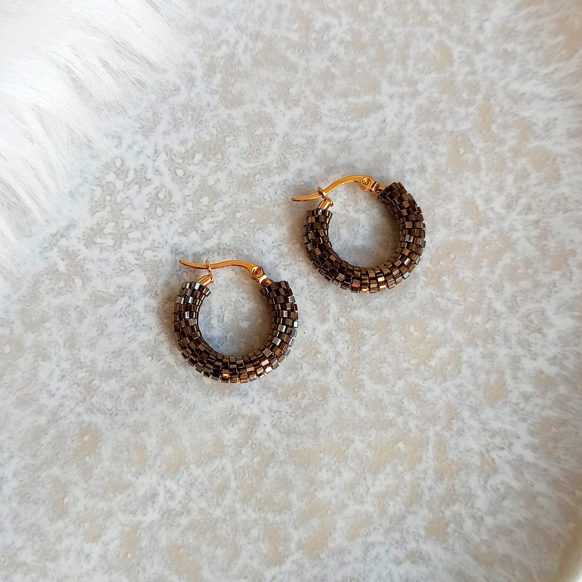 Kruhové náušnice „Kongo“ v kombinaci hnědé a šedé barvy s jemným leskem díky šestihrannému japonskému rokajlu.