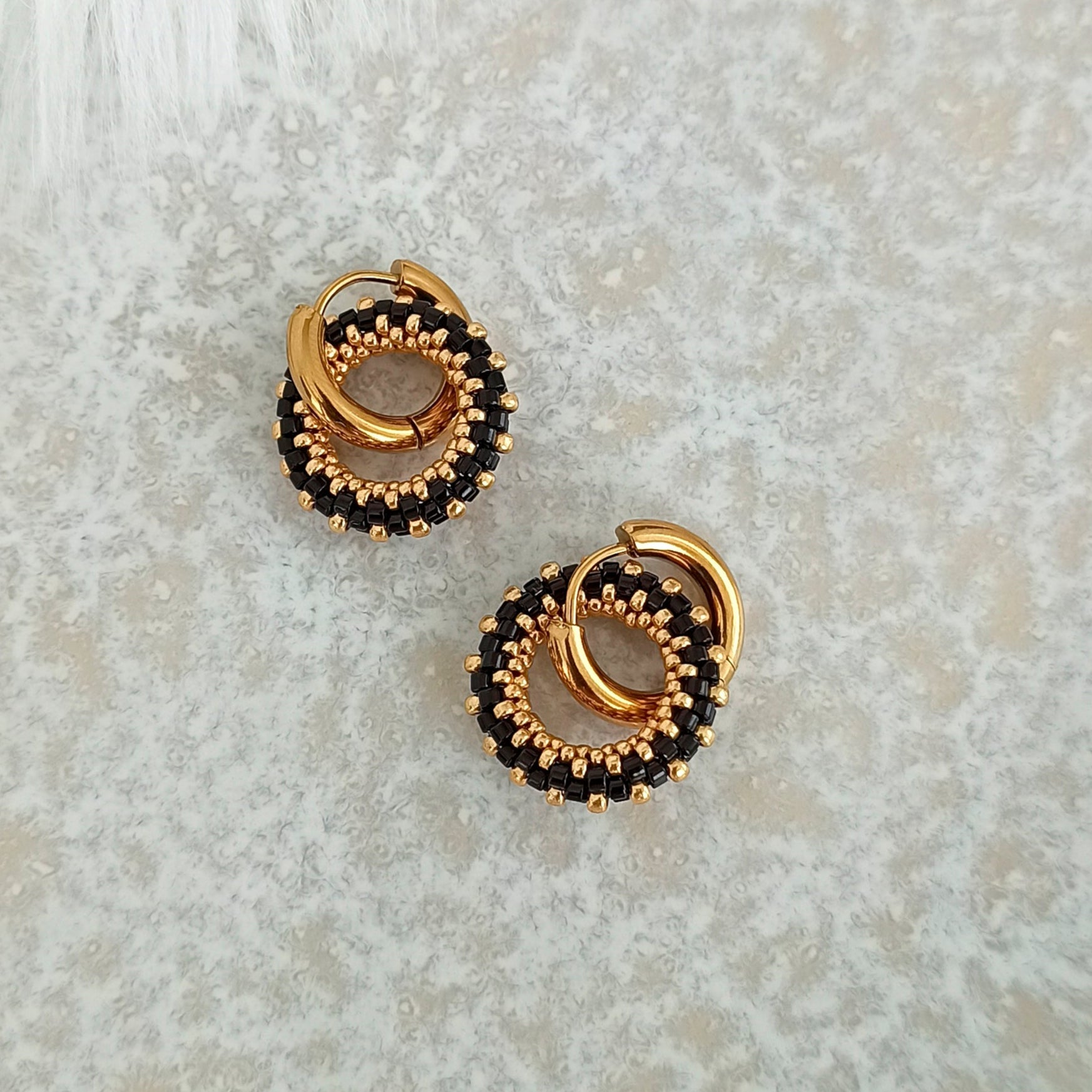 Kulatý náušnice ve černo-zlaté barvé z vysoce kvalitního japonského rokajlu s odolnou povrchovou úpravou.