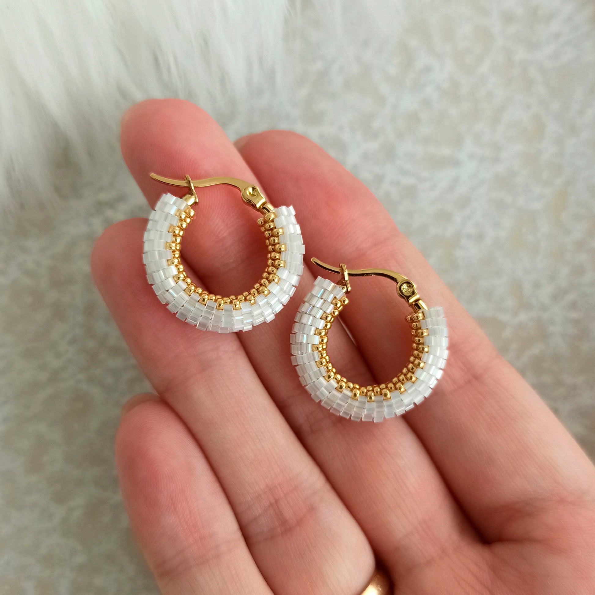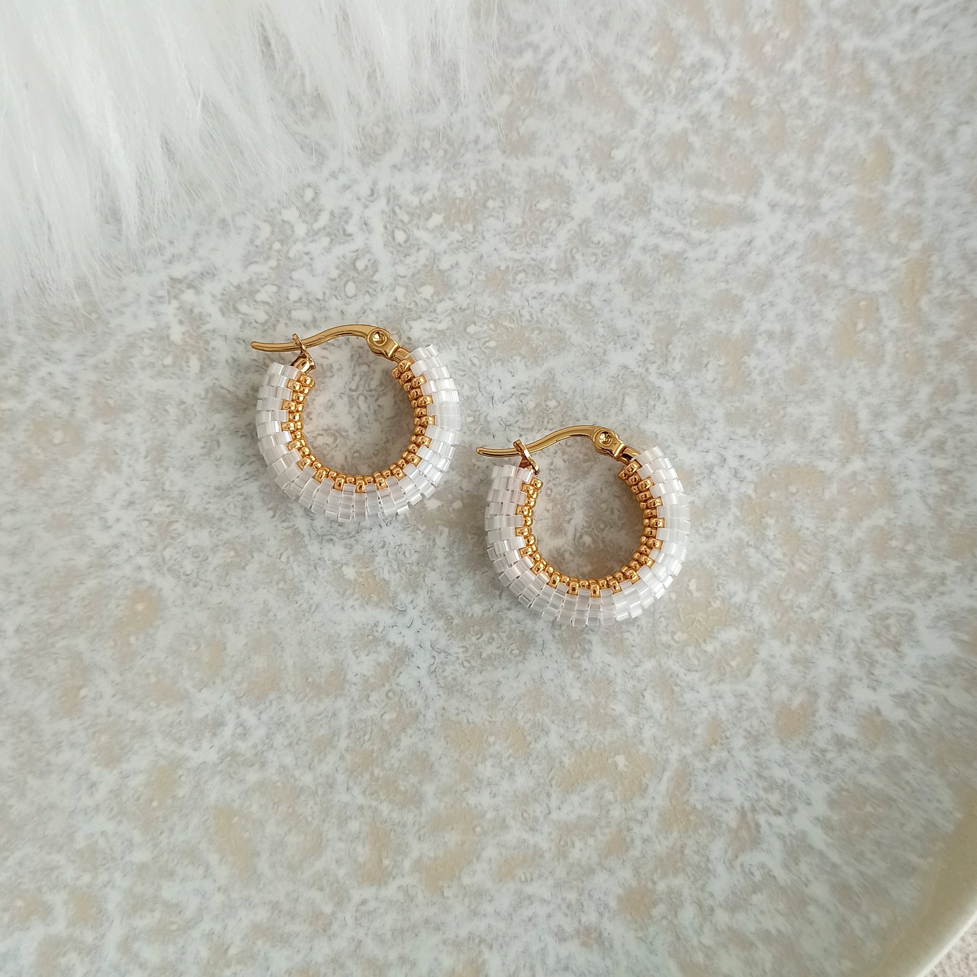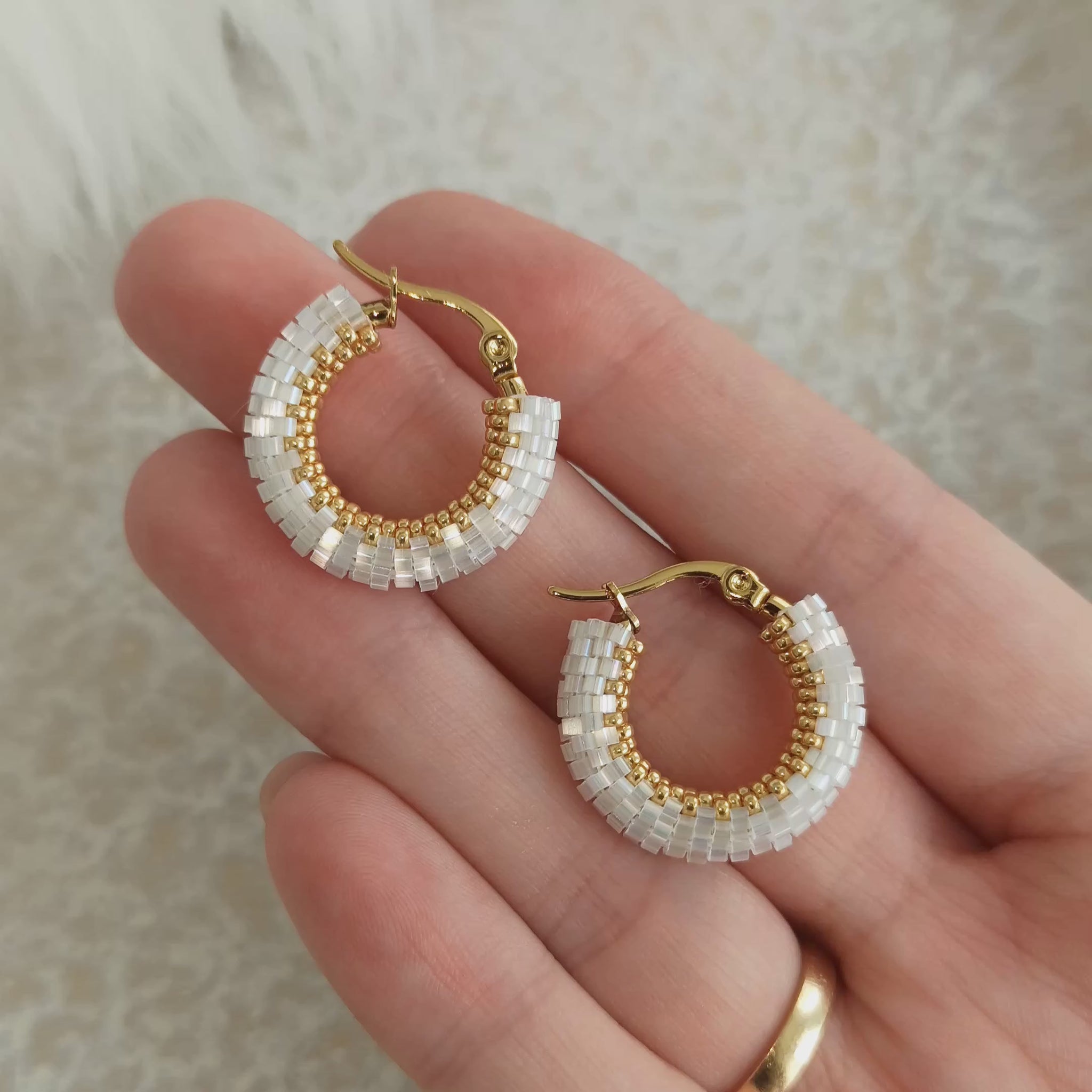 Elegantní náušnice v křišťálově bílé barvě se zlatem. Vyrobeno z vysoce kvalitního japonského saténového rokajlu a nerezové oceli s pozlacením.
