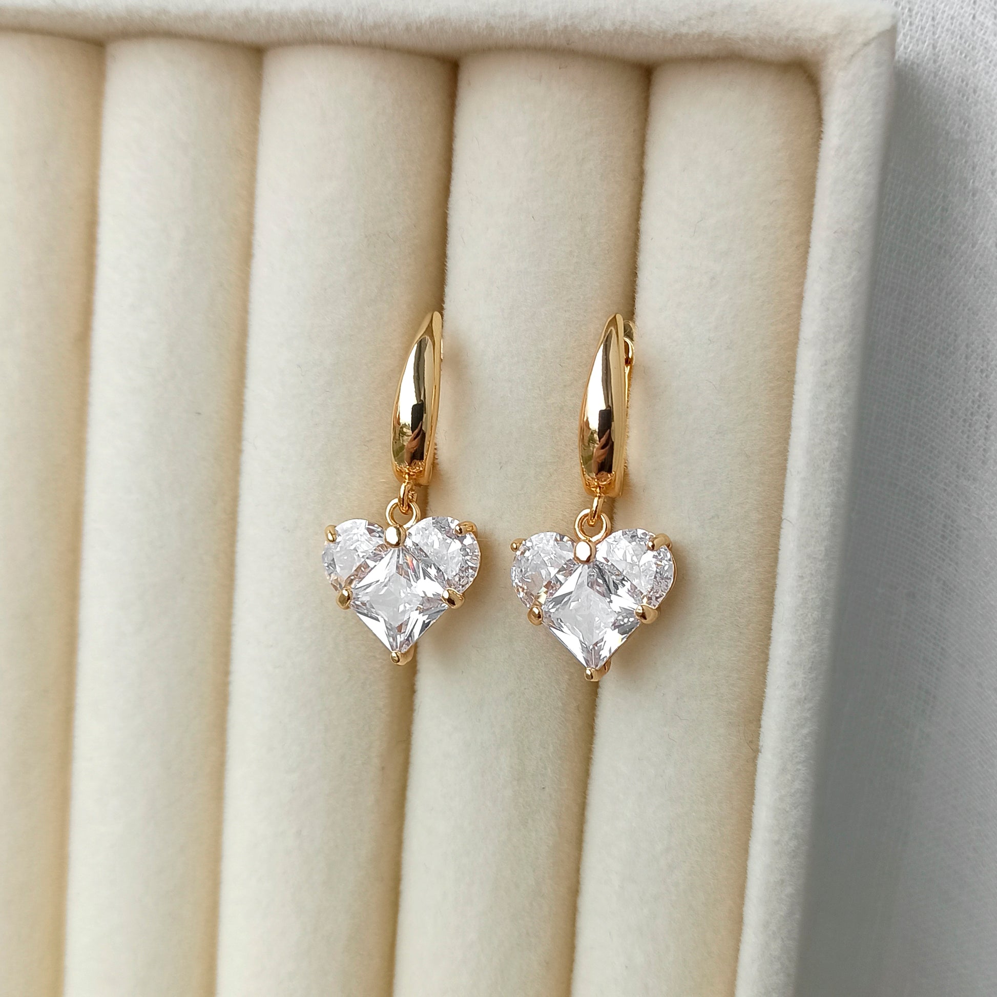 Náušnice z mosazi s 18karátovým pozlacením a srdíčkem z kubického zirkonu.