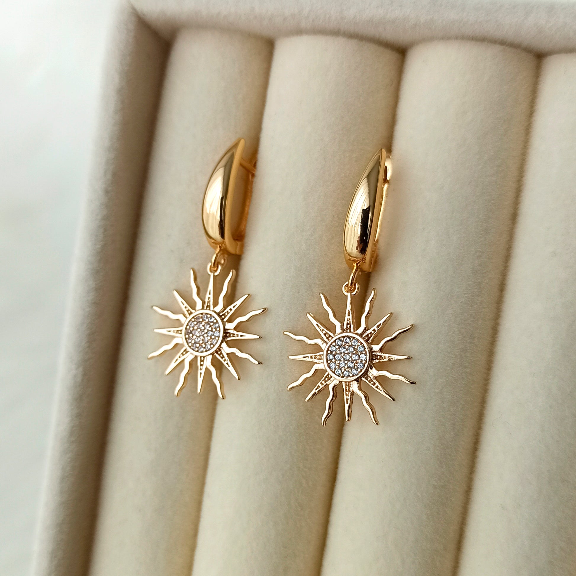 Náušnice s přívěskem sluníčka z mosazi s 18karátovým pozlacením.