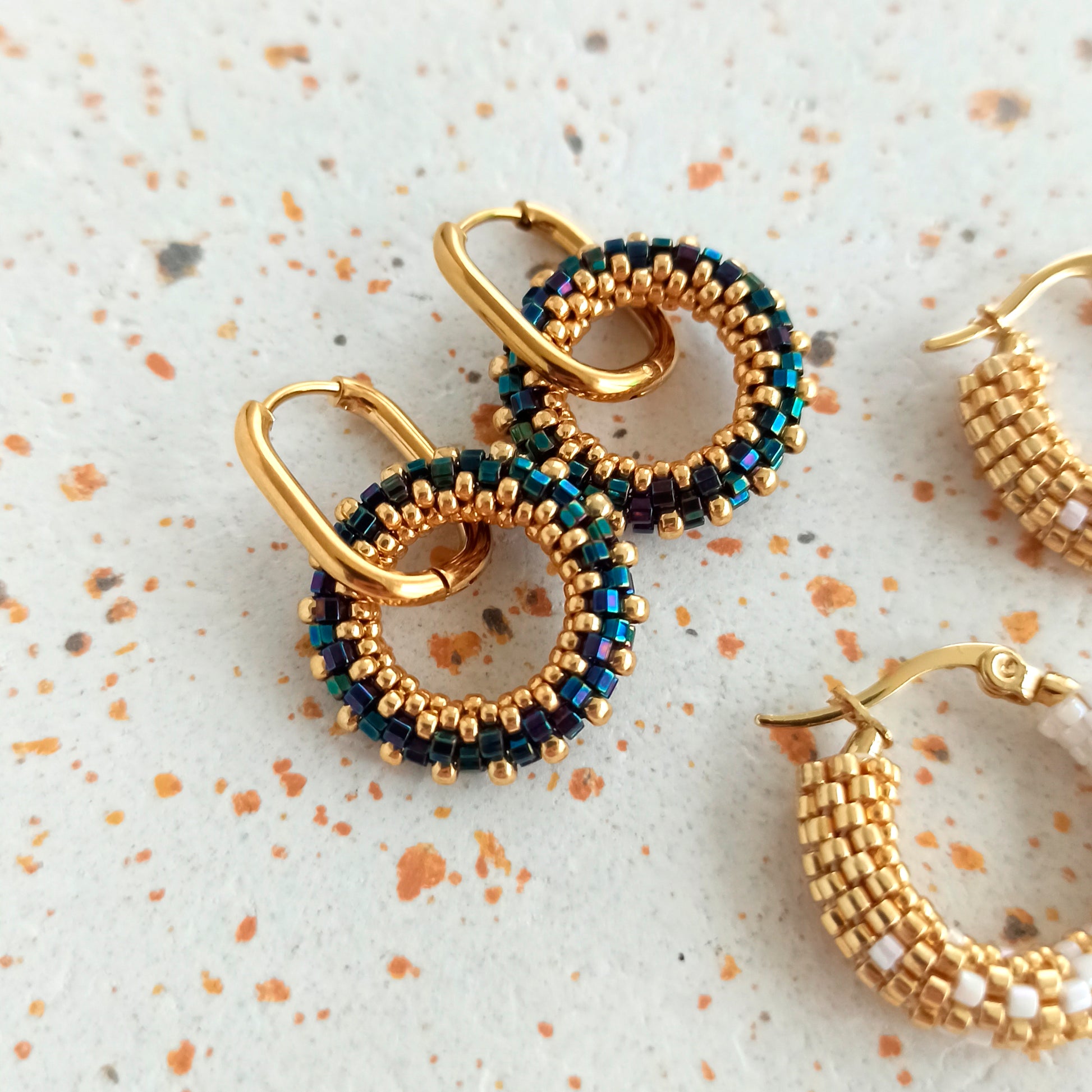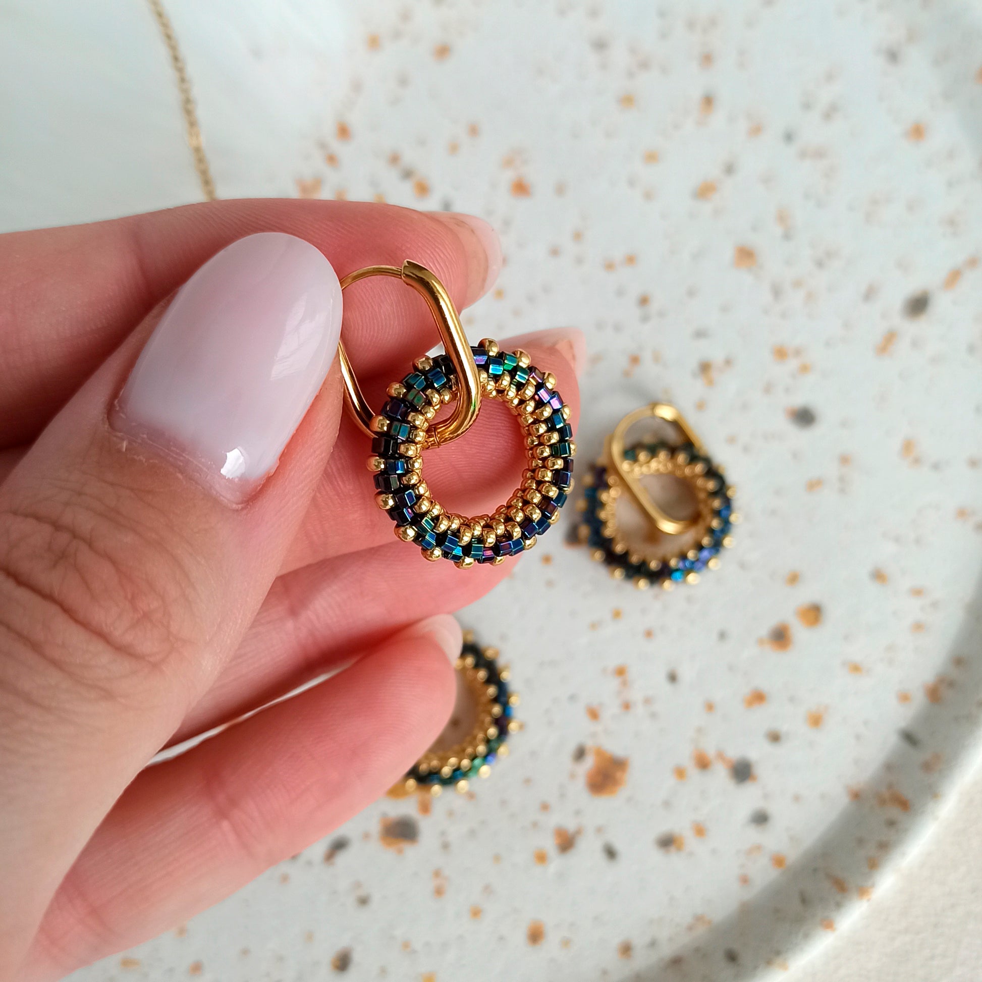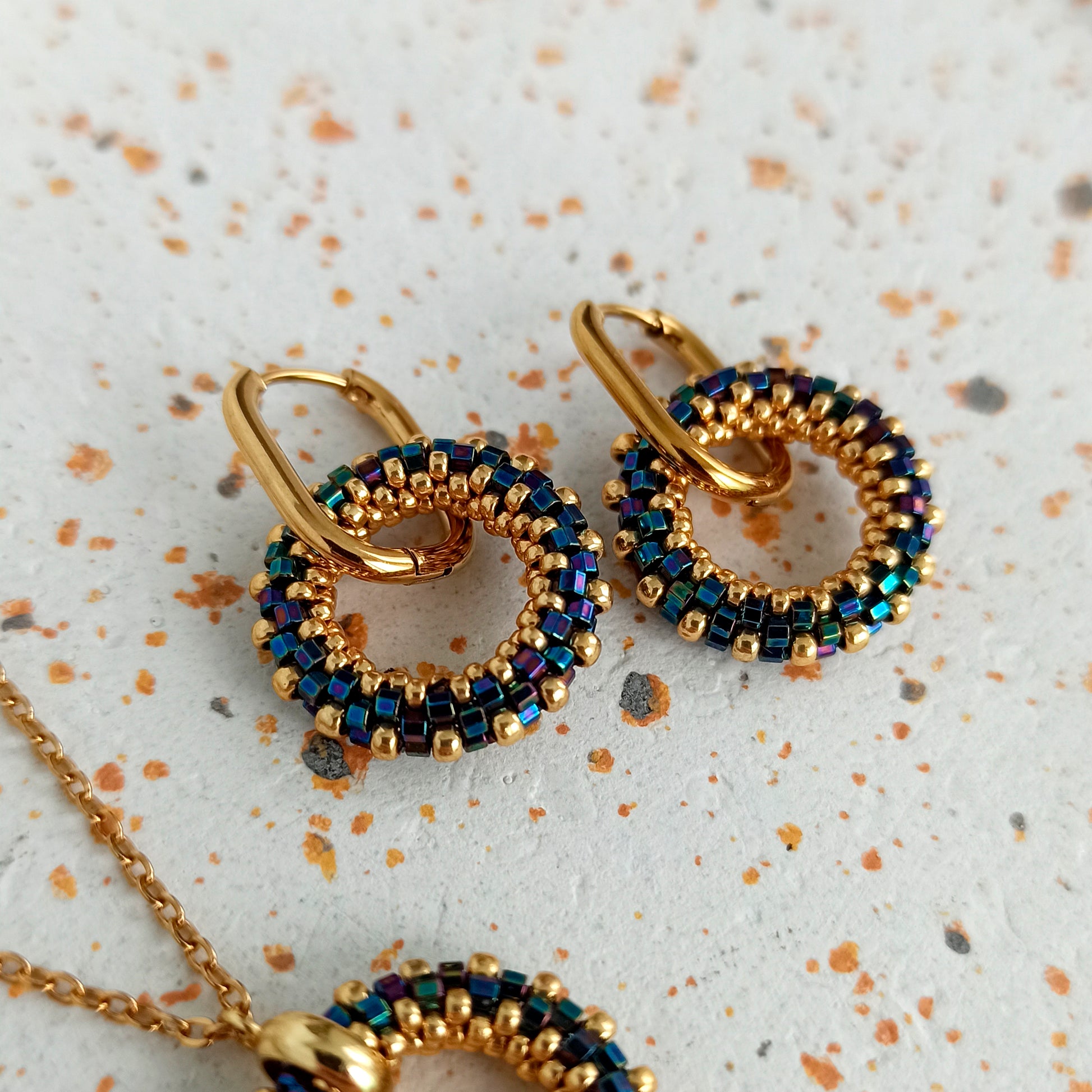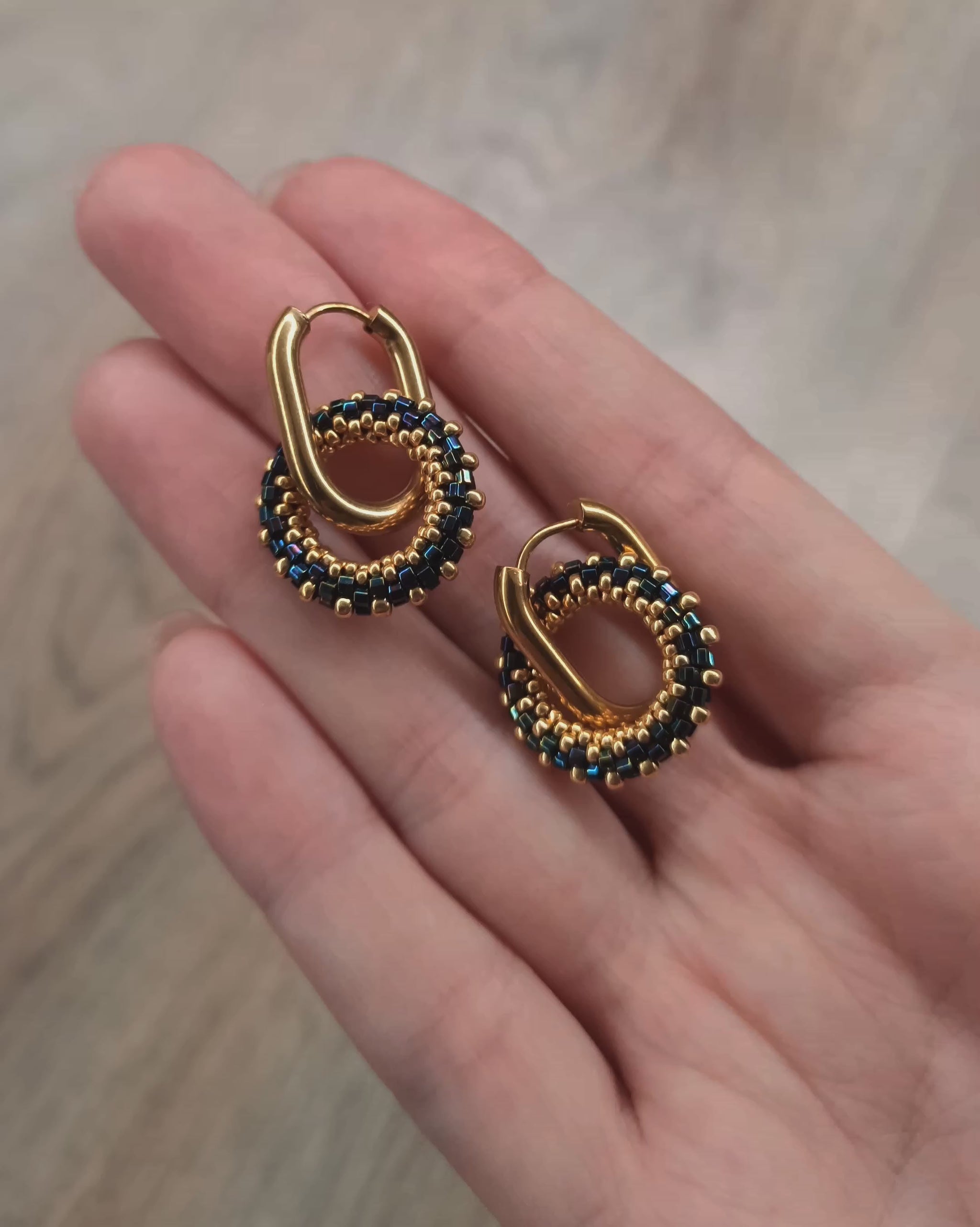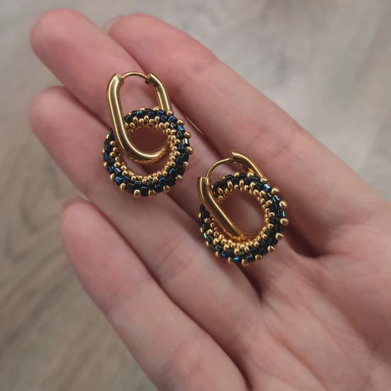 Kulatý náušnice v tmavě modré a zlaté barvě z vysoce kvalitního japonského rokajlu s odolnou povrchovou úpravou.