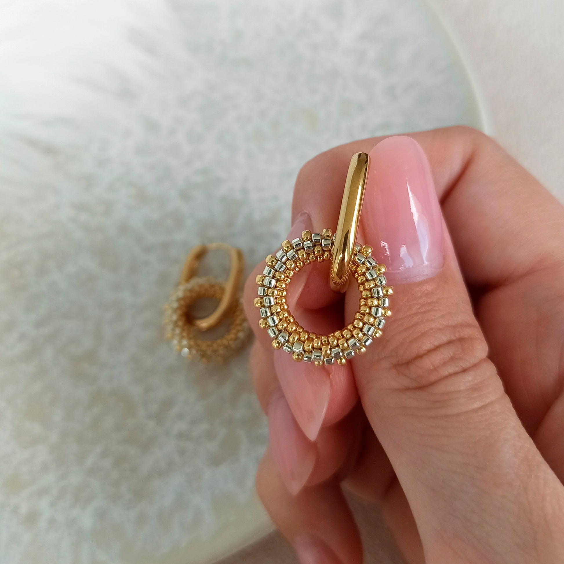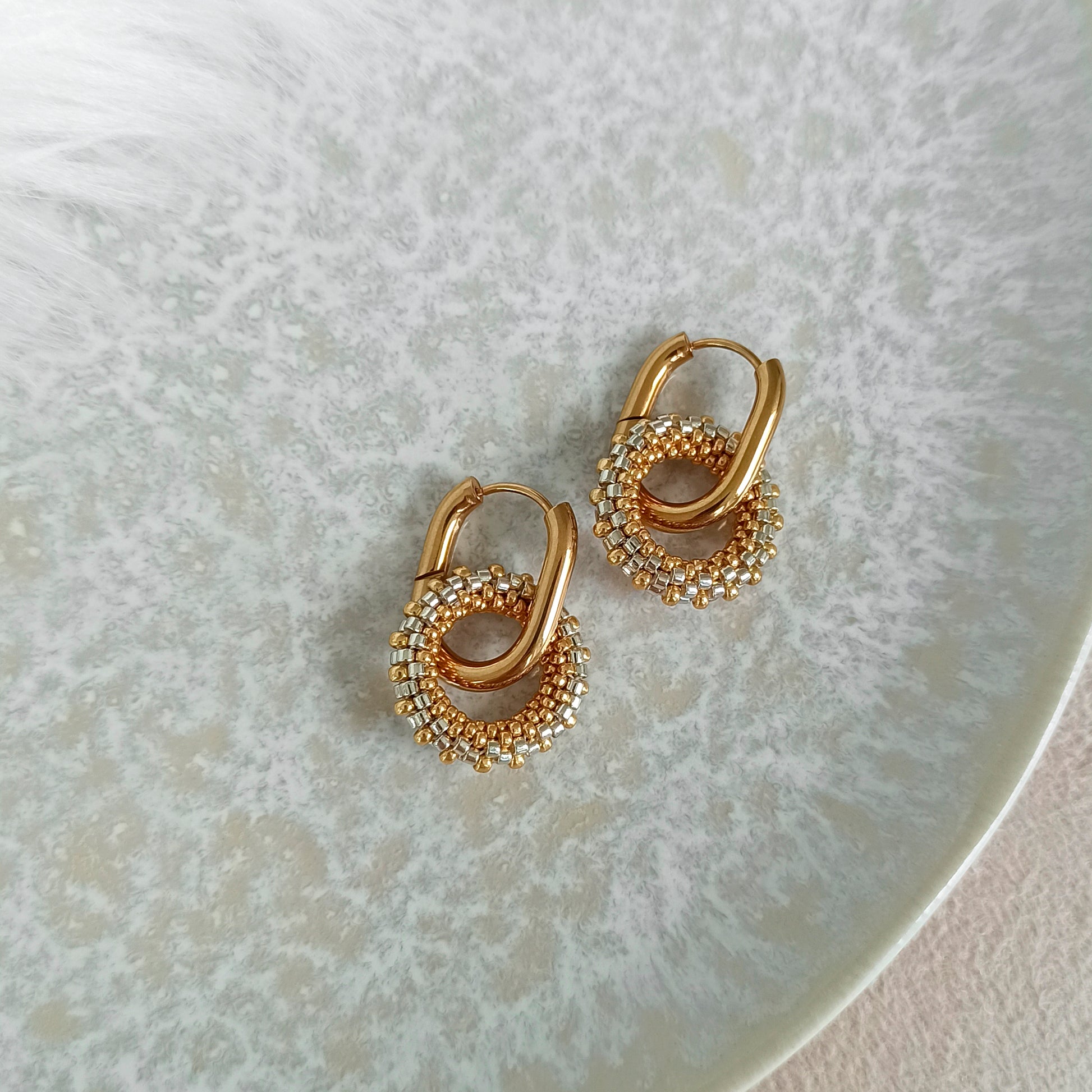 Kulatý náušnice ve stříbrno-zlatých barvách z vysoce kvalitního japonského rokajlu s odolnou povrchovou úpravou.