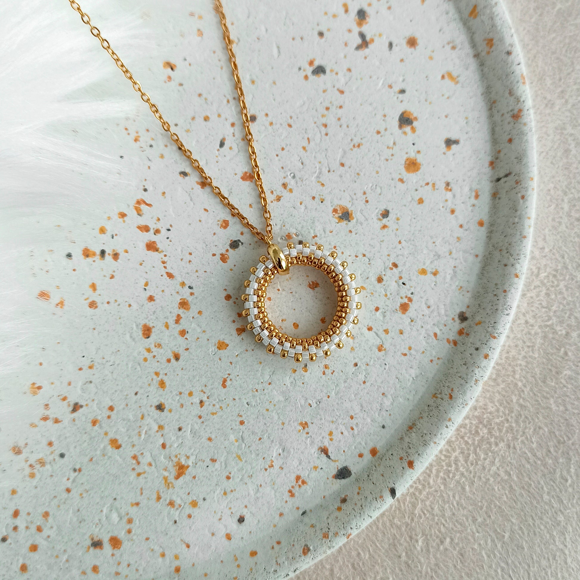 Kulatý přívěsek s řetízkem v bílo-zlaté barvě z vysoce kvalitního japonského rokajlu s odolnou povrchovou úpravou.