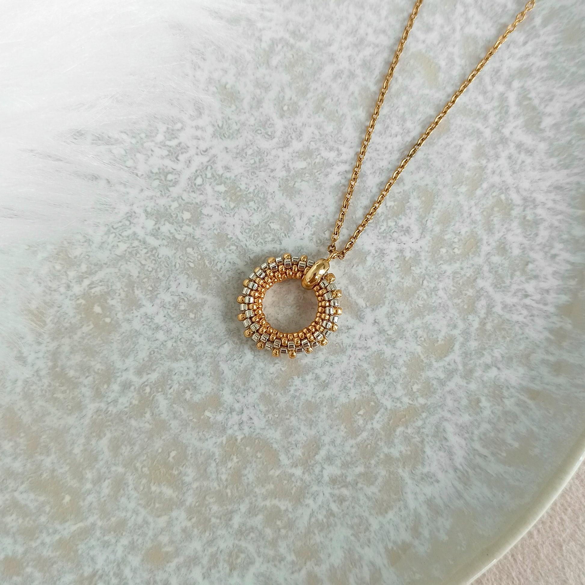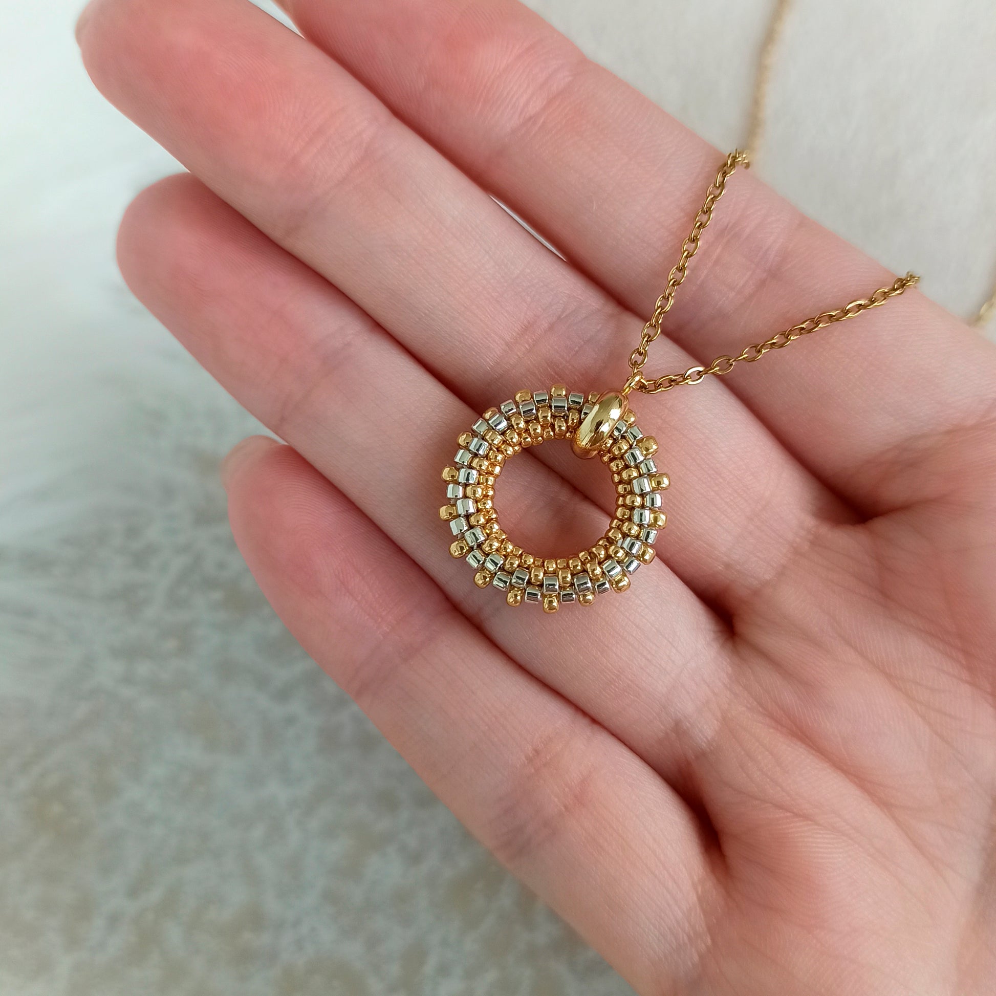 Kulatý přívěsek s řetízkem ve stříbrno-zlatých barvách z vysoce kvalitního japonského rokajlu s odolnou povrchovou úpravou.