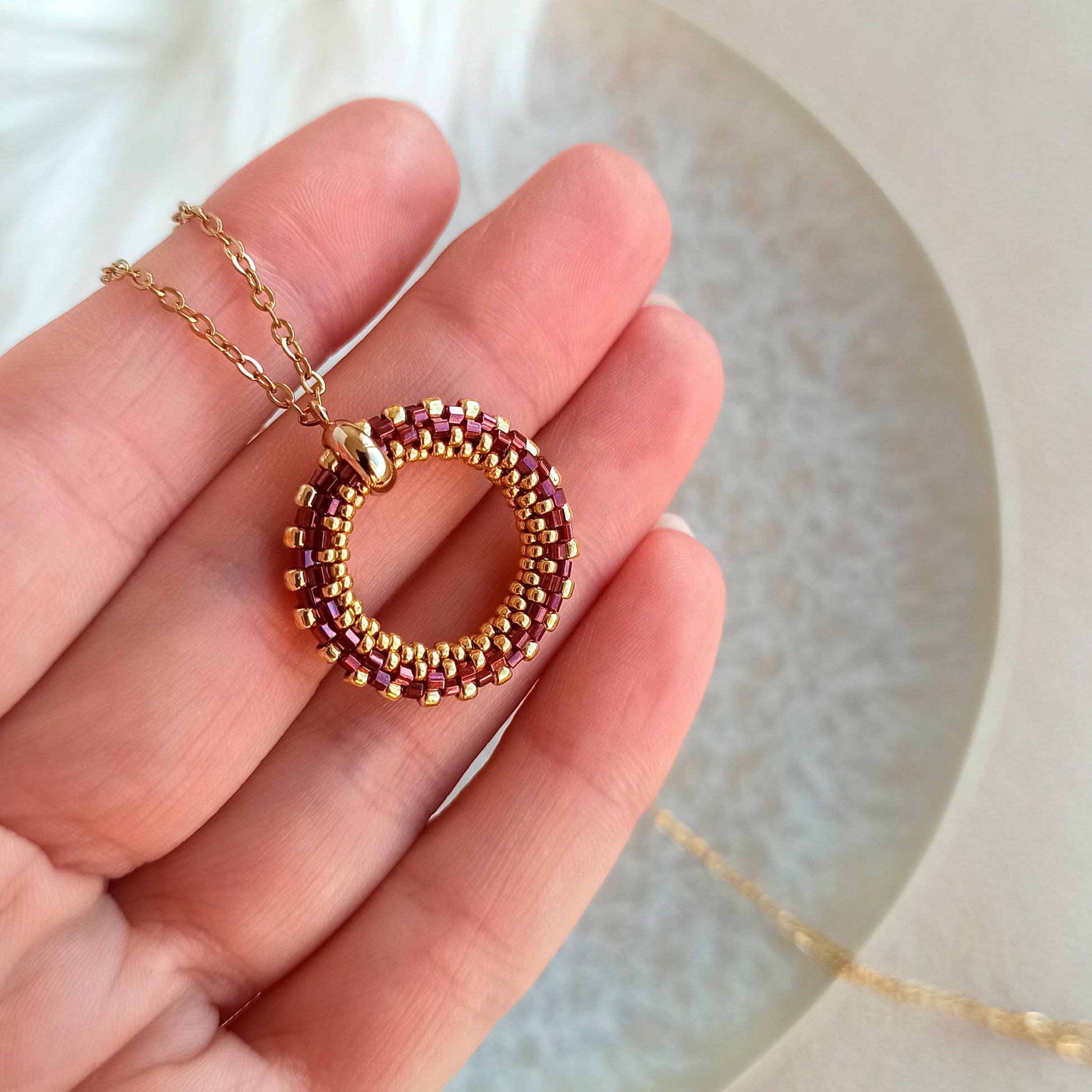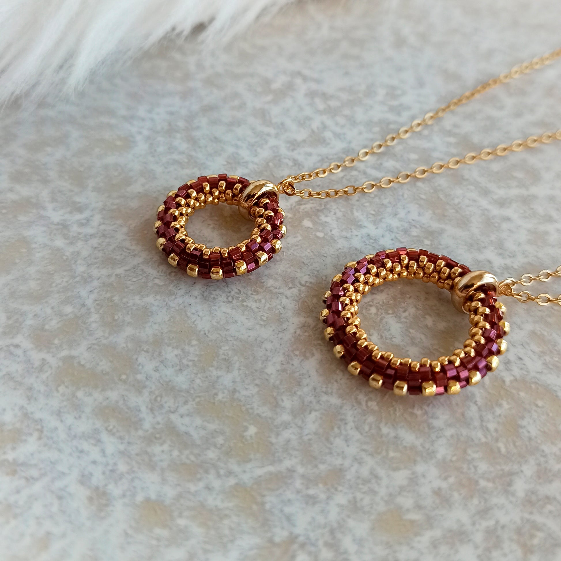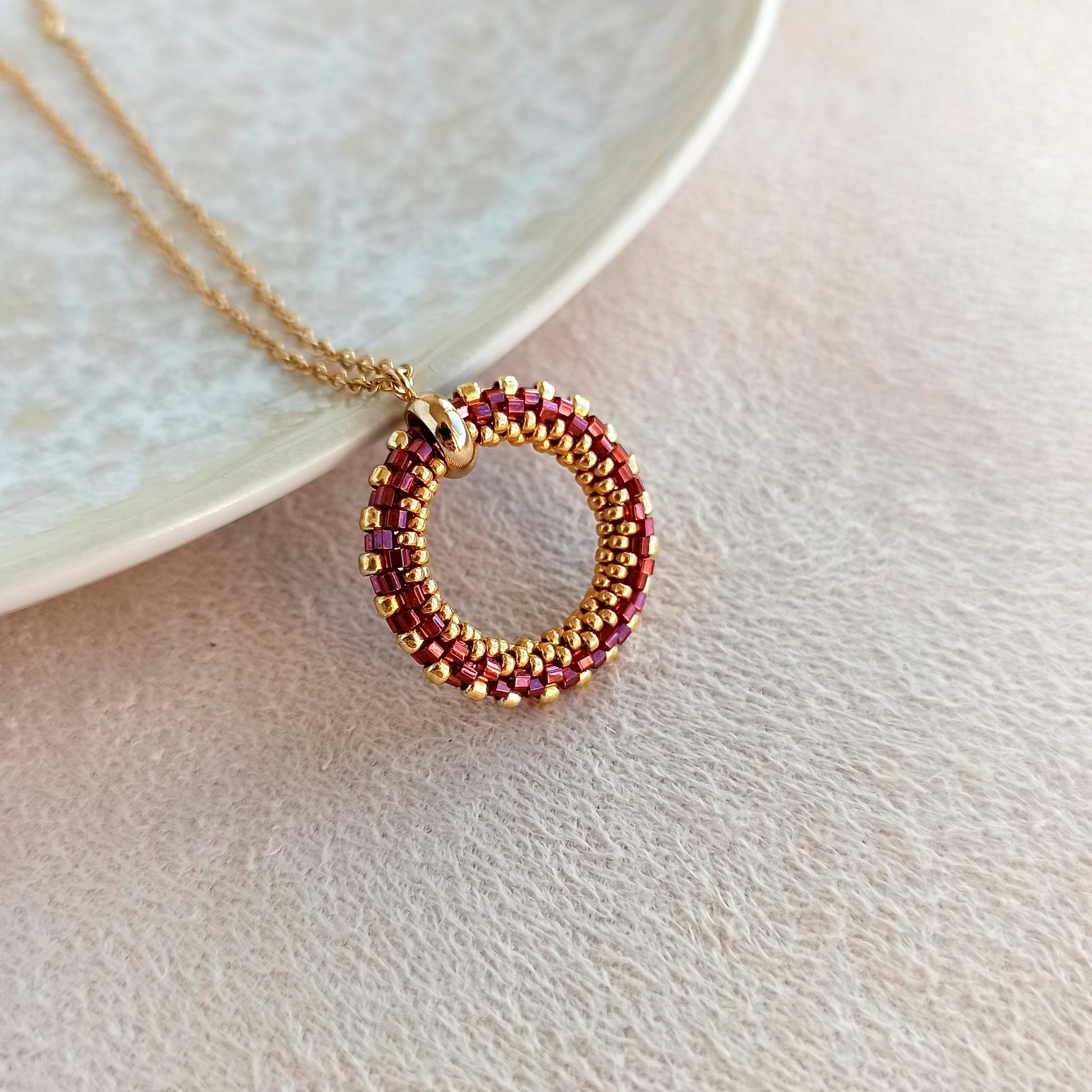 Ručně vyráběný přívěsek z japonského korálku v granátové barvě s jemným leskem díky broušeným hranám.