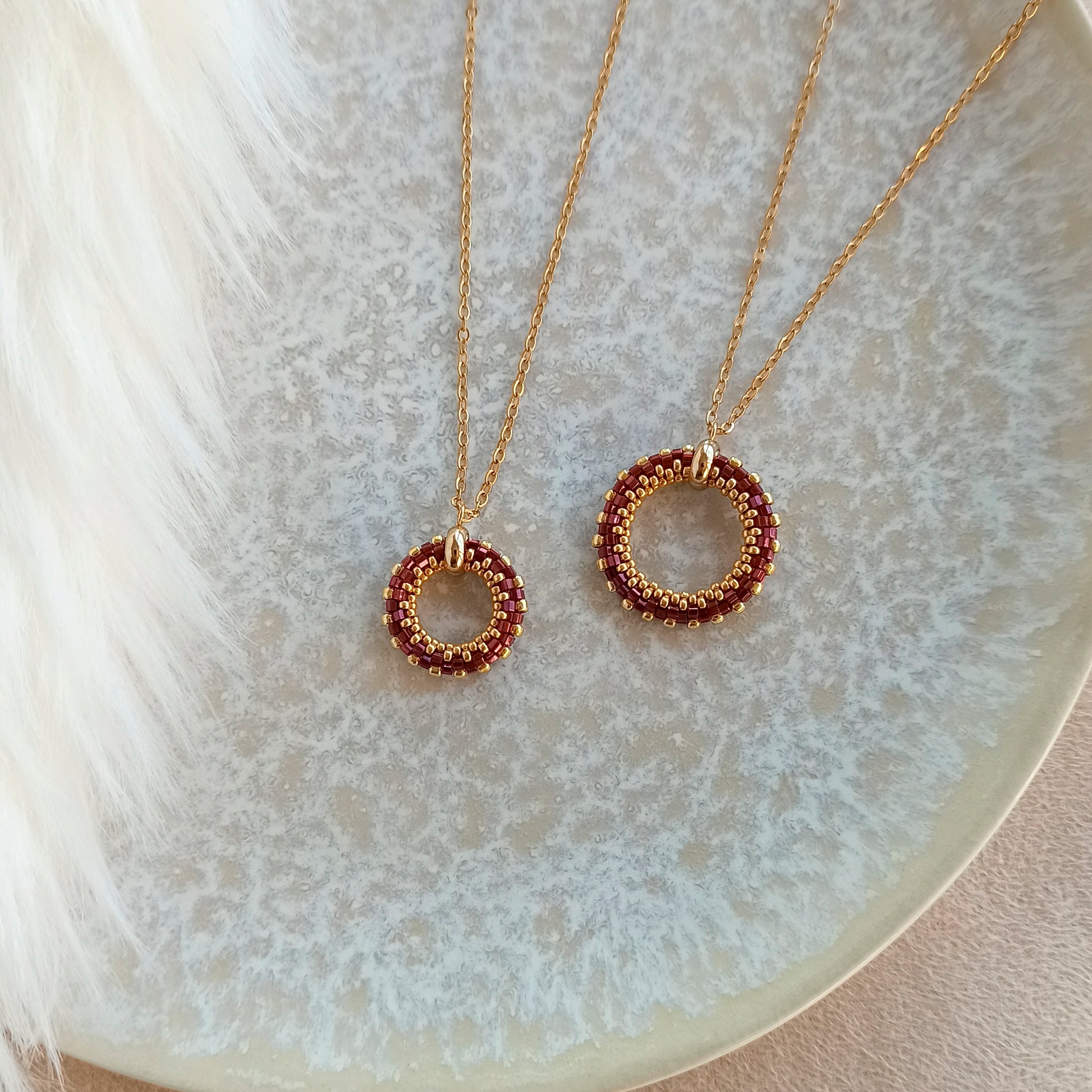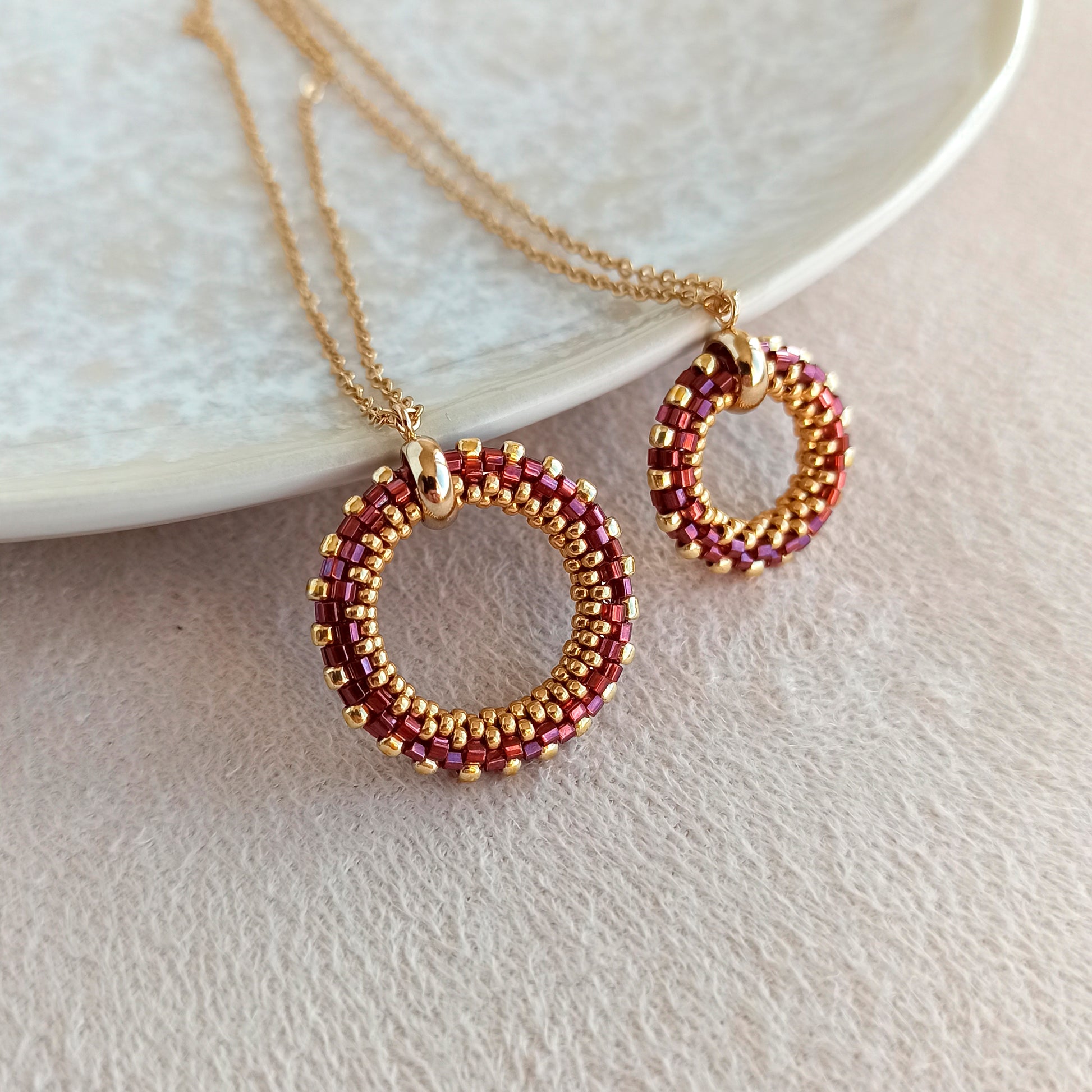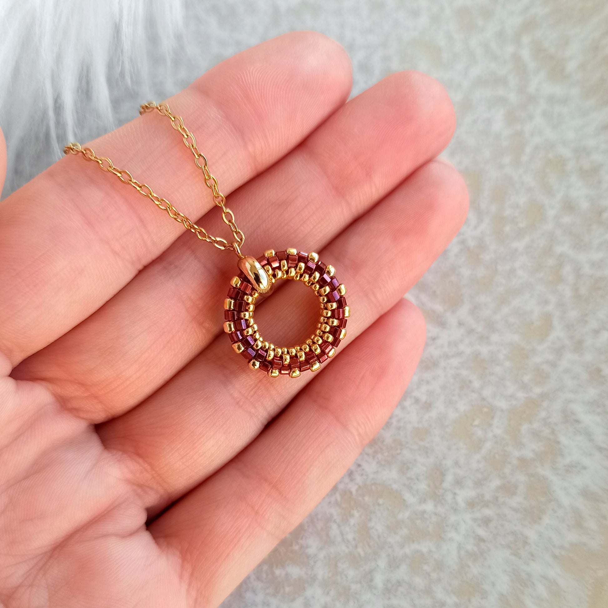 Ručně vyráběný přívěsek z japonského korálku v granátové barvě s jemným leskem díky broušeným hranám.