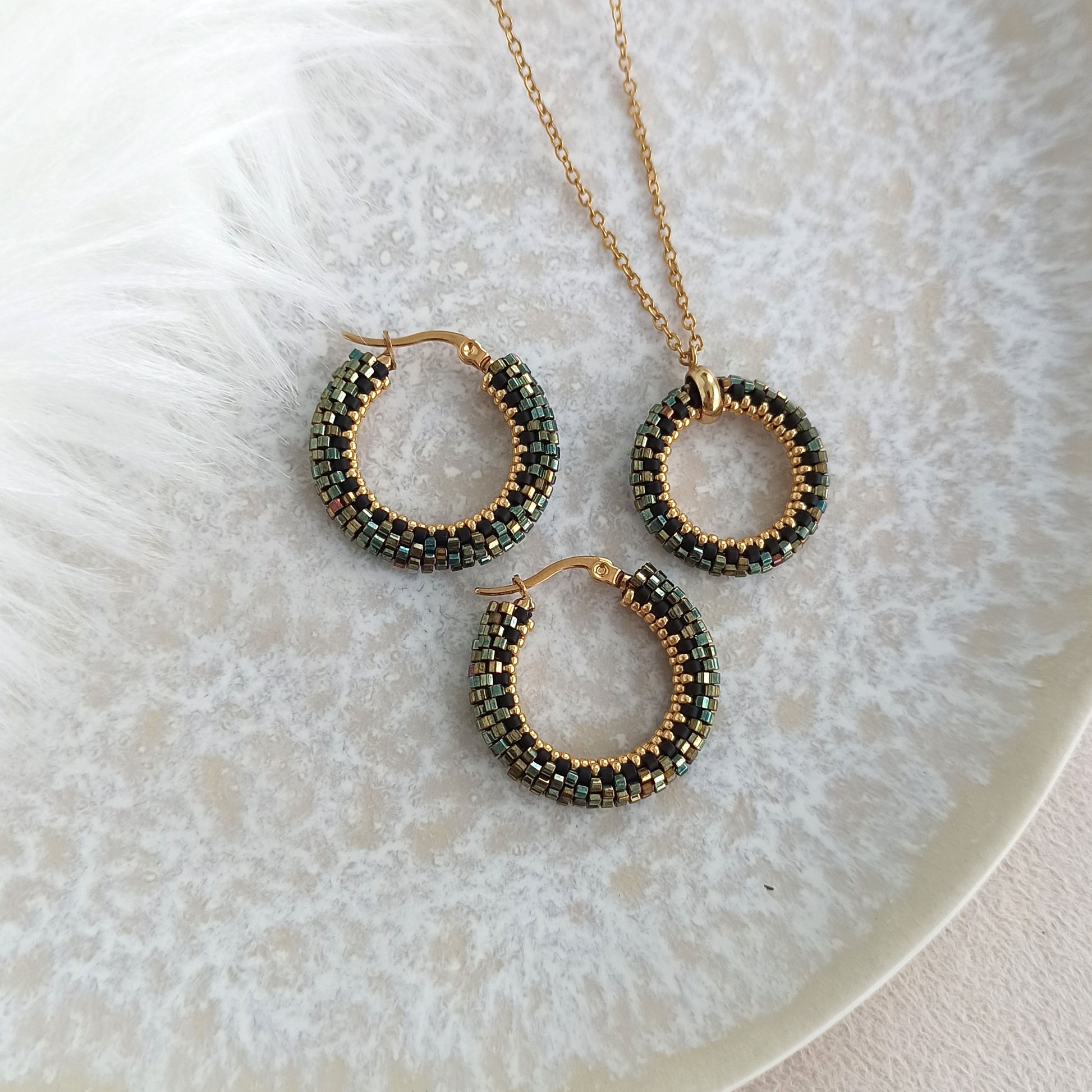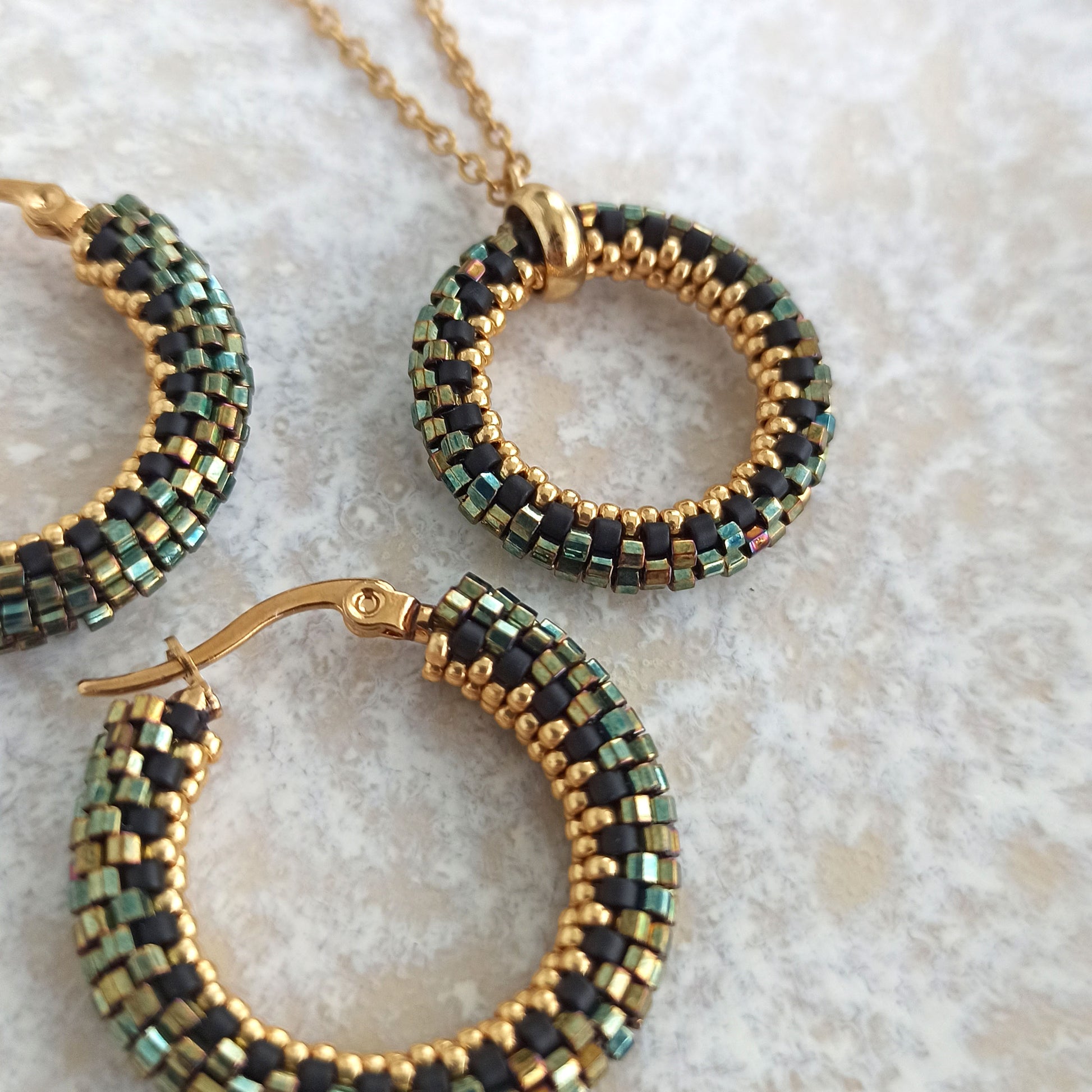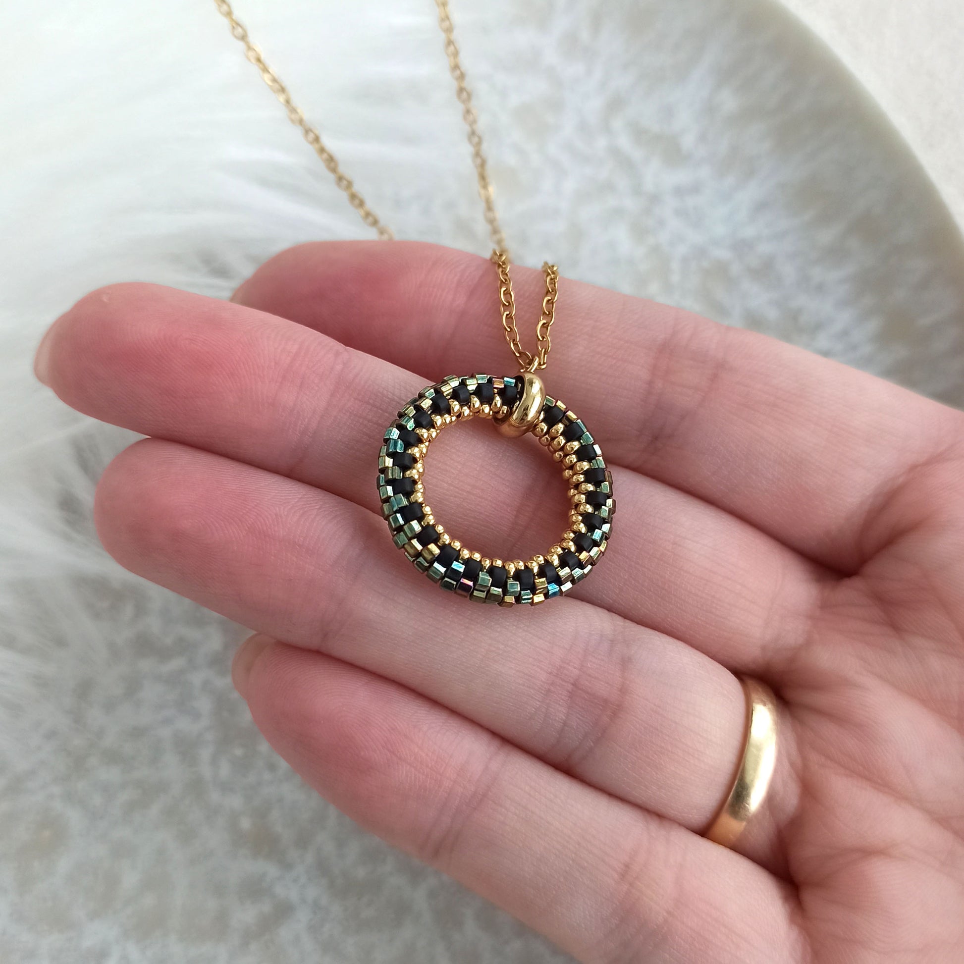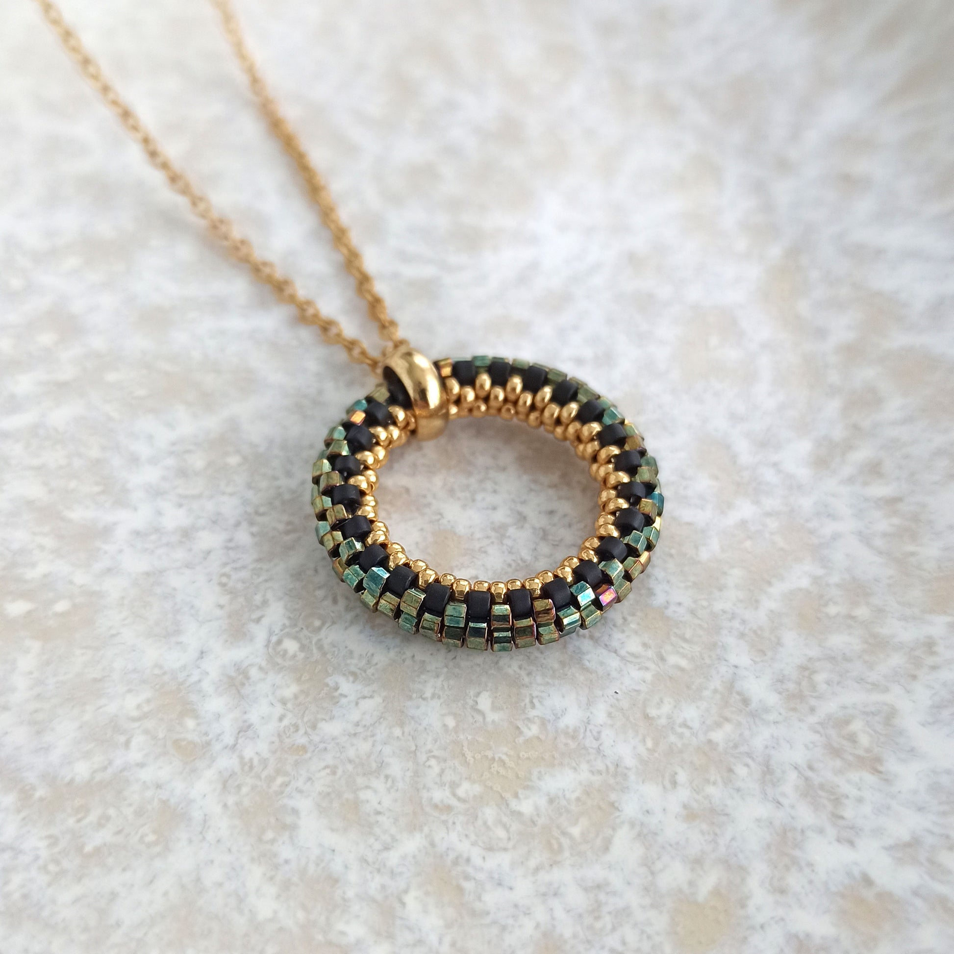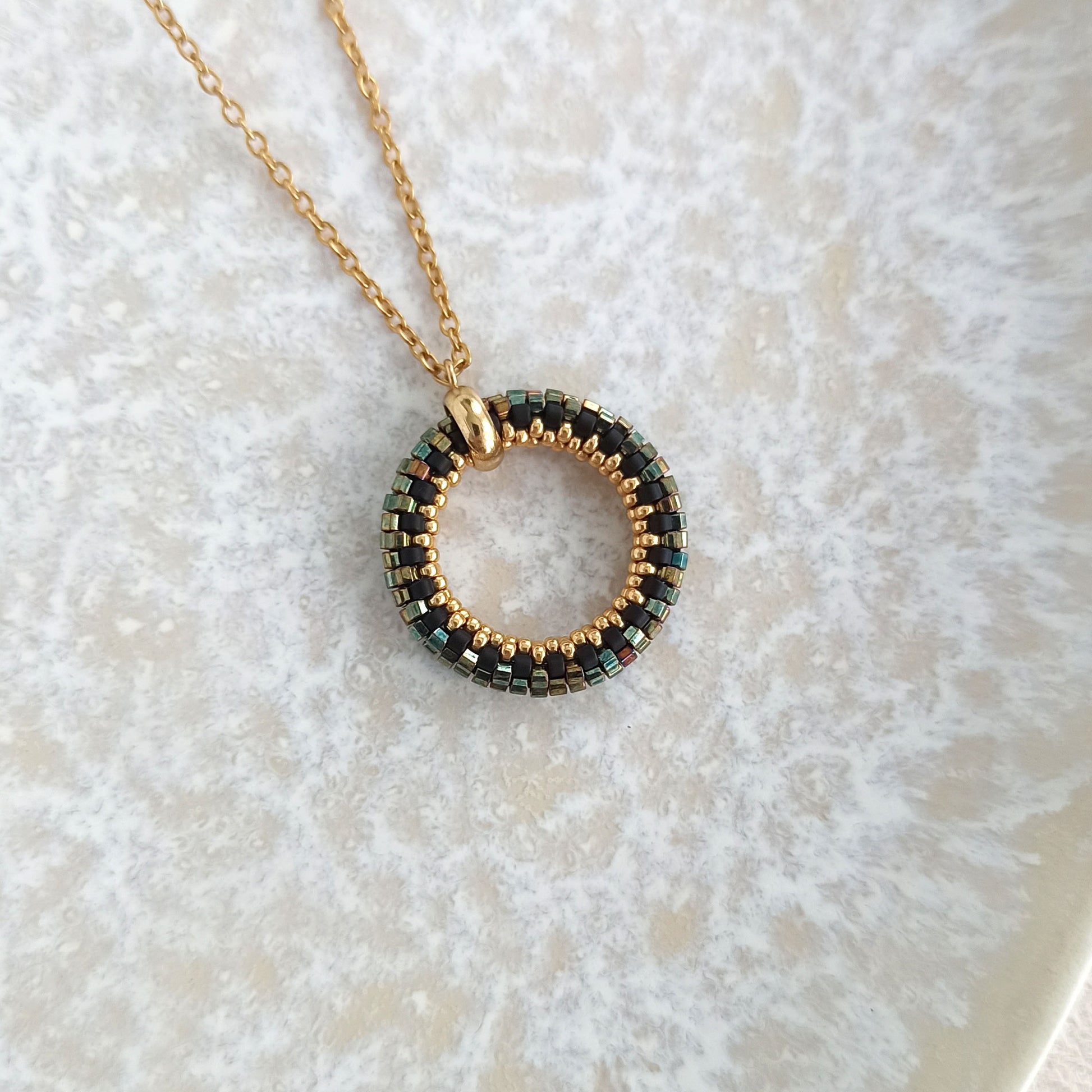 Přívěsek v třpytivých zeleno-zlatých barvách. Je vyroben z vysoce kvalitních japonských korálků a zapínání z oceli s pozlacením.