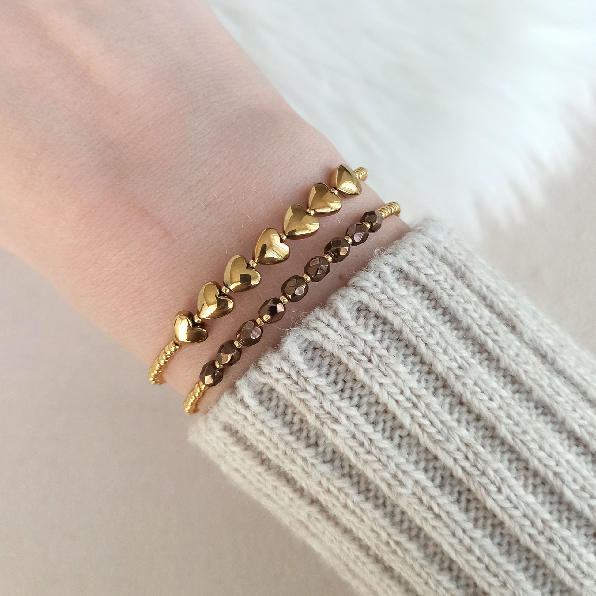 Sada náramků se skládá z náramku s pozlacenými srdíčky z hematitu a z náramku s broušenými korálky české výroby.