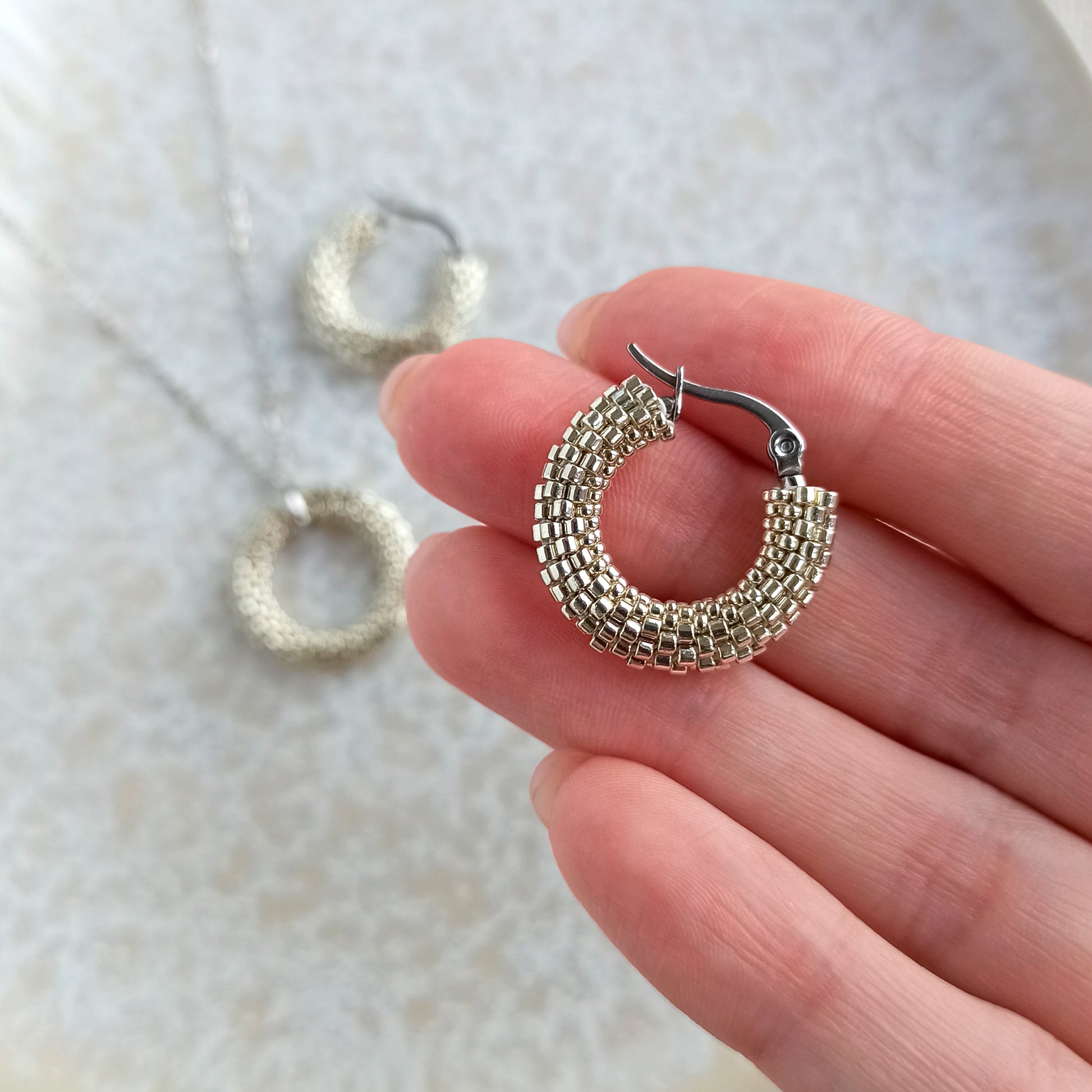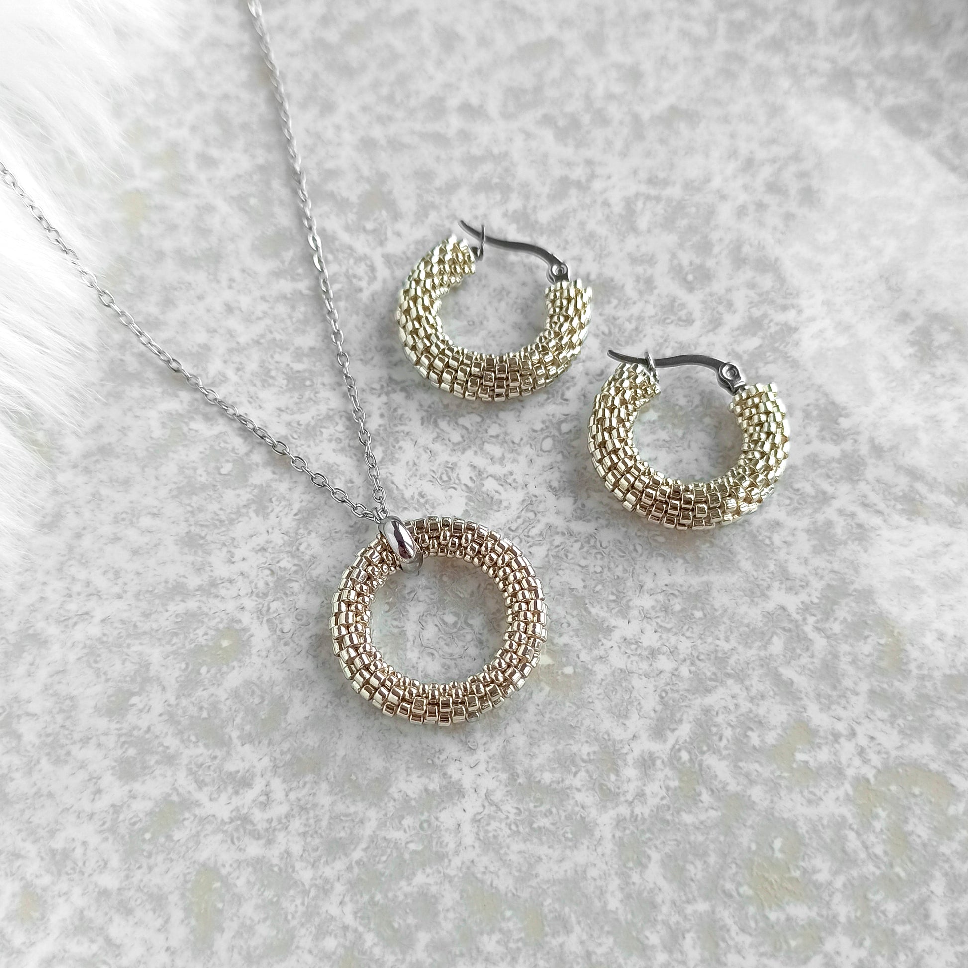 Sada šperků skládající se z náušnic a přívěsku ve stříbrné barvě.