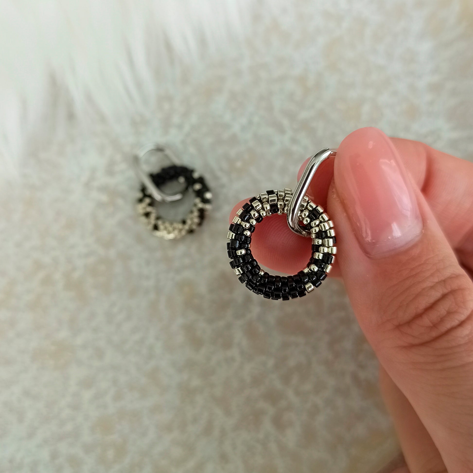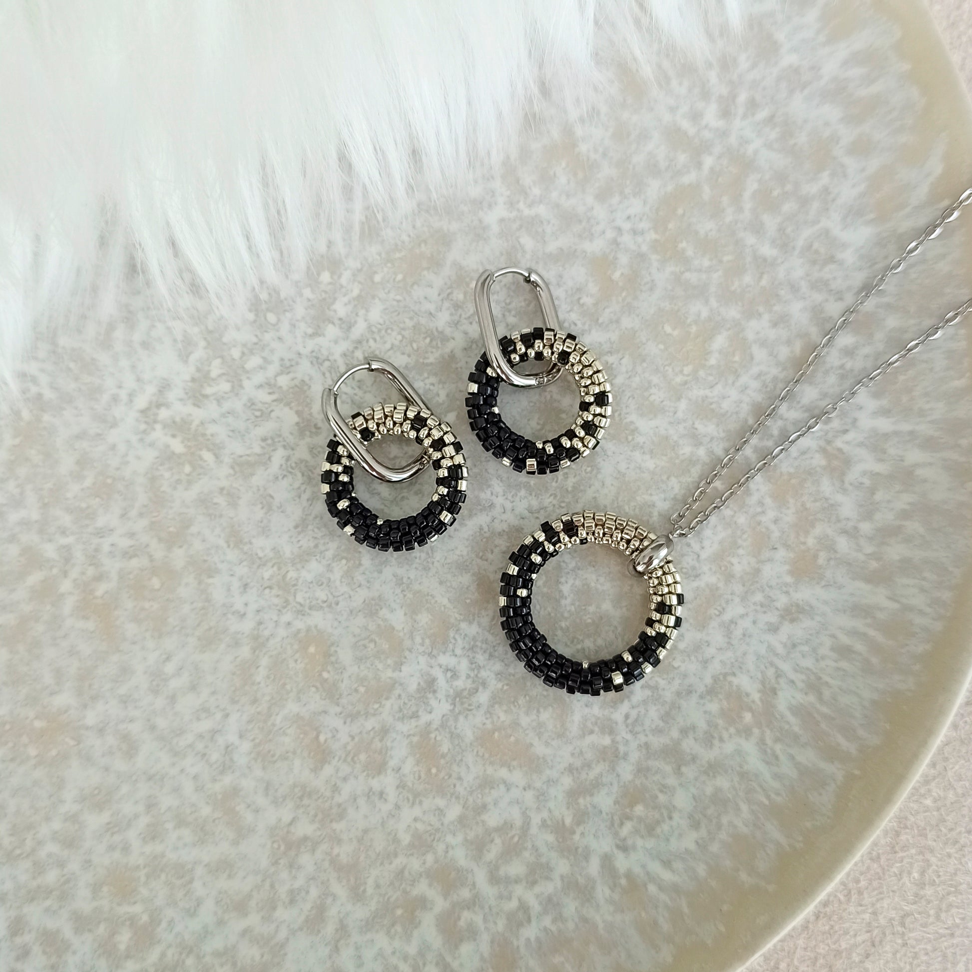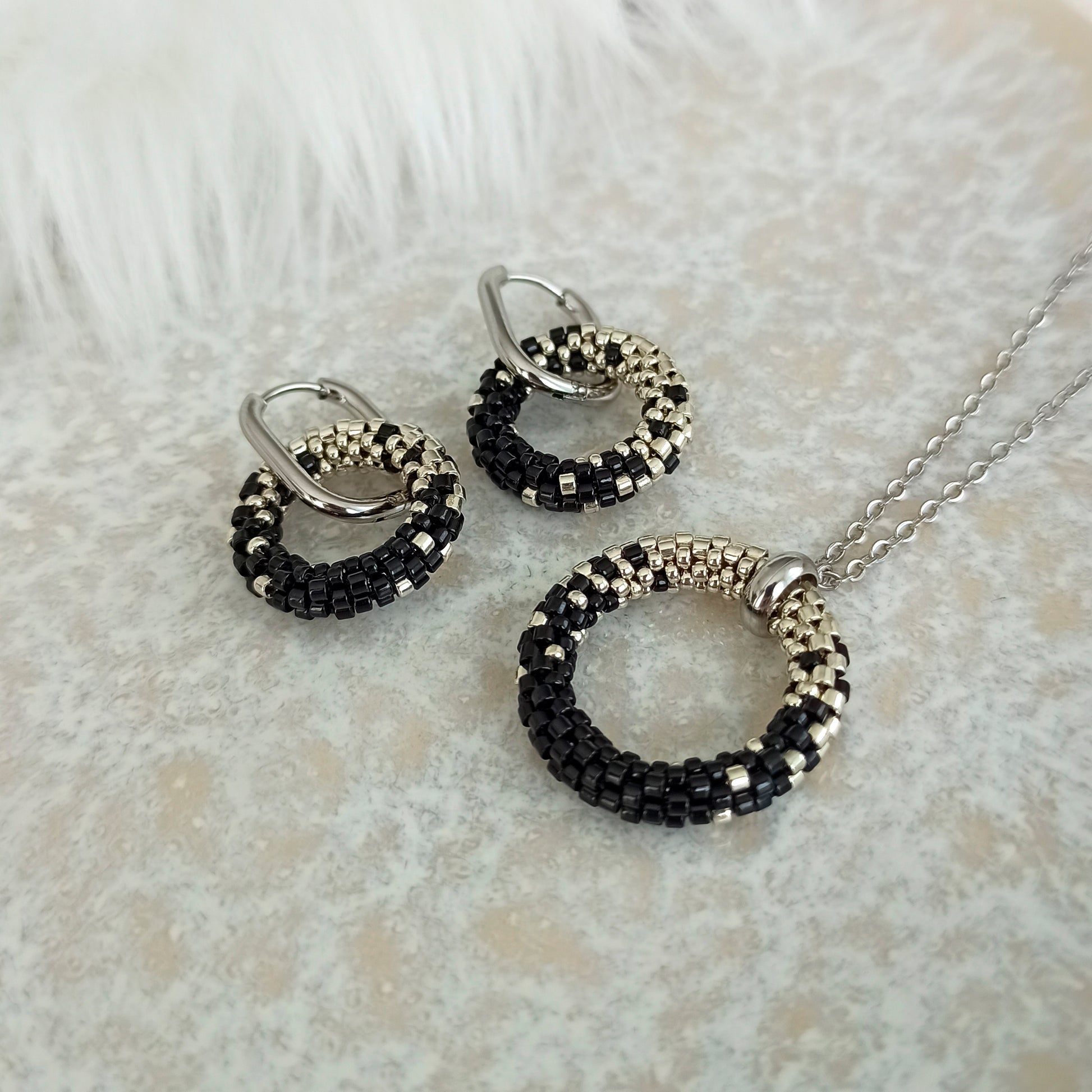 Sada šperků se skládá z náušnic a přívěsku v černo-stříbrných barvách.