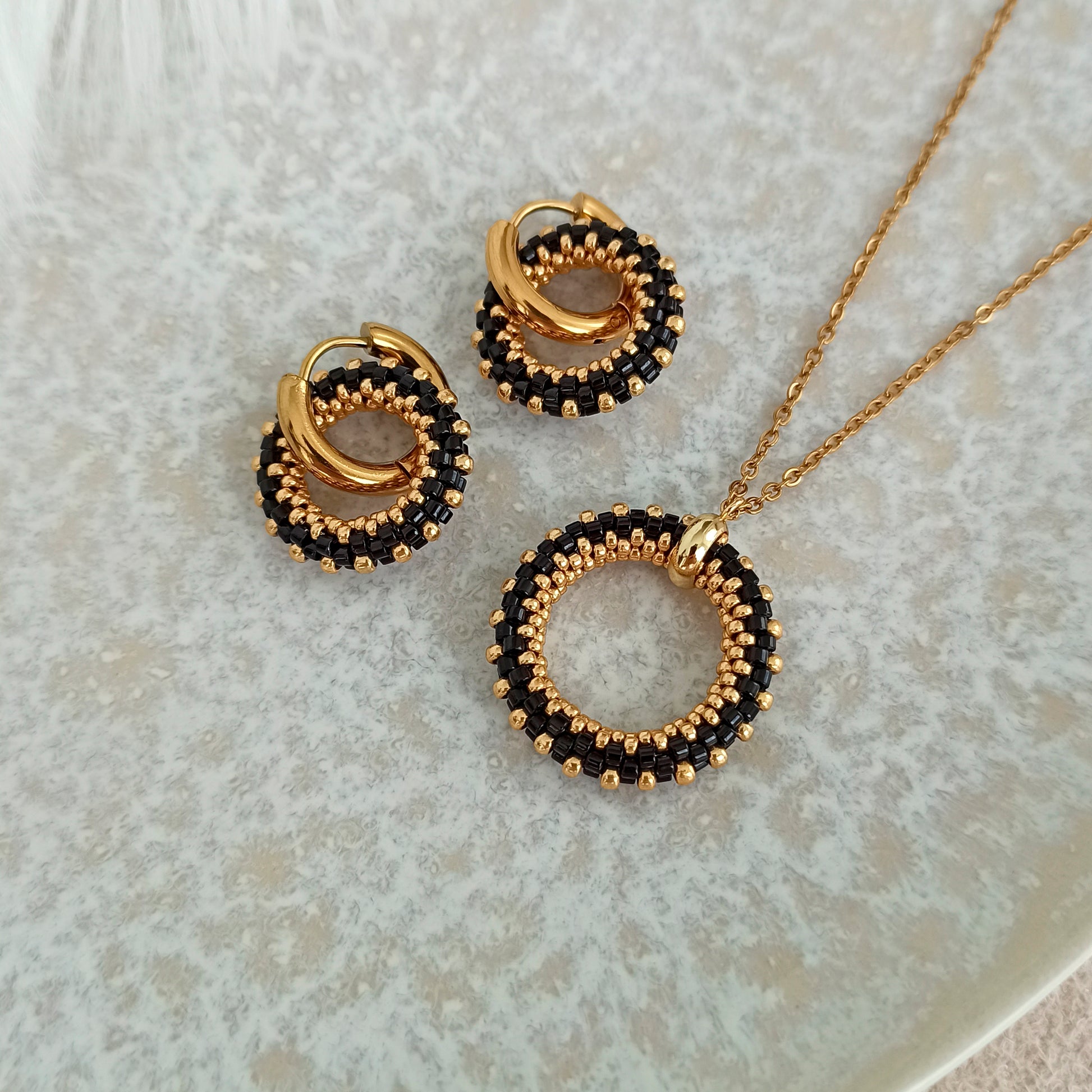 Sada šperků skládající se z náušnic a přívěsku v černo-zlaté barvě.
