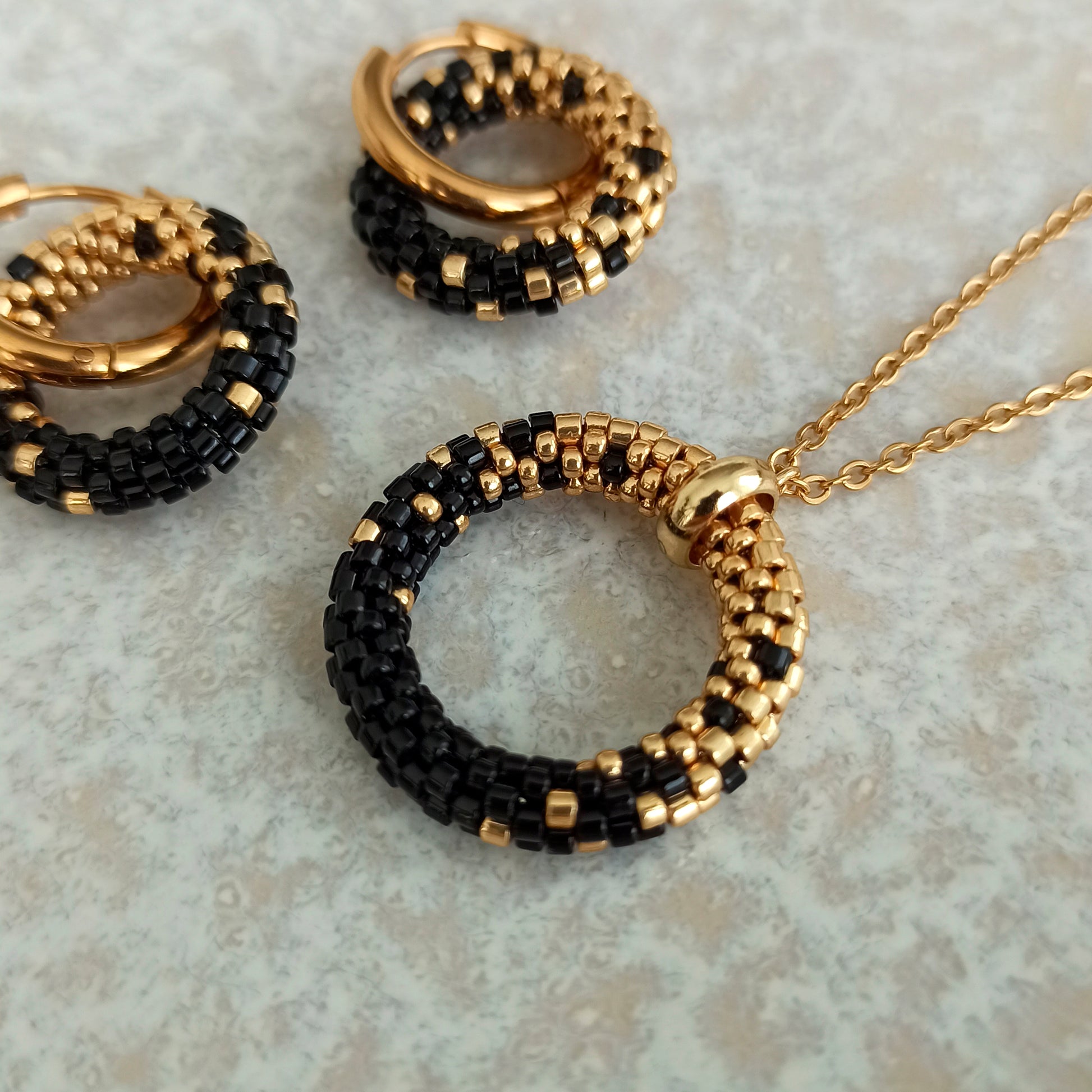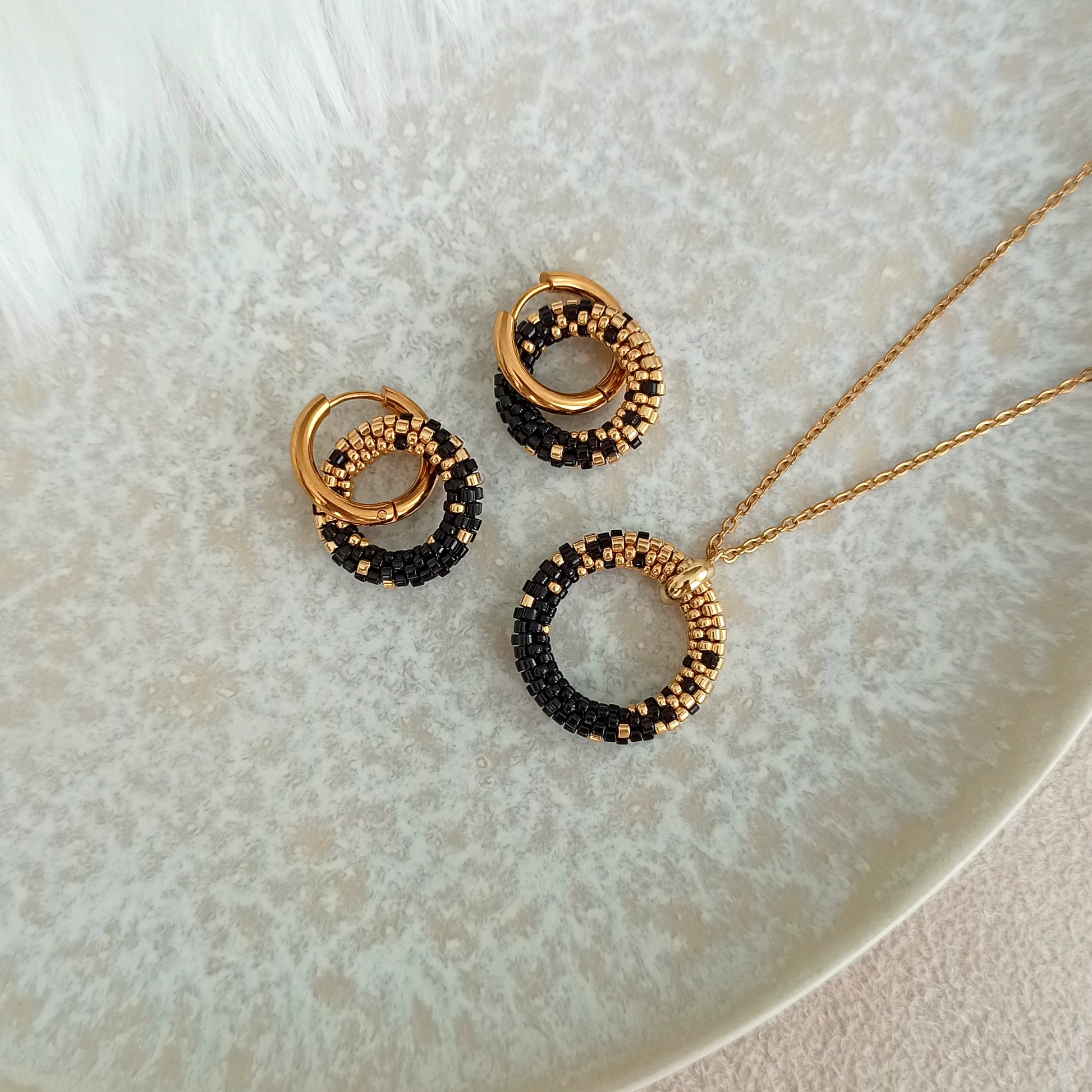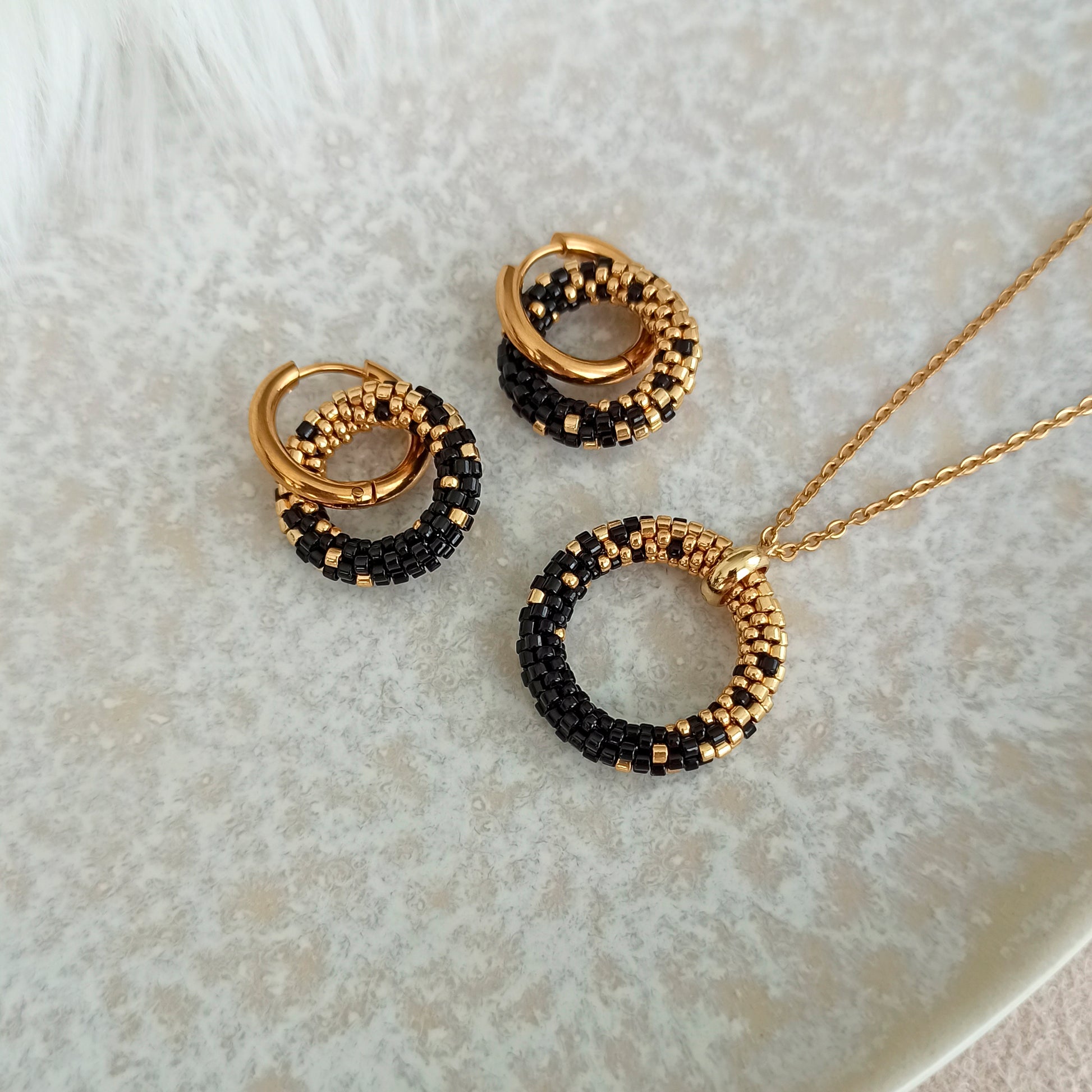 Elegantní sada šperků obsahuje náušnice a přívěsek v černo-zlaté barevné kombinaci.