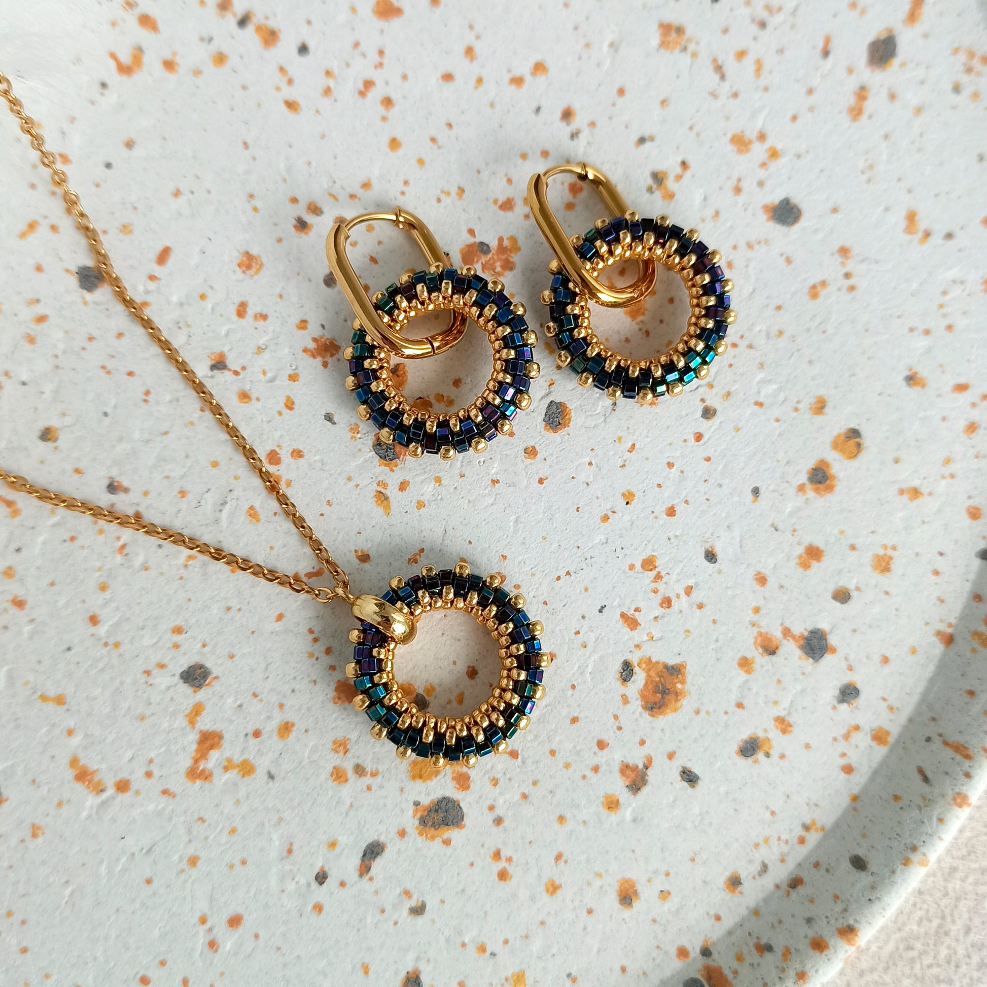 Sada šperků skládající se z náušnic a přívěsku v tmavě modré a zlaté barvě.