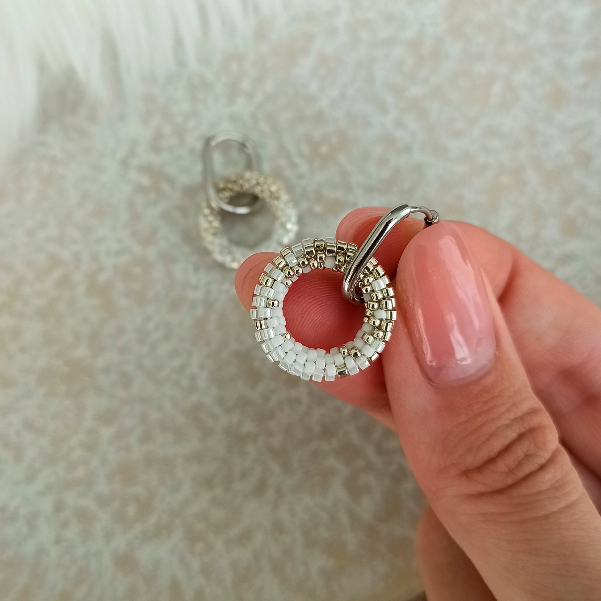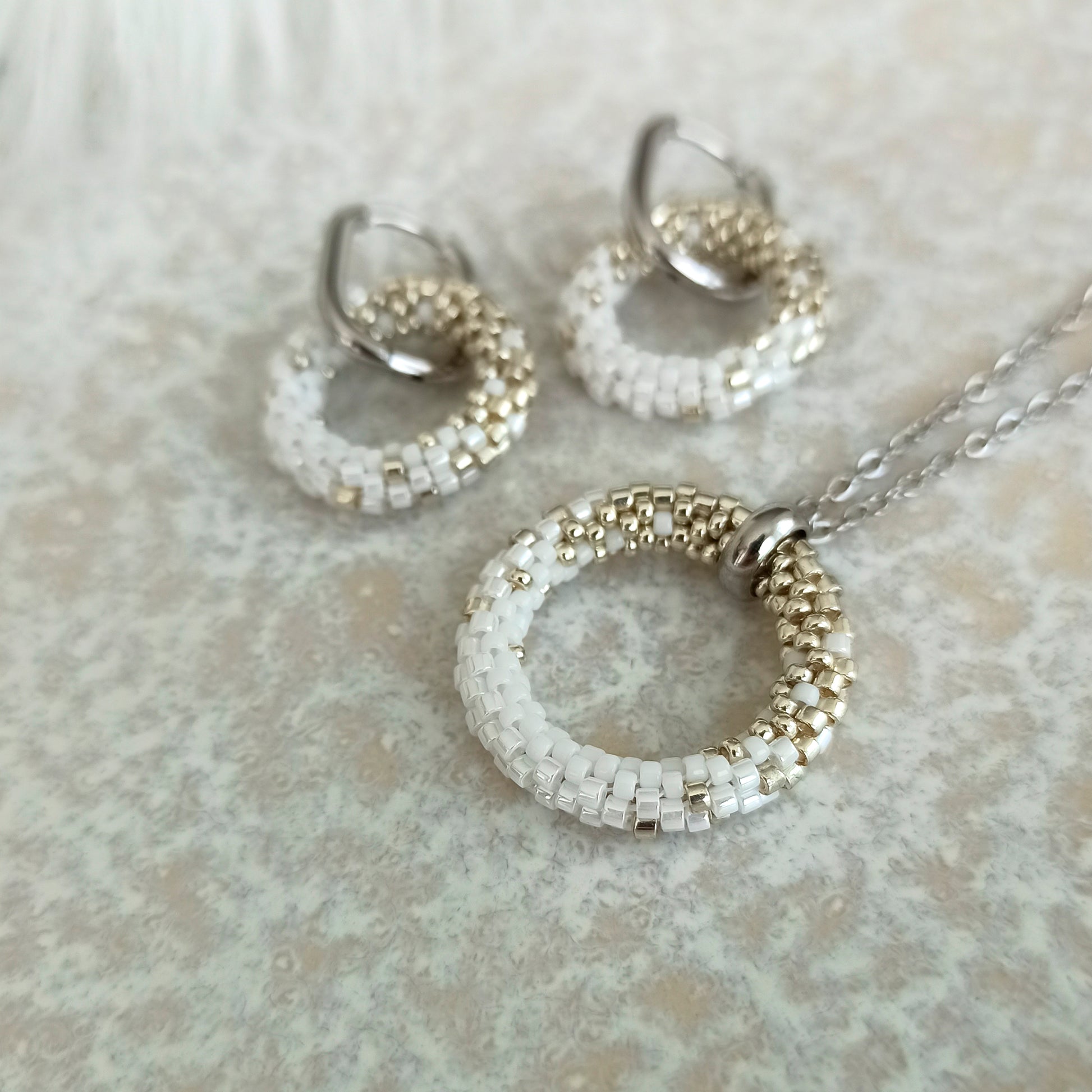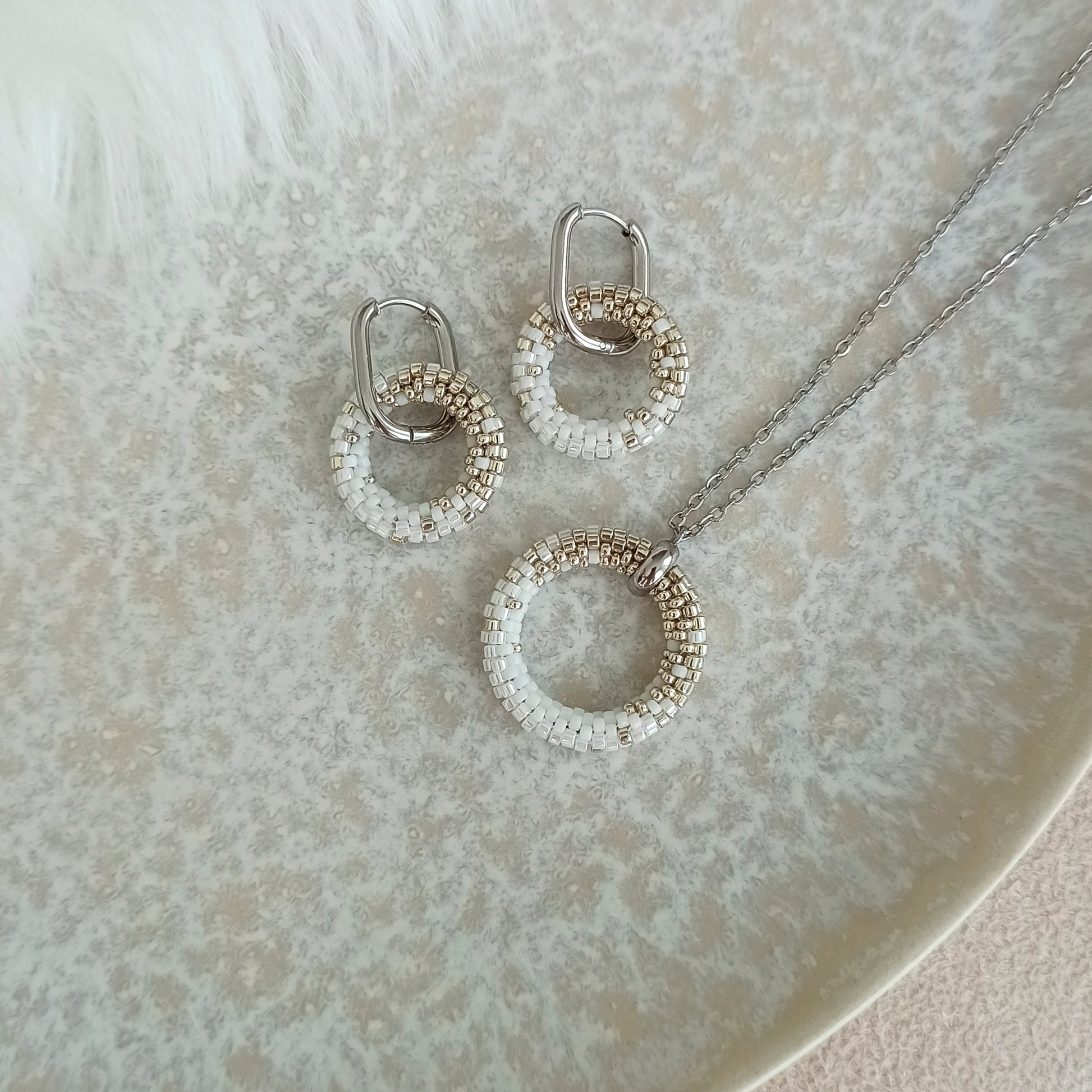 Sada šperků se skládá z náušnic a přívěsku v bílo-stříbrných barvách.