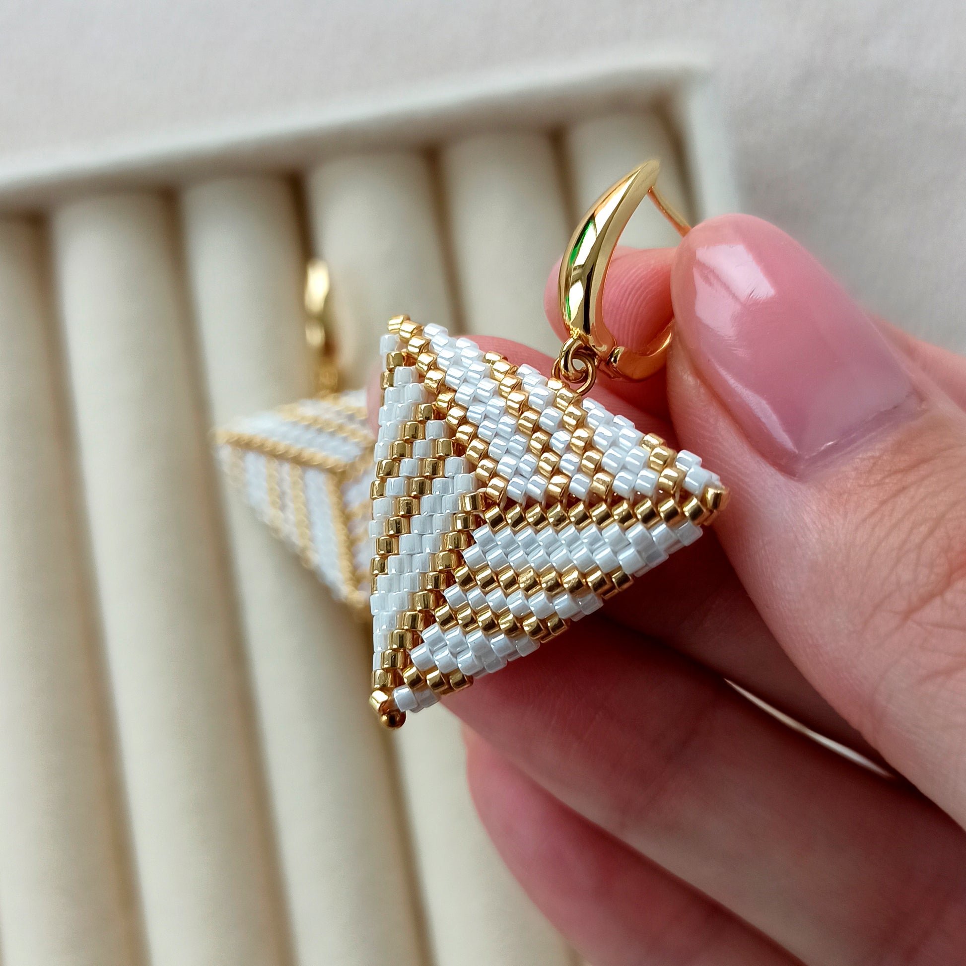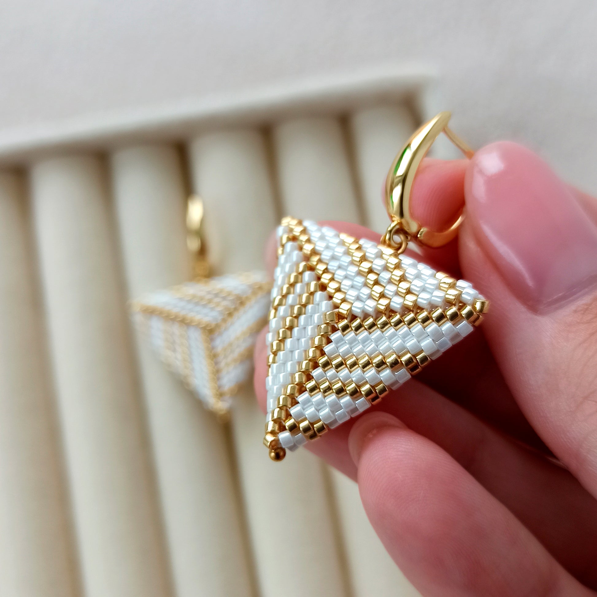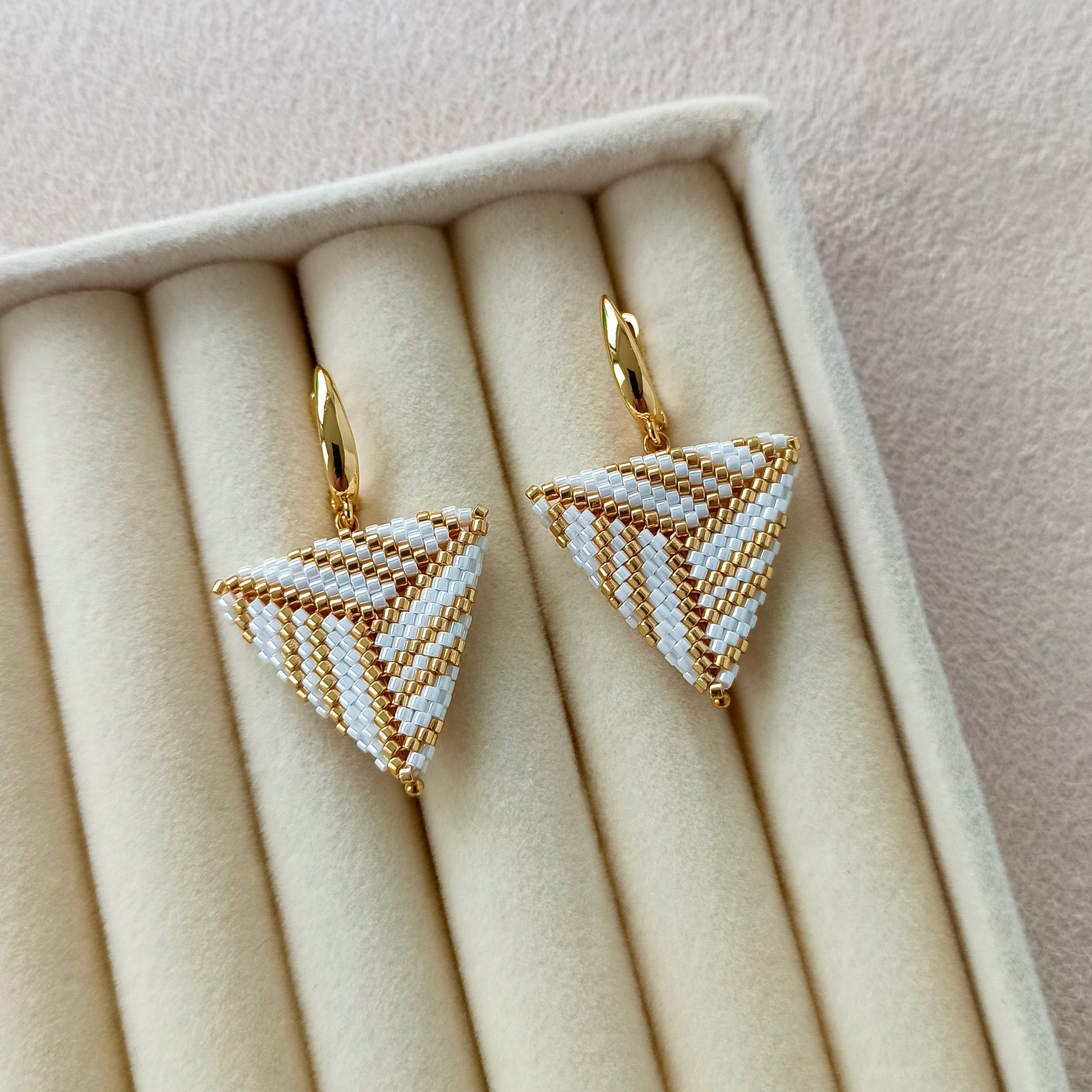 Ručně vyráběné trojúhelníkové náušnice z vysoce kvalitního japonského rokajlu v bílo-zlaté nebo bílo-stříbrné kombinaci.