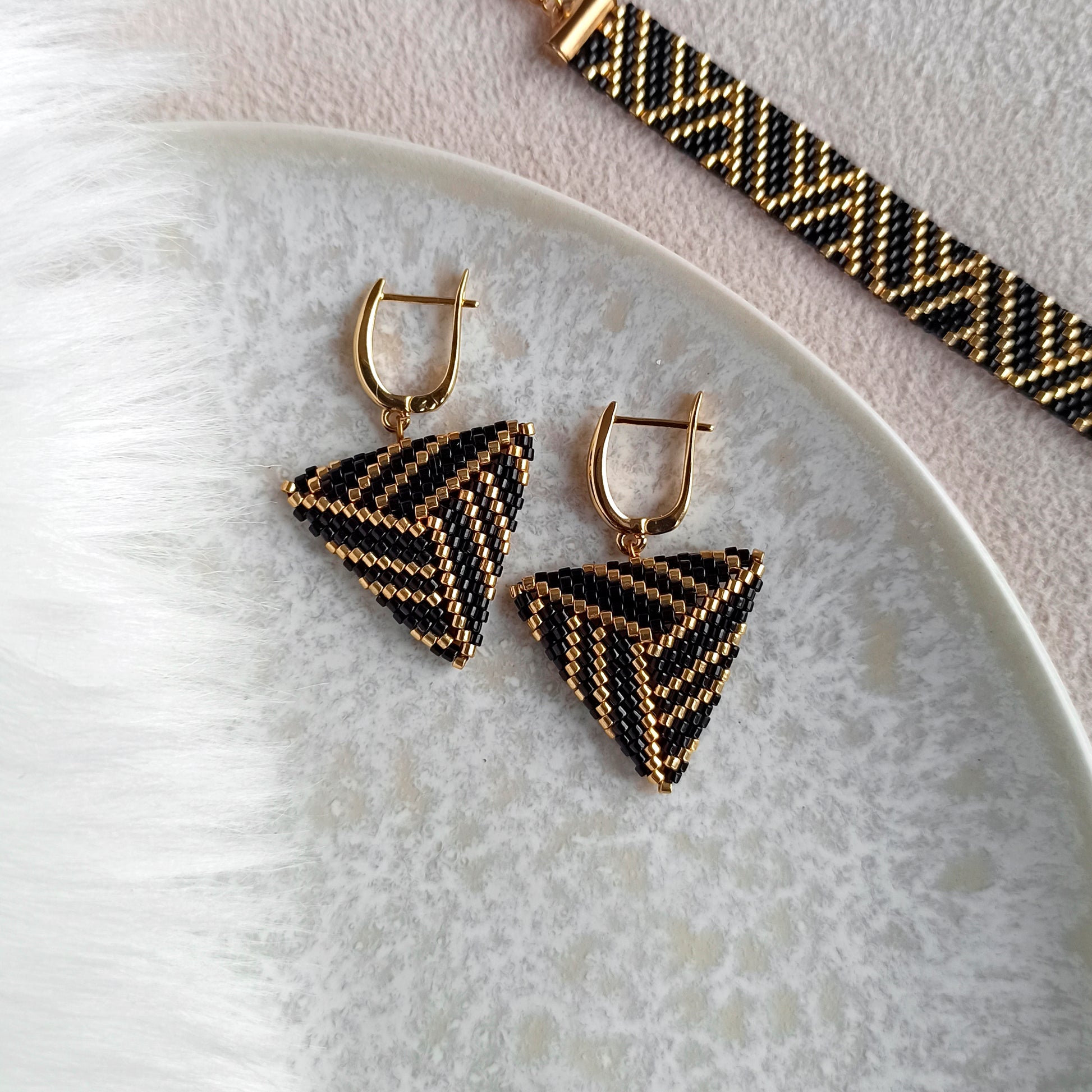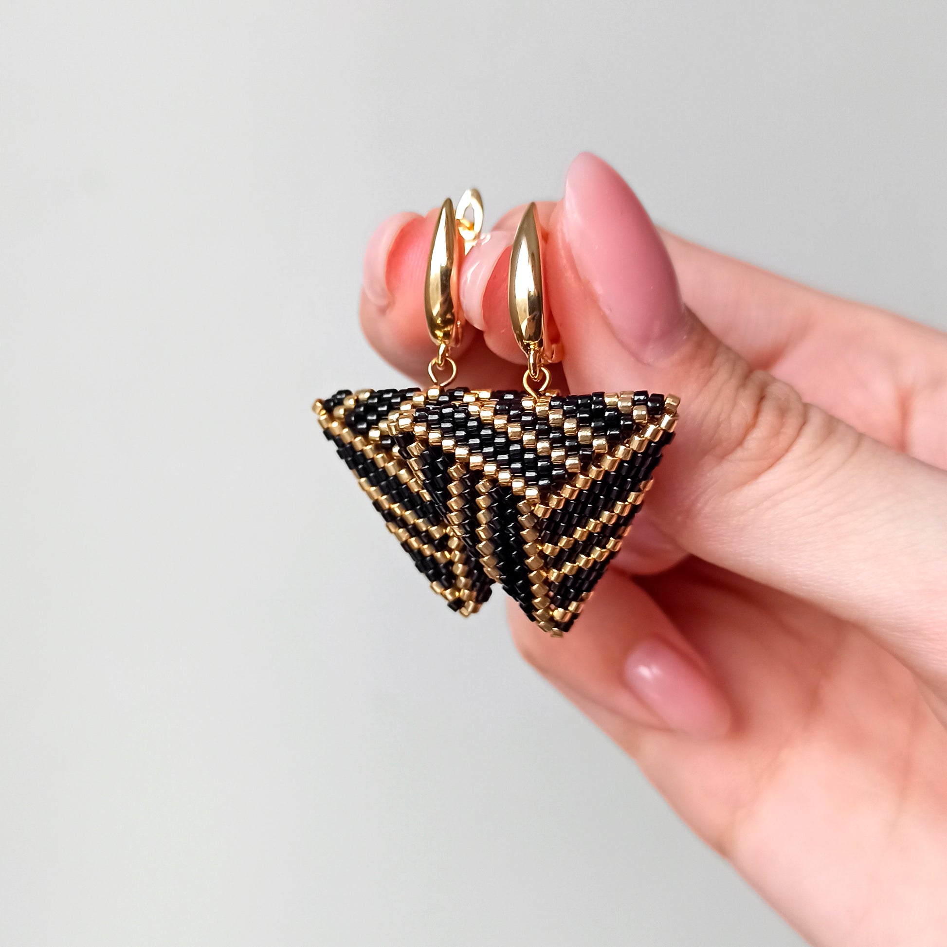 Ručně vyráběné trojúhelníkové náušnice z vysoce kvalitního japonského rokajlu v černo-zlaté nebo černo-stříbrné kombinaci.