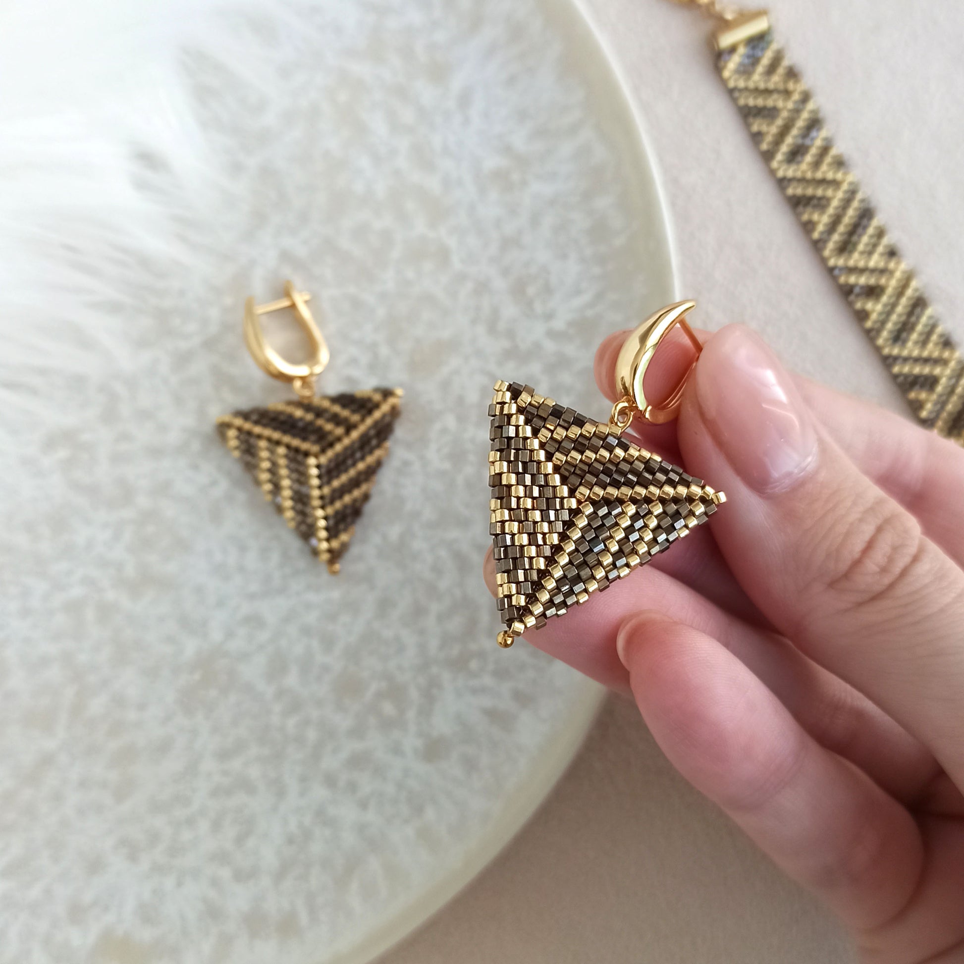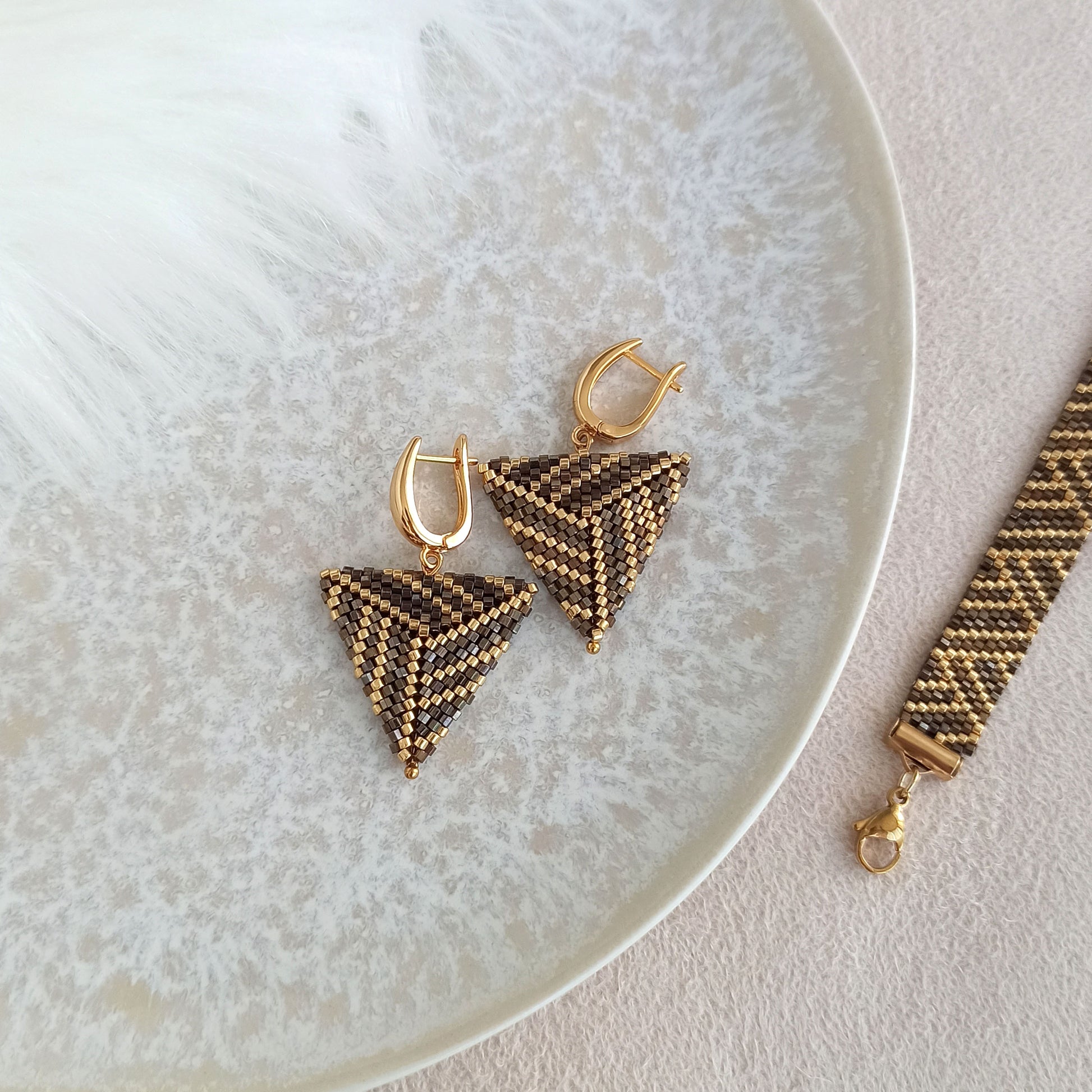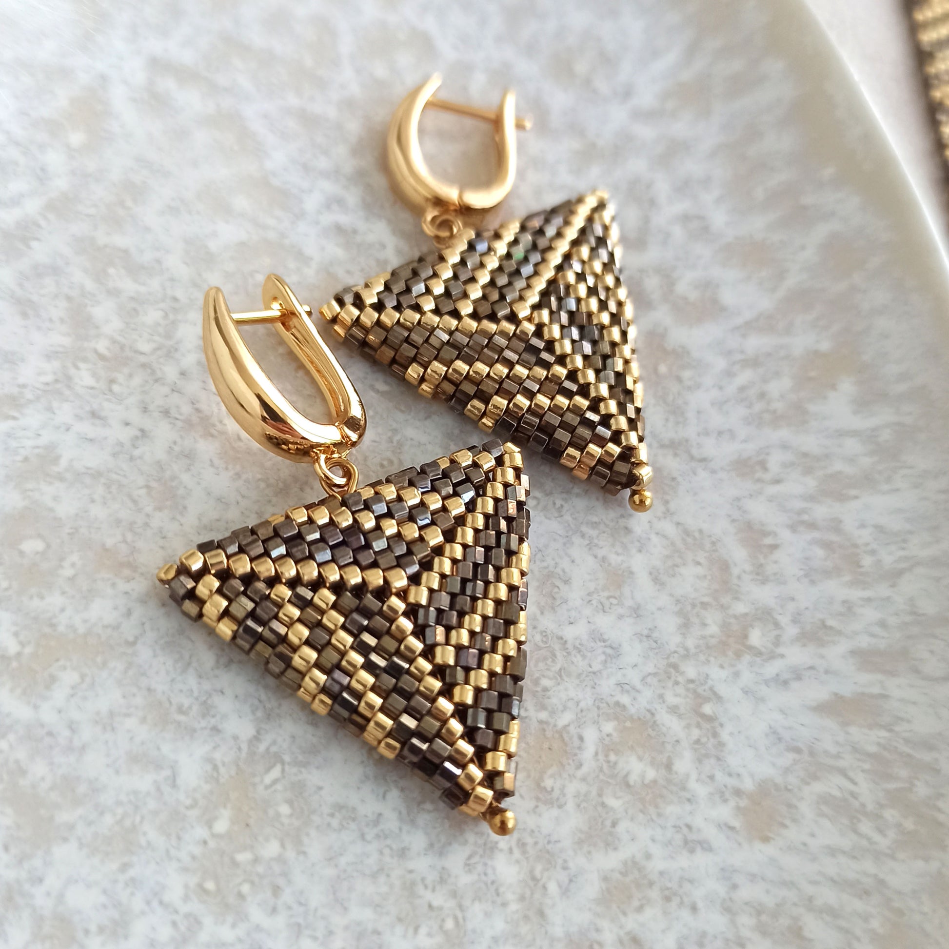 Ručně vyráběné trojúhelníkové náušnice z vysoce kvalitního japonského rokajlu v hnědo-zlaté kombinaci.